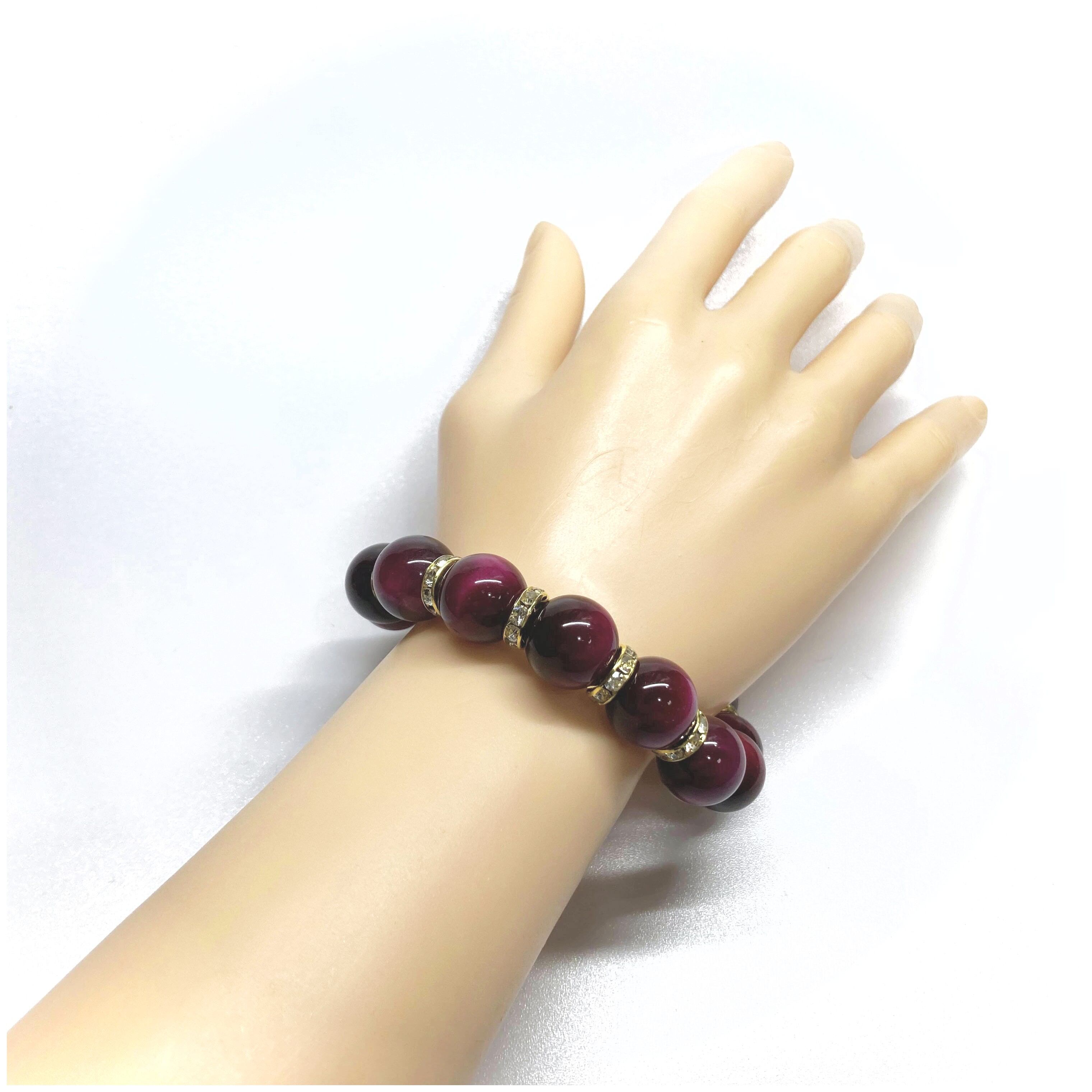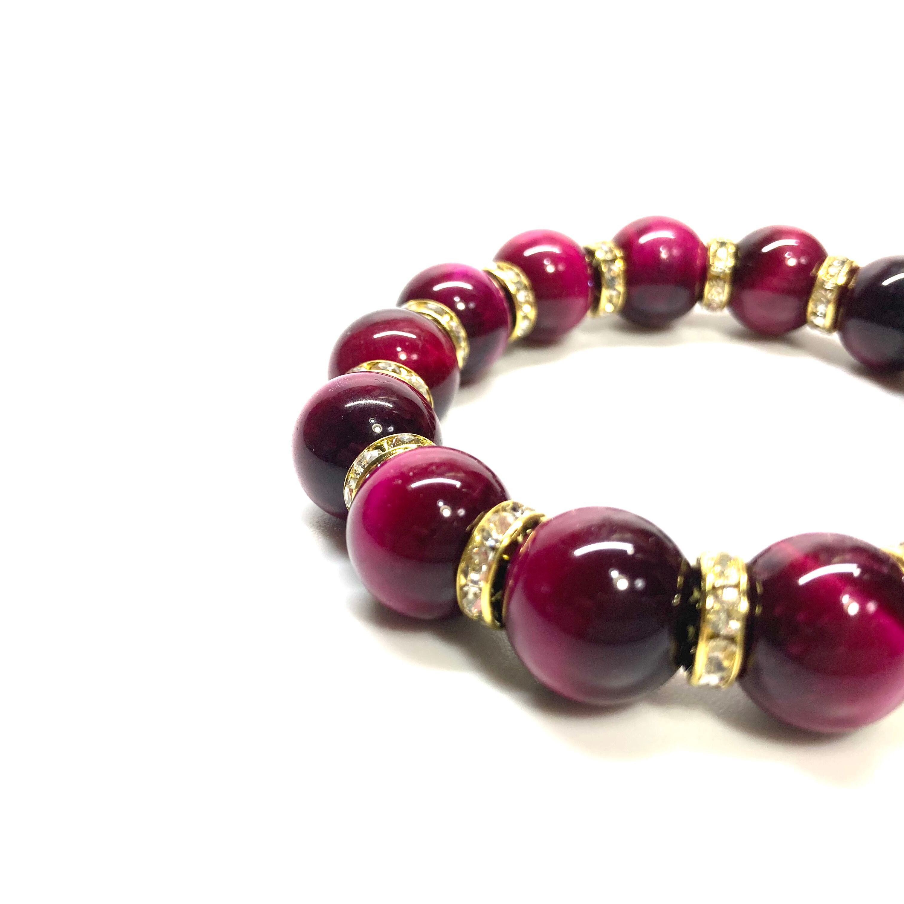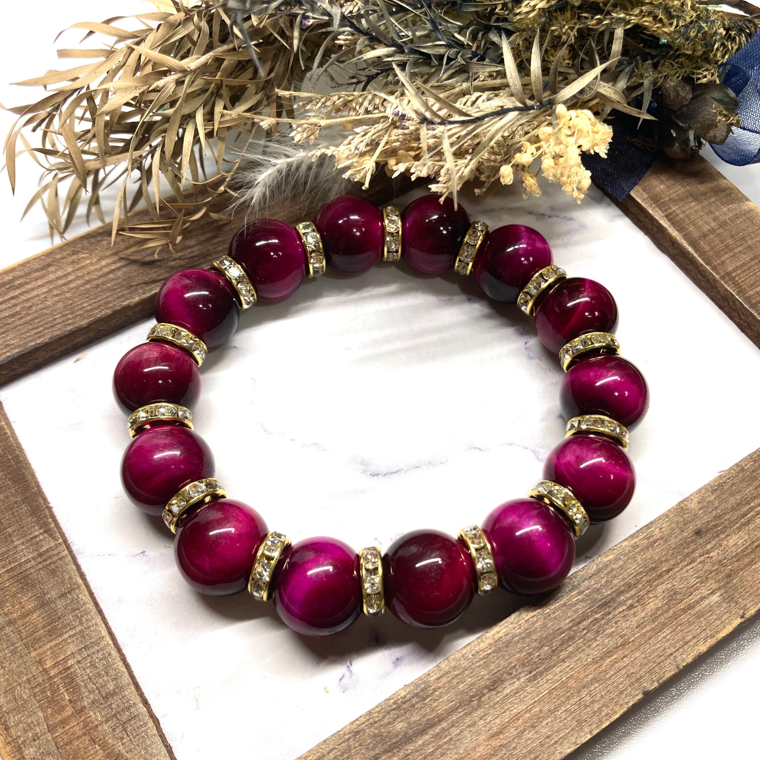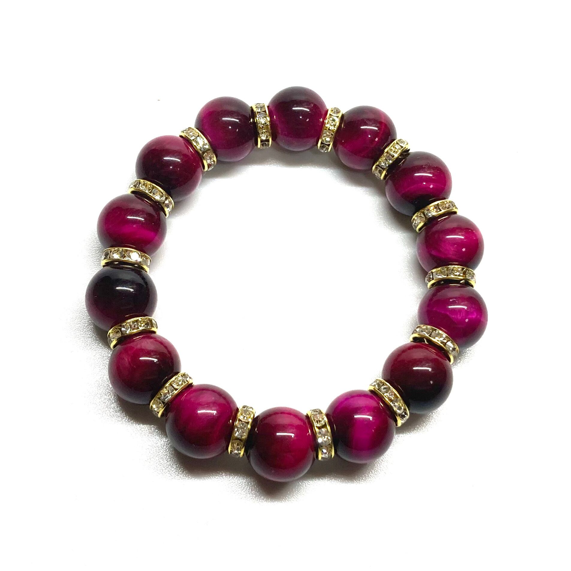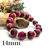 こちらは、14mm玉のピンクタイガーアイを使用したブレスレットです。シンプルなデザインですのでどんなコーディネートとも合わせ易いブレスレットです。石との間にはロンデルを挟み高級感を演出しています。石大きさはインパクトを与えてくれる大きさの14mm玉を使用しています。内周約17cmです。数に限りがございますので気になる方はお早めにどうぞ。