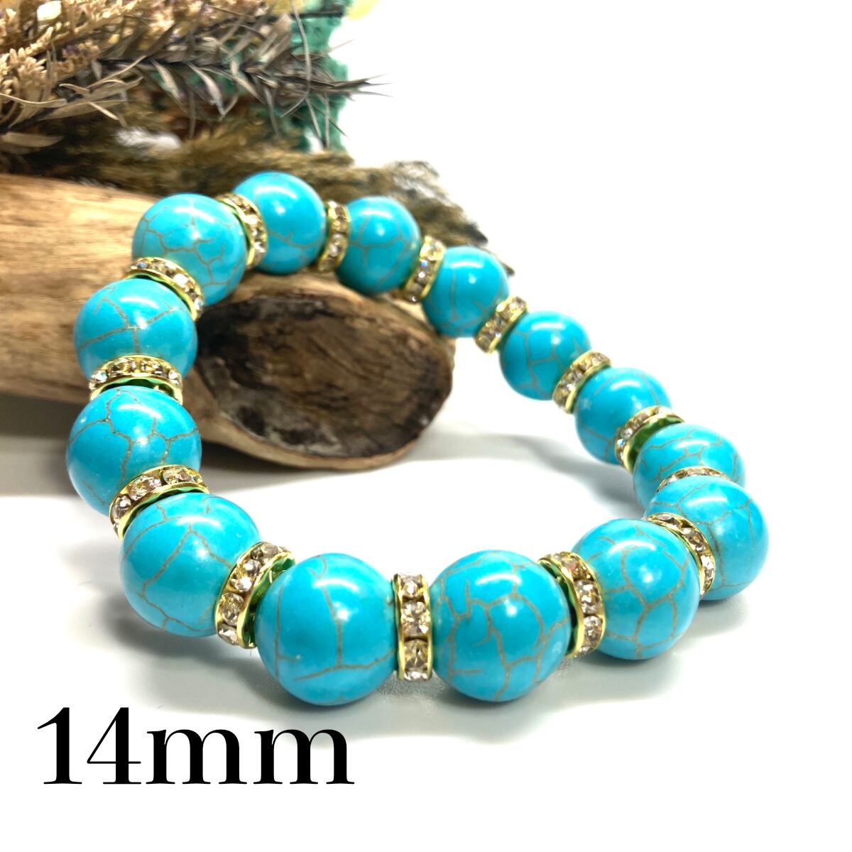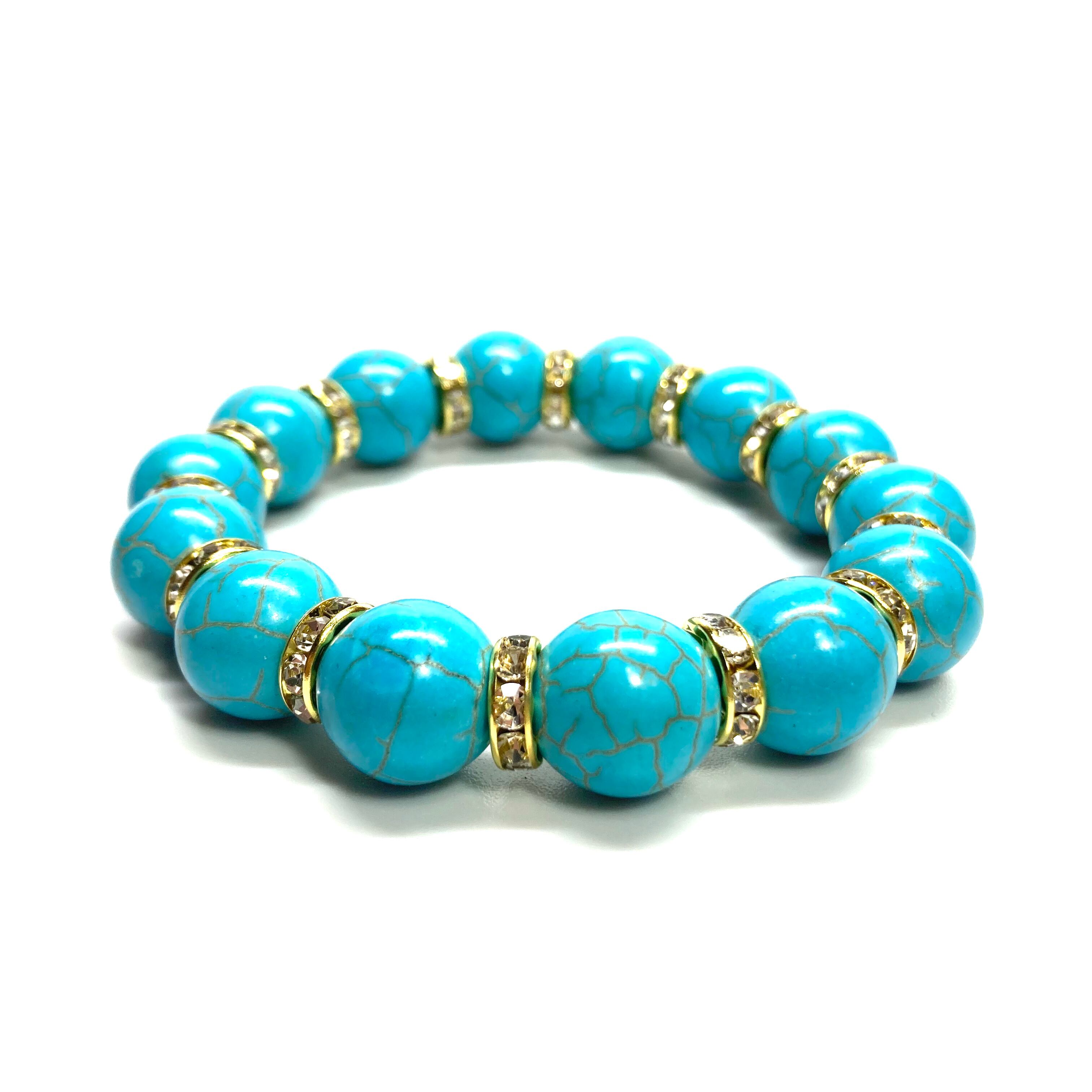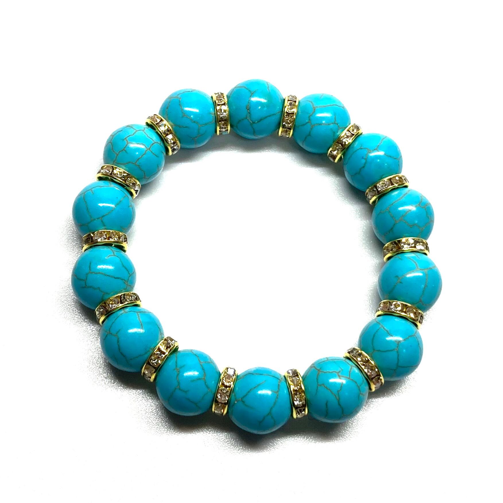 こちらは、14mm玉のターコイズを使用したブレスレットです。シンプルなデザインですのでどんなコーディネートとも合わせ易いブレスレットです。石との間にはロンデルを挟み高級感を演出しています。石大きさはインパクトを与えてくれる大きさの14mm玉を使用しています。内周約17cmです。数に限りがございますので気になる方はお早めにどうぞ。