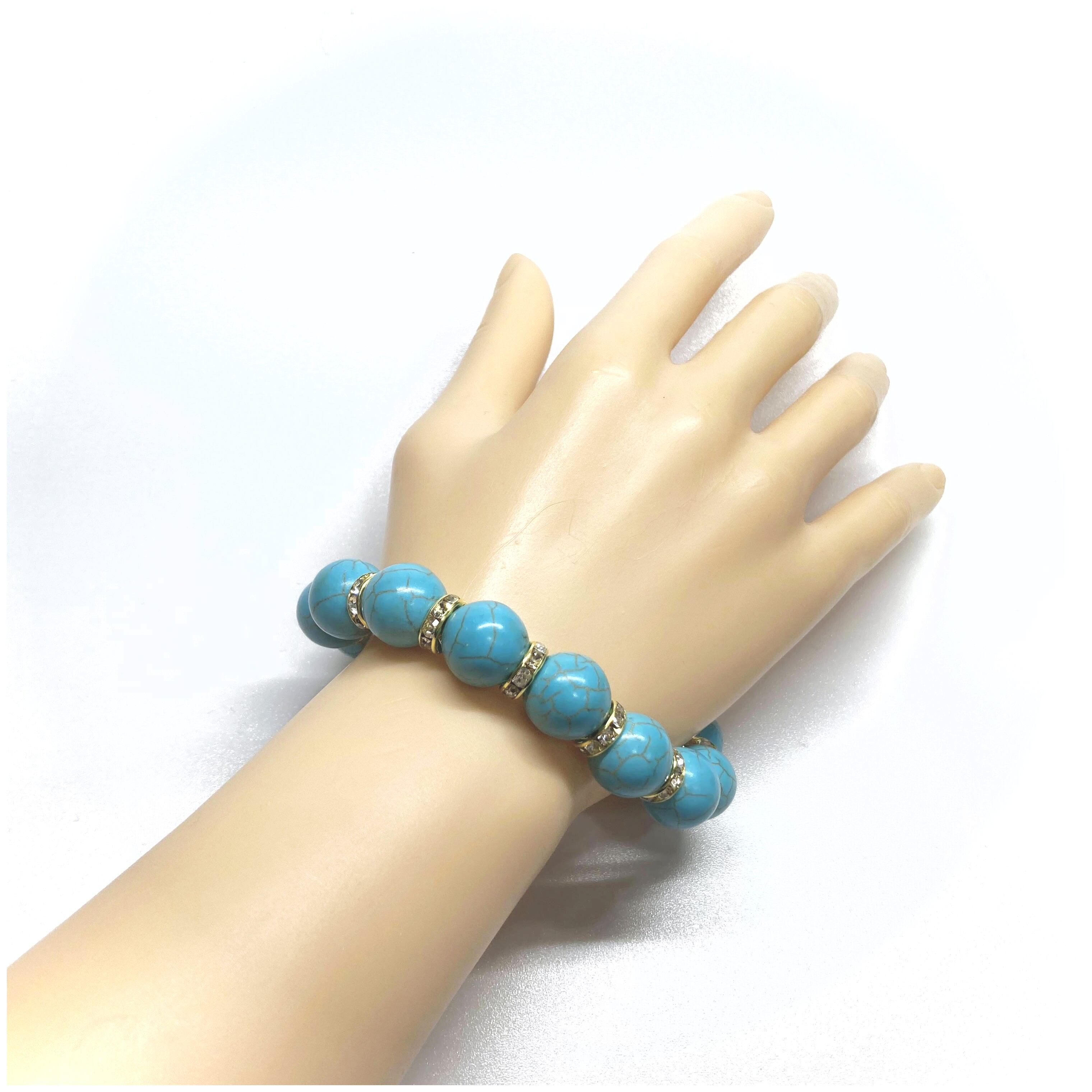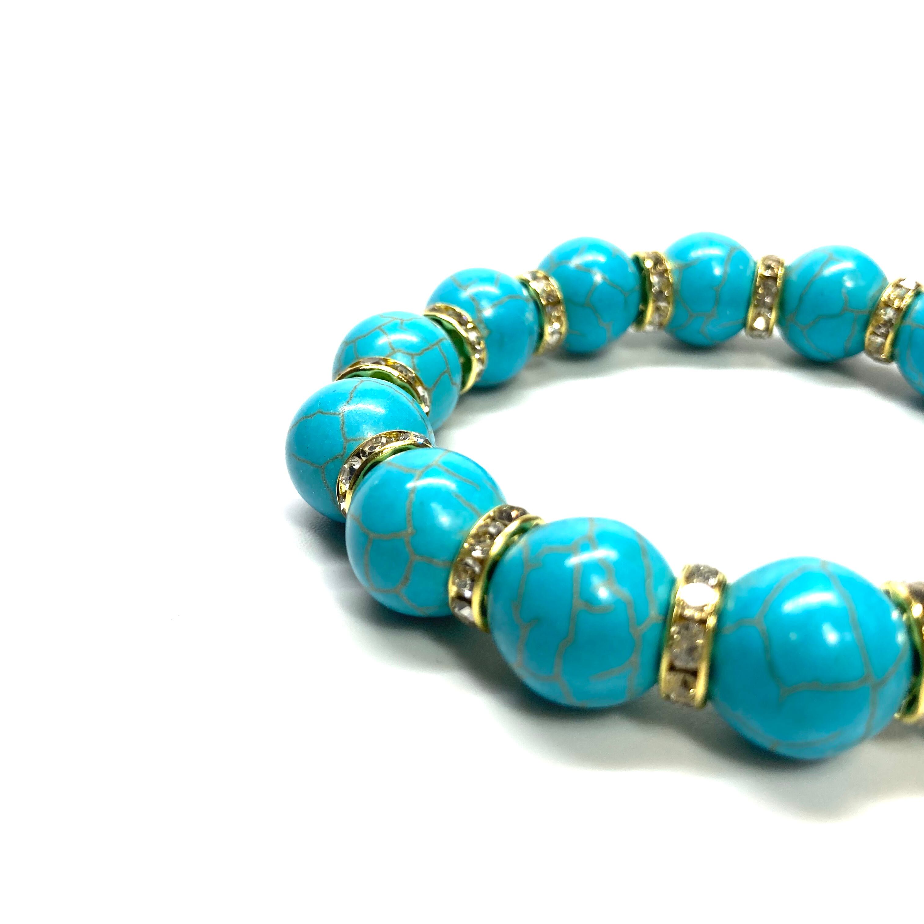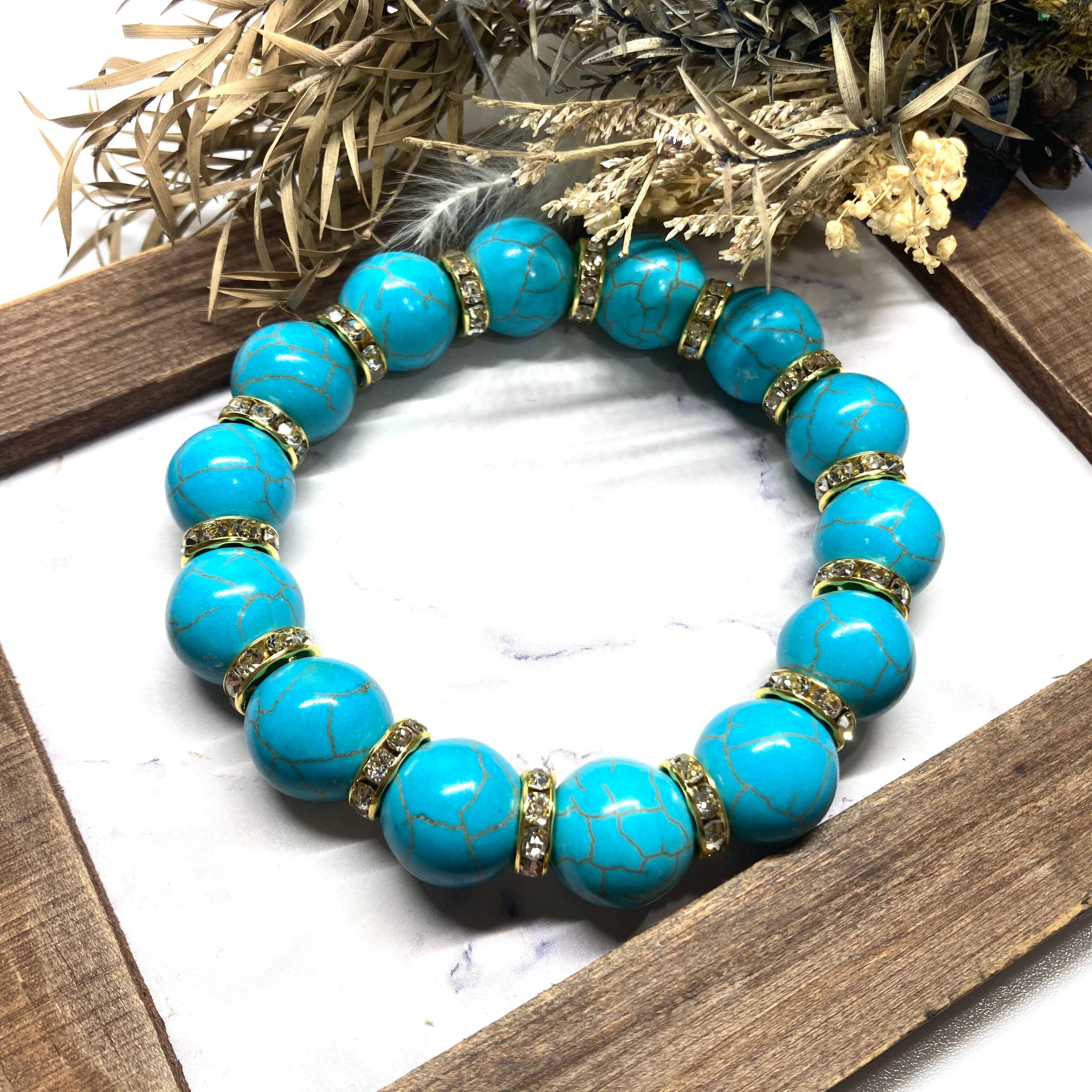 こちらは、14mm玉のターコイズを使用したブレスレットです。シンプルなデザインですのでどんなコーディネートとも合わせ易いブレスレットです。石との間にはロンデルを挟み高級感を演出しています。石大きさはインパクトを与えてくれる大きさの14mm玉を使用しています。内周約17cmです。数に限りがございますので気になる方はお早めにどうぞ。