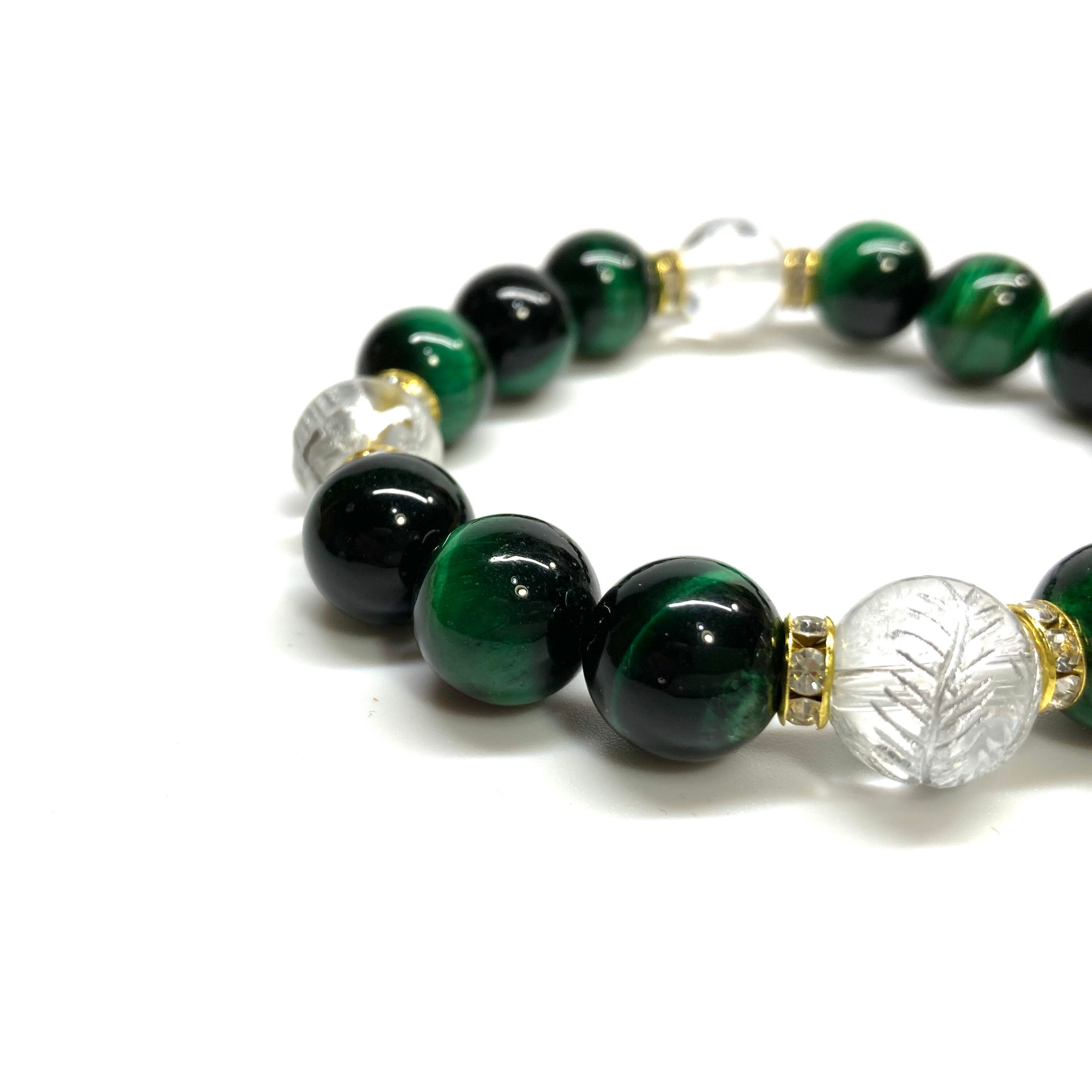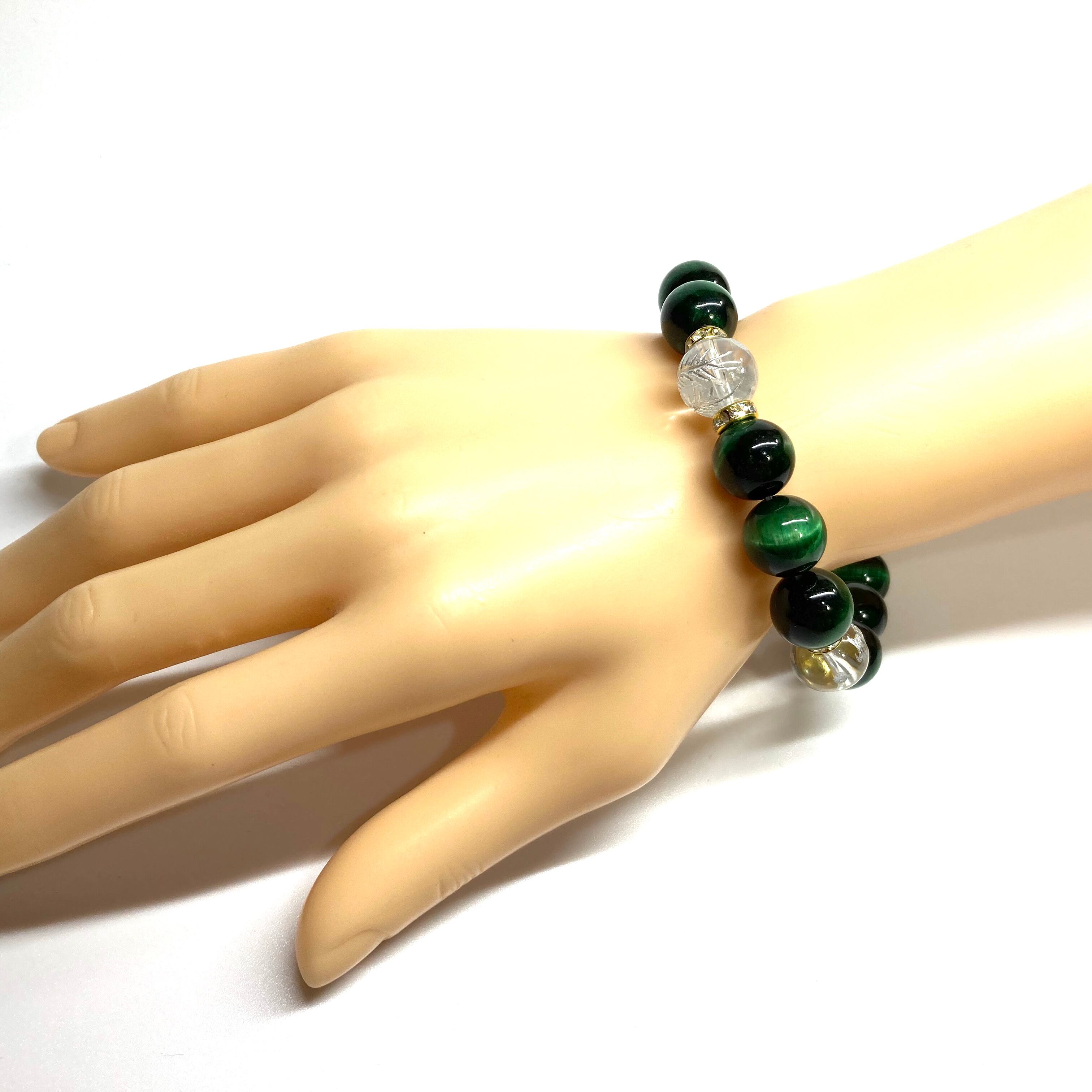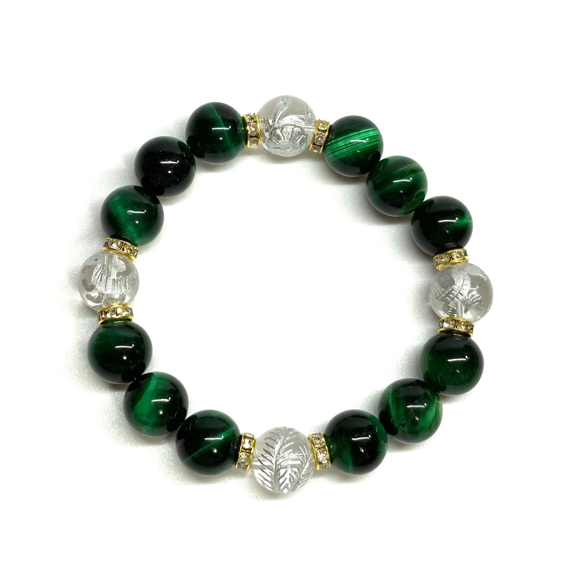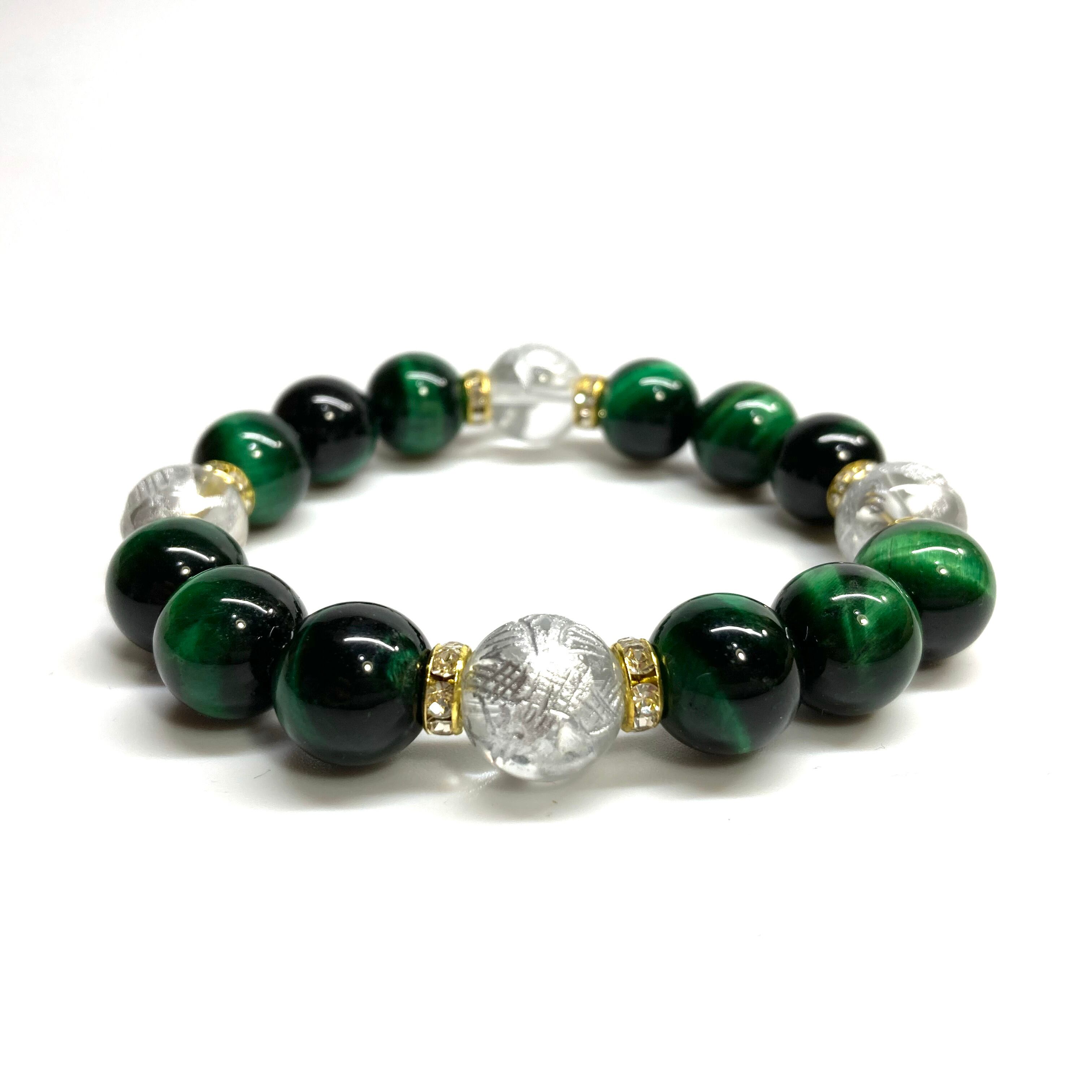 12mm 四神獣銀彫水晶×グリーンタイガーアイ パワーストーン ブレスレット天然石 運気上昇 金運 健康運 お守り 青龍 白虎 玄武 朱雀 (ゴールド)メンズ・レディース 男性・女性 数珠ブレス 開運 ☆