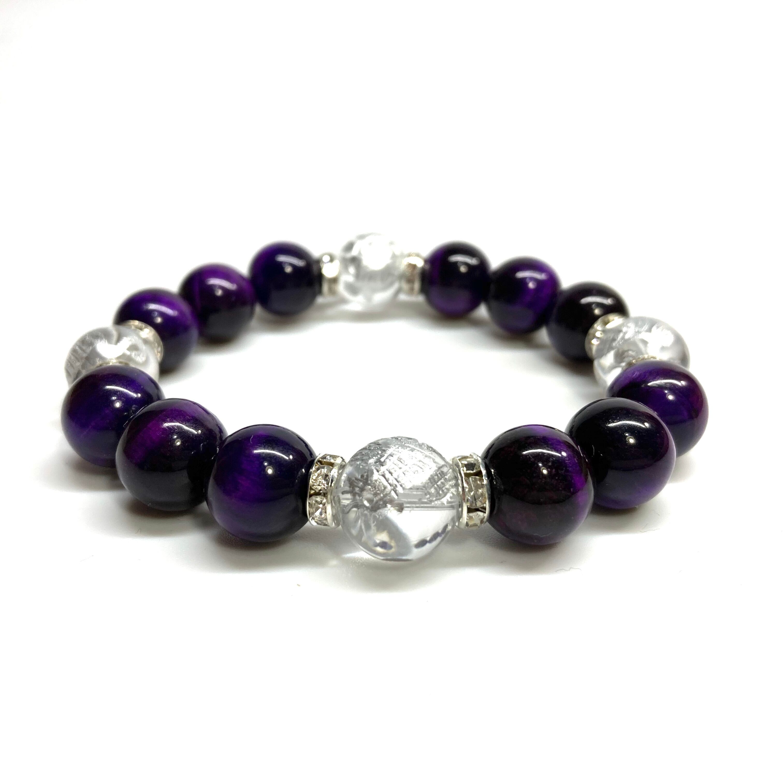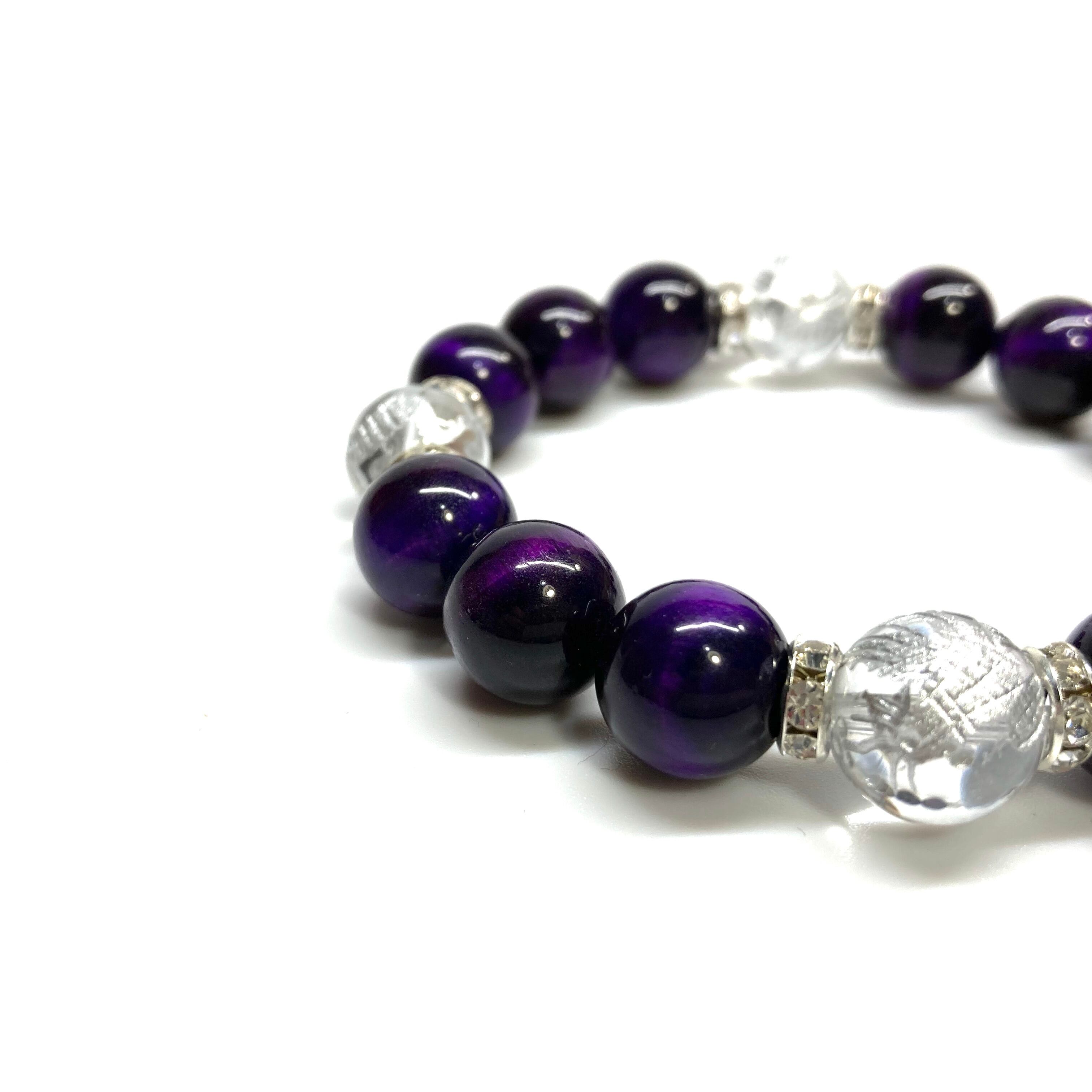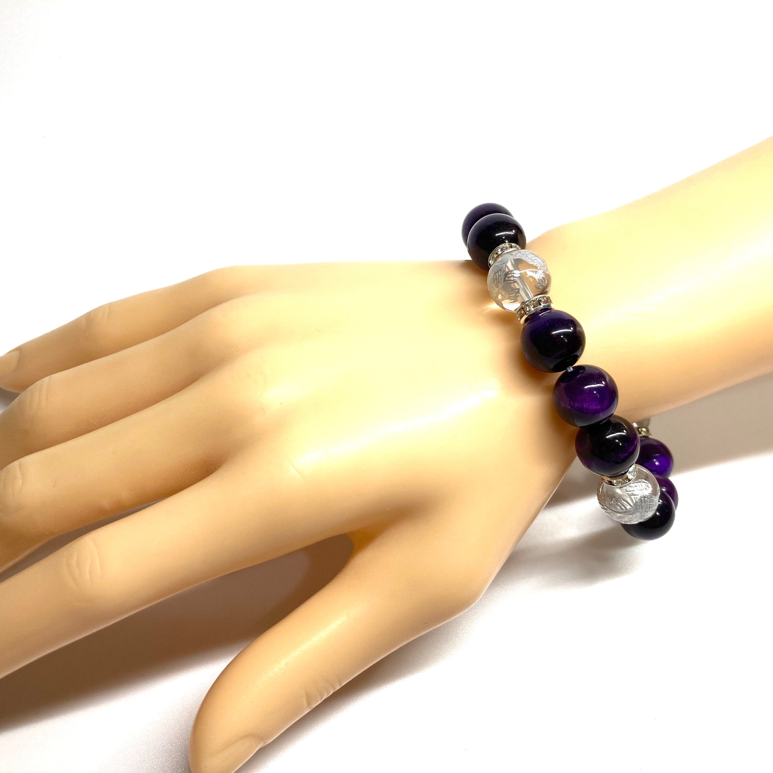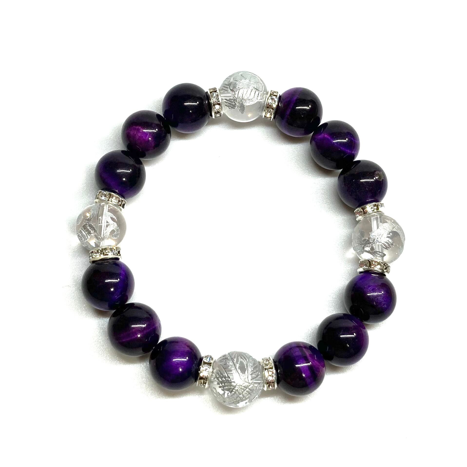12mm 四神獣銀彫水晶×パープルタイガーアイ パワーストーン ブレスレット天然石 運気上昇 金運 健康運 お守り 青龍 白虎 玄武 朱雀 (シルバー)メンズ・レディース 男性・女性 数珠ブレス 開運 ☆ | パワーストーン 天然石 Kinari&Co.