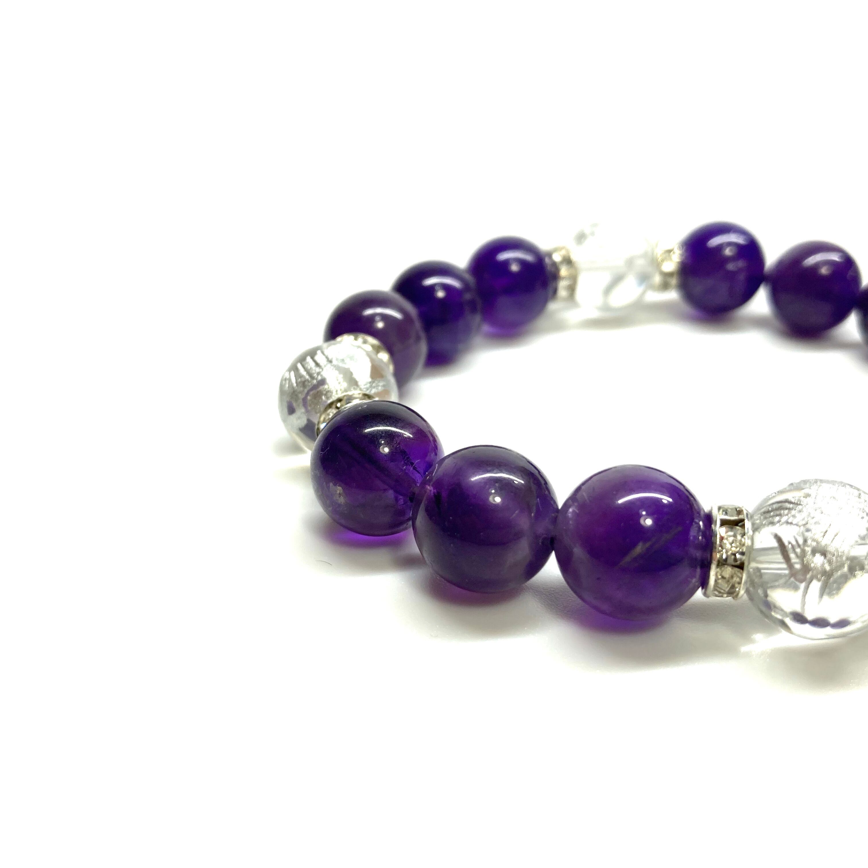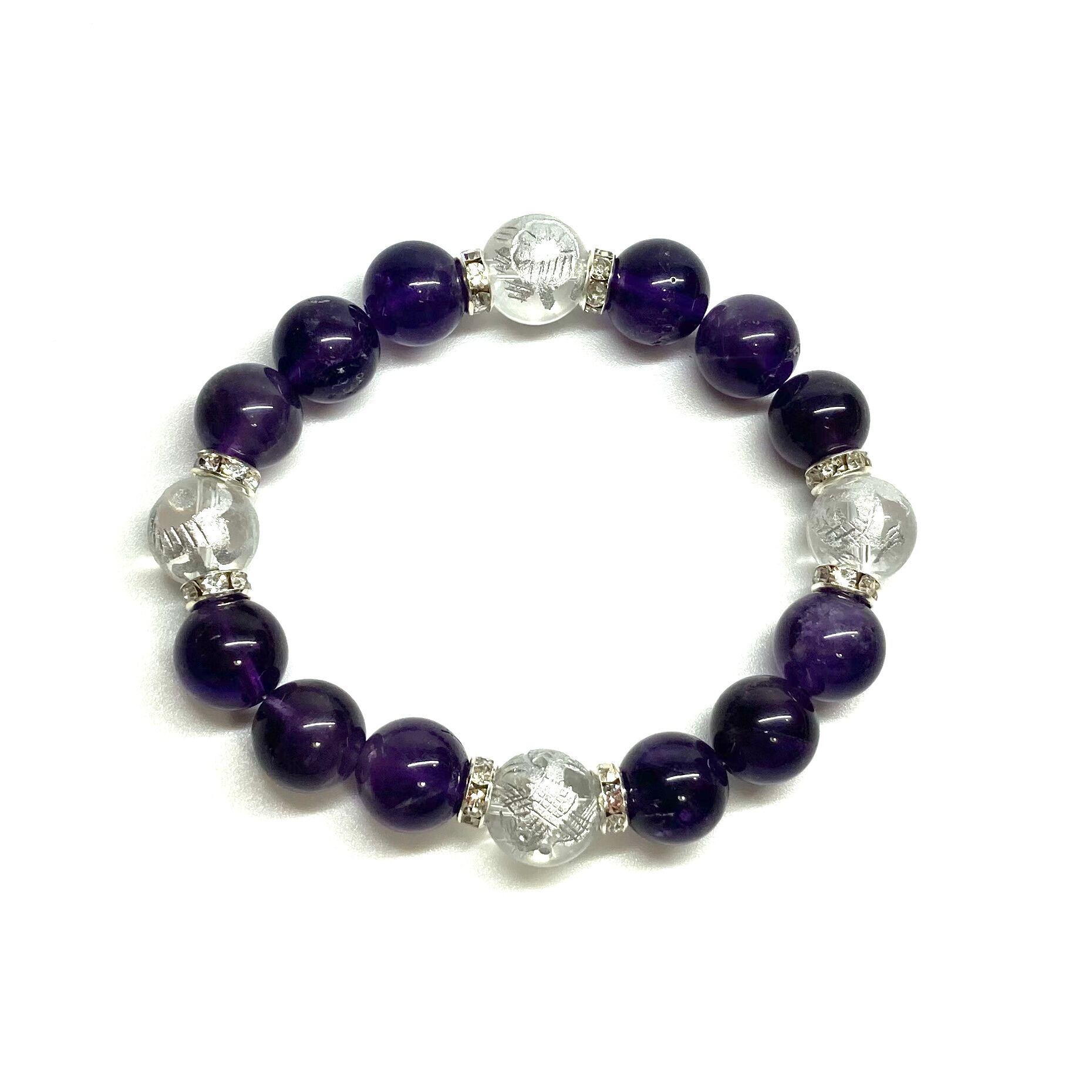 12mm 四神獣銀彫水晶×アメジスト パワーストーン ブレスレット天然石 運気上昇 開運 ☆ 恋愛運 お守り 青龍 白虎 玄武 朱雀 2月誕生石 (シルバー)メンズ・レディース 男性・女性 数珠ブレス 開運 ☆ | パワーストーン 天然石 Kinari&Co.