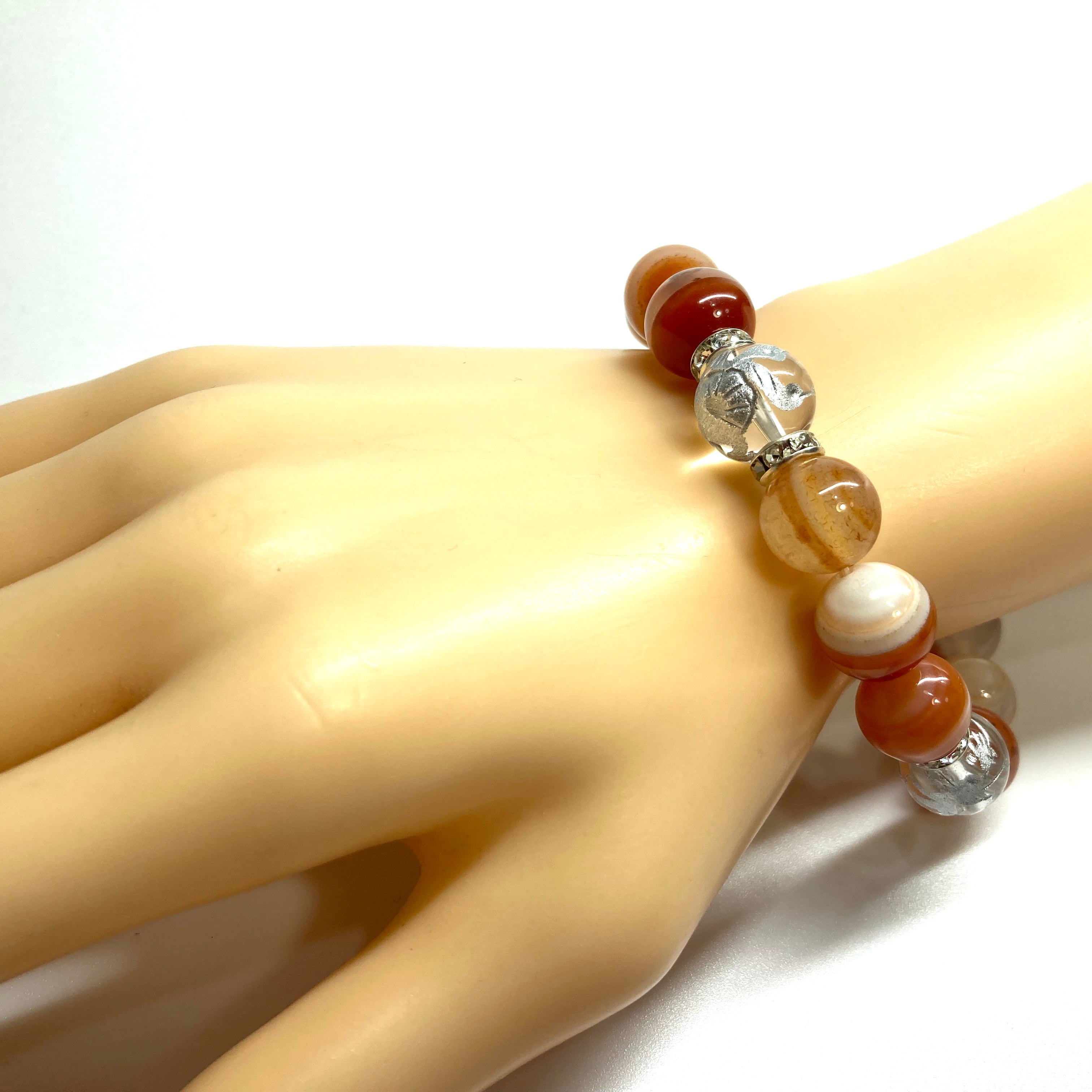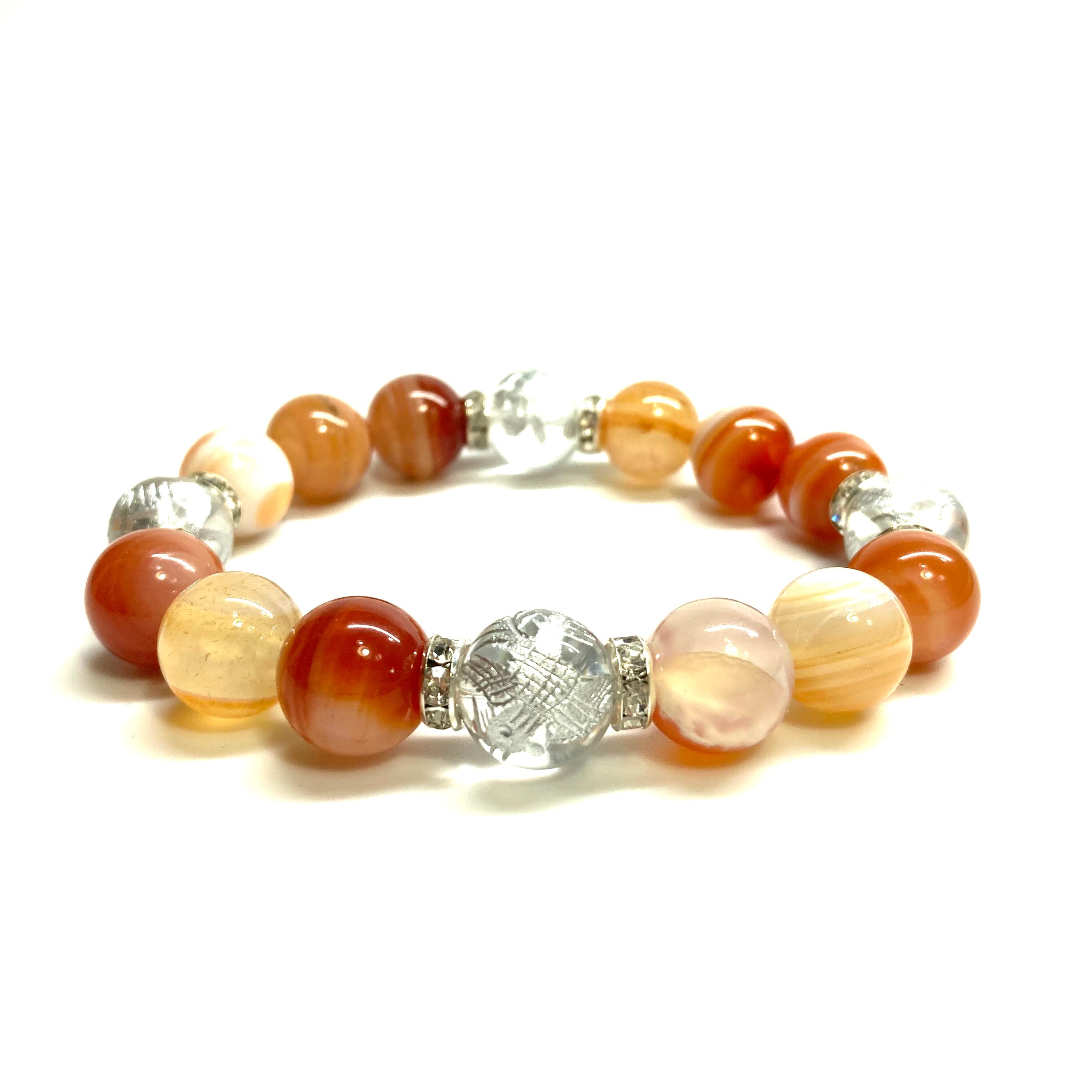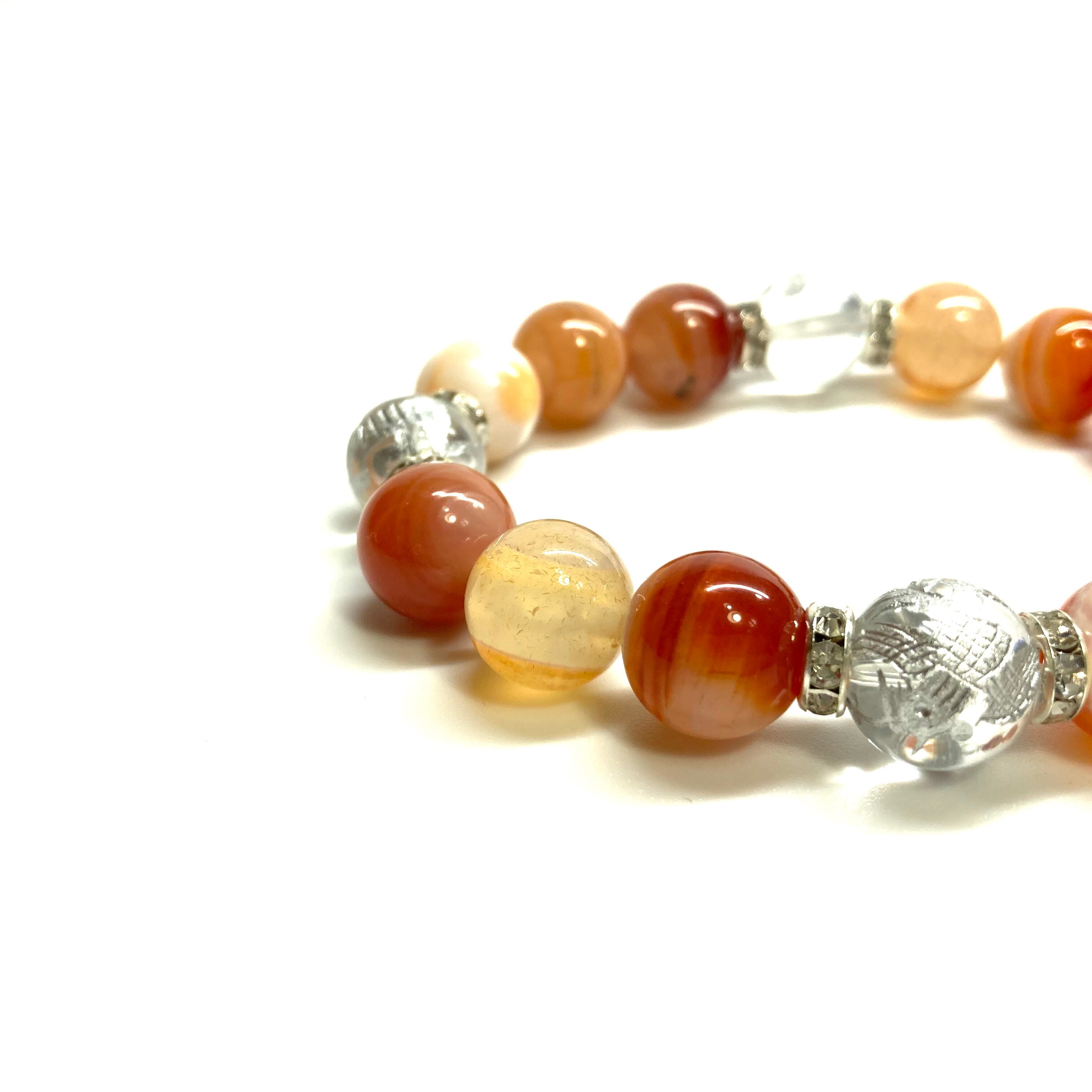 ご覧頂いているブレスレットは、四神獣銀彫水晶とカーネリアン・サードニクス(レッド天眼石)を組み合わせたブレスレット。守り神である四神とパワーストーンの組み合わせで運気の流れを引き寄せる強運ブレスレットです。シンプルなデザインで男女問わず、年齢問わずご使用頂けるデザインなっております。シンプルなデザインは日常のアクセントとして、仕事やビジネスカジュアル、パーティーや特別なイベントなど様々なシーン活用できます。また、ちょっと贈り物にも最適なブレスレットになっております。四神獣を身につけて厄災から身を守り、多くの運気を呼び込まれてください。