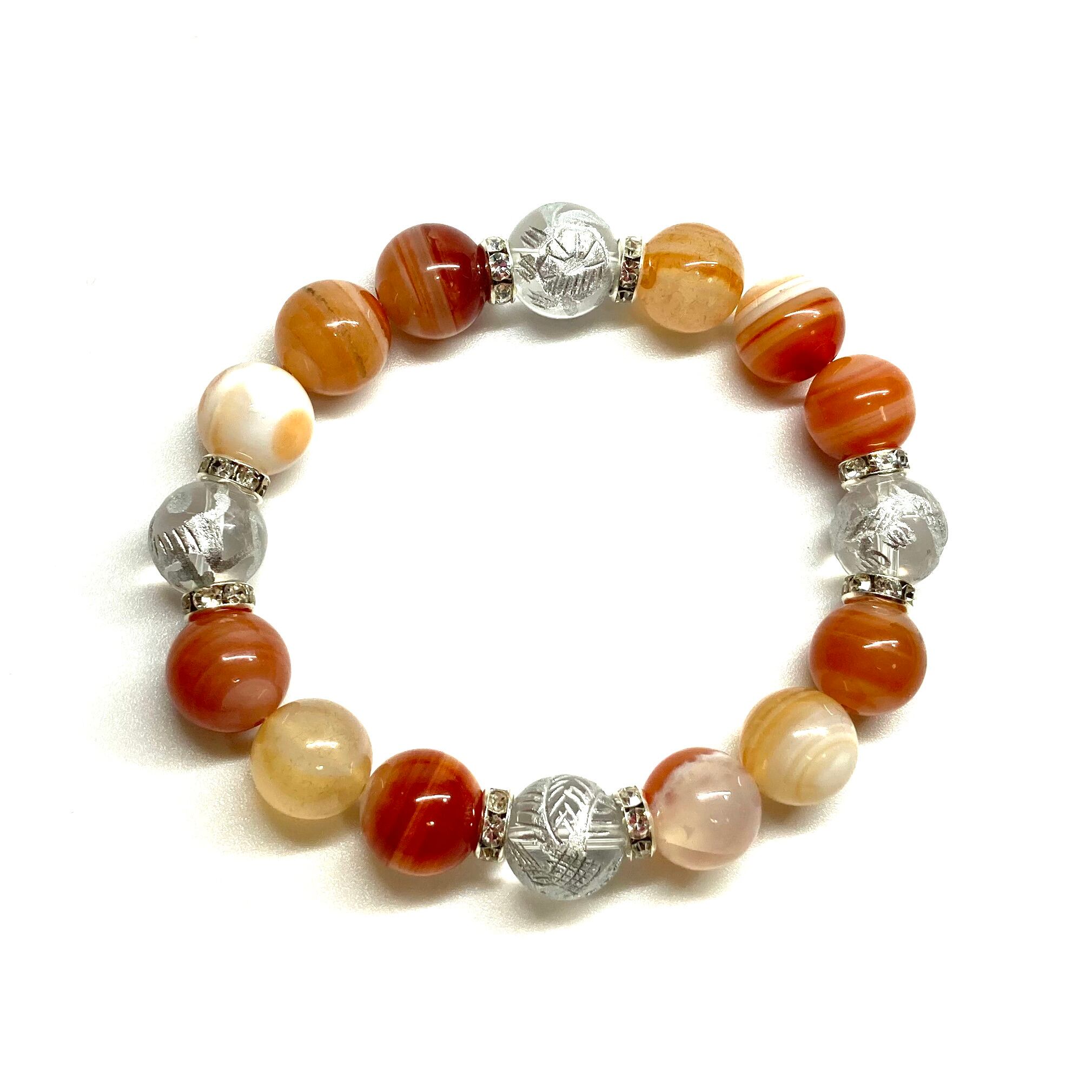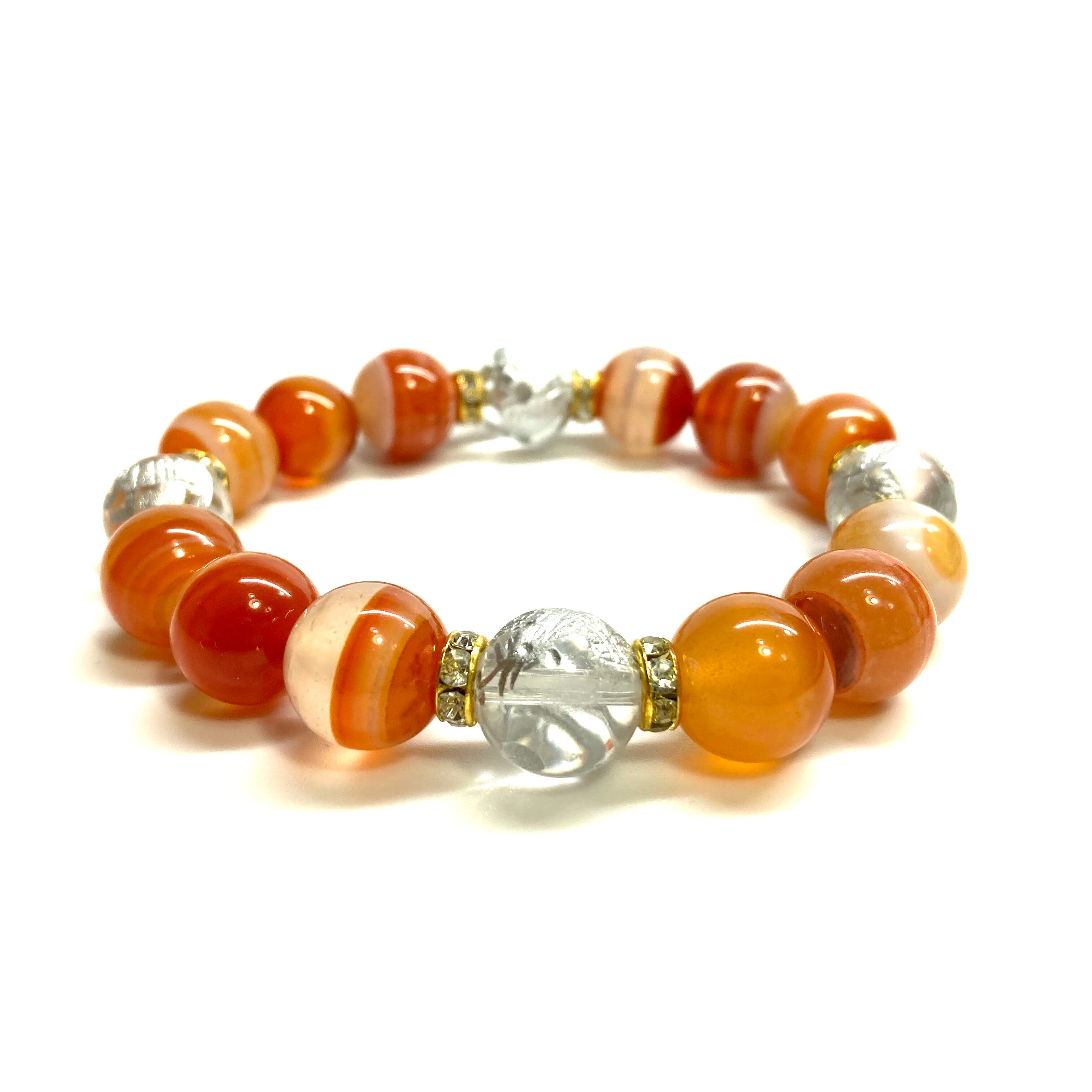 ご覧頂いているブレスレットは、四神獣銀彫水晶とカーネリアン・サードニクス(レッド天眼石)を組み合わせたブレスレット。守り神である四神とパワーストーンの組み合わせで運気の流れを引き寄せる強運ブレスレットです。シンプルなデザインで男女問わず、年齢問わずご使用頂けるデザインなっております。シンプルなデザインは日常のアクセントとして、仕事やビジネスカジュアル、パーティーや特別なイベントなど様々なシーン活用できます。また、ちょっと贈り物にも最適なブレスレットになっております。四神獣を身につけて厄災から身を守り、多くの運気を呼び込まれてください。