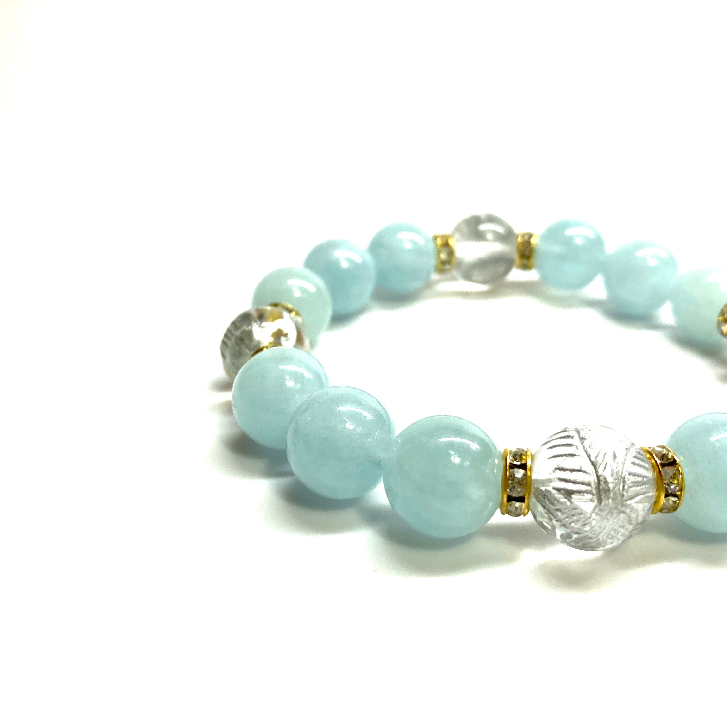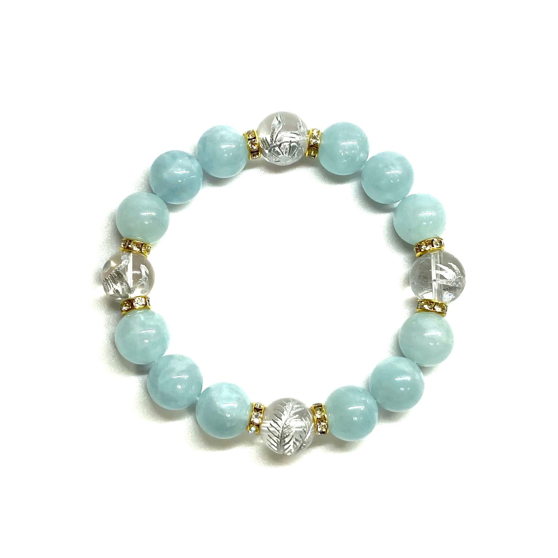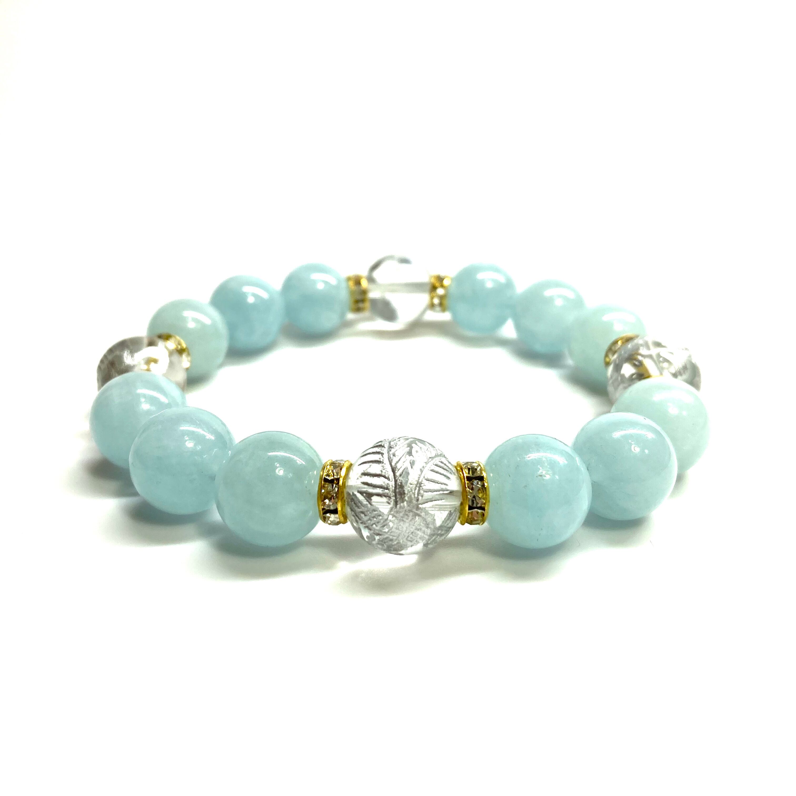 12mm 四神獣銀彫水晶×アクアマリン パワーストーン ブレスレット天然石 運気上昇 開運 ☆ 金運 お守り 青龍 白虎 玄武 朱雀 3月誕生石 (ゴールド)メンズ・レディース 男性・女性 数珠ブレス 開運 ☆