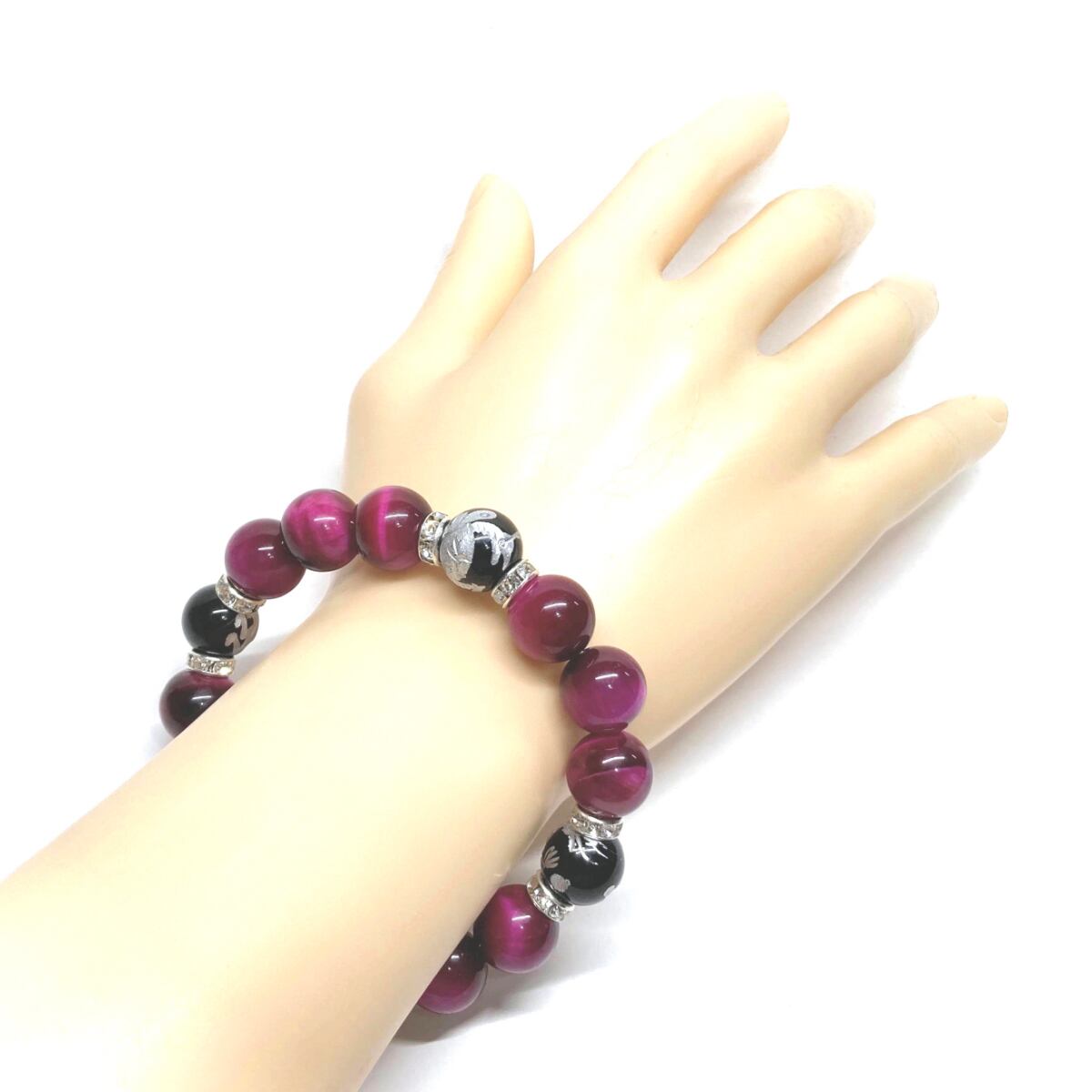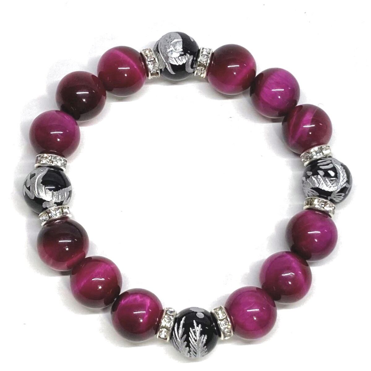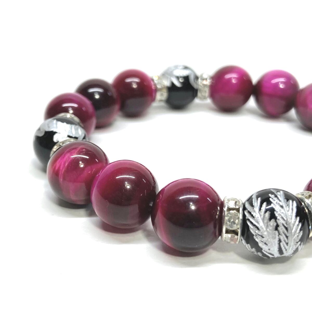 12mm 四神獣銀彫オニキス×ピンクタイガーアイ パワーストーン ブレスレット天然石 運気上昇 開運 ☆ 恋愛運 お守り 青龍 白虎 玄武 朱雀 (シルバー)メンズ・レディース 男性・女性 数珠ブレス 開運 ☆