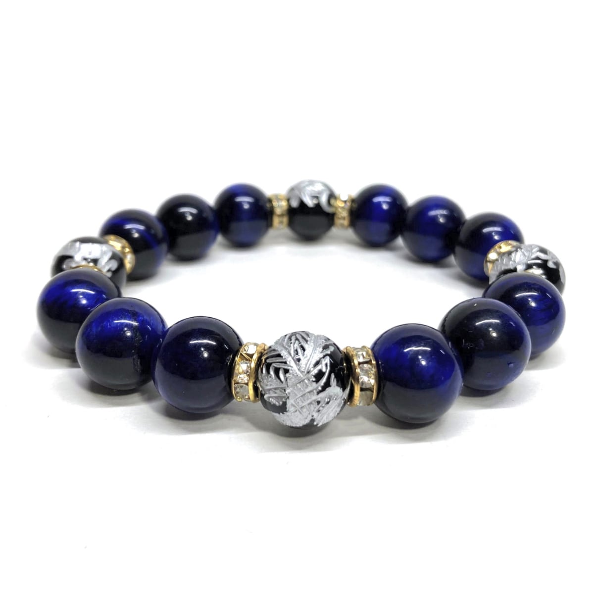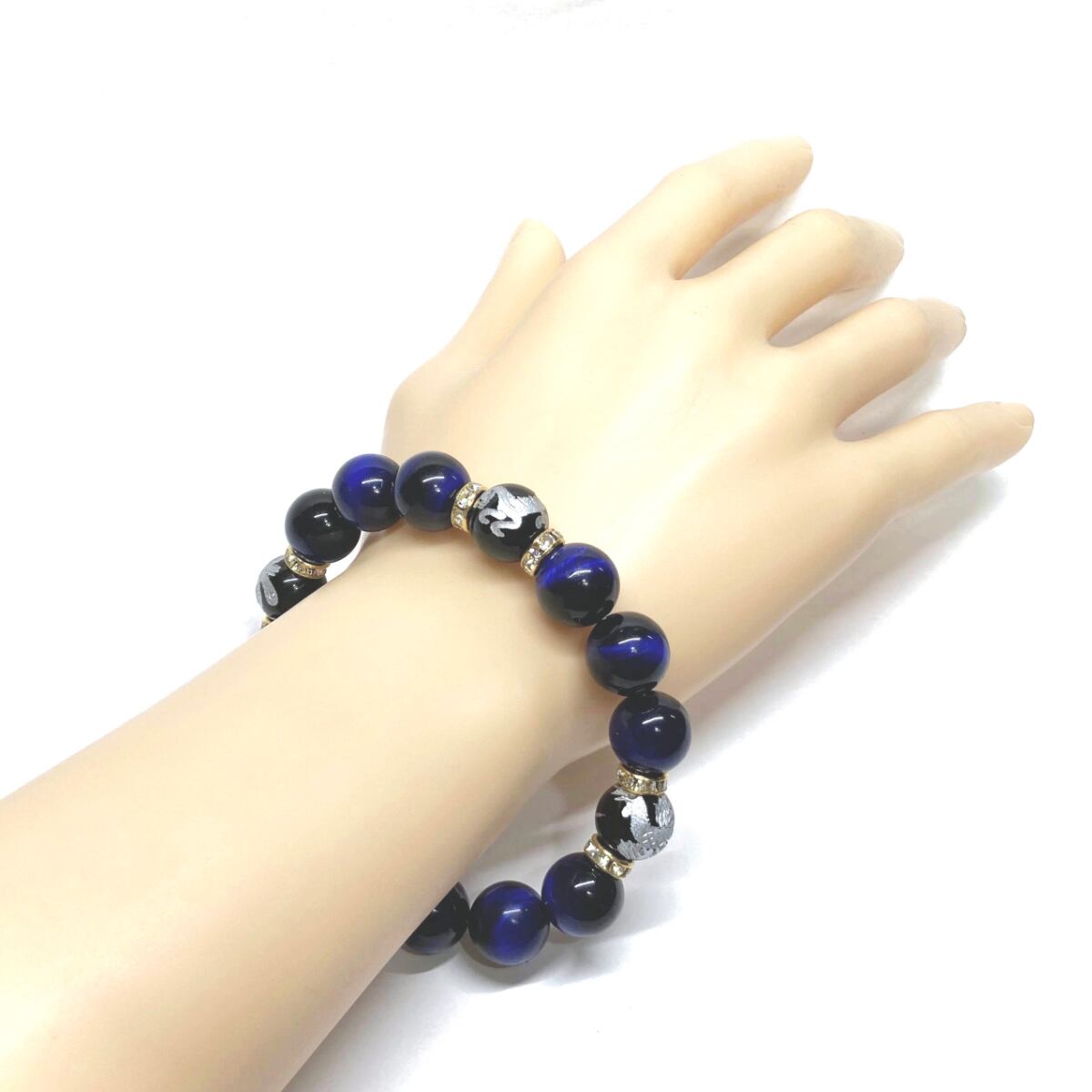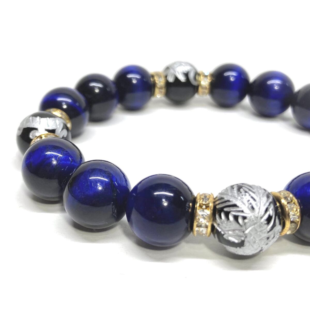 12mm 四神獣銀彫オニキス×ブルータイガーアイ パワーストーン ブレスレット天然石 運気上昇 金運 開運 ☆ お守り 青龍 白虎 玄武 朱雀 (ゴールド)メンズ・レディース 男性・女性 数珠ブレス 開運 ☆ | パワーストーン 天然石 Kinari&Co.