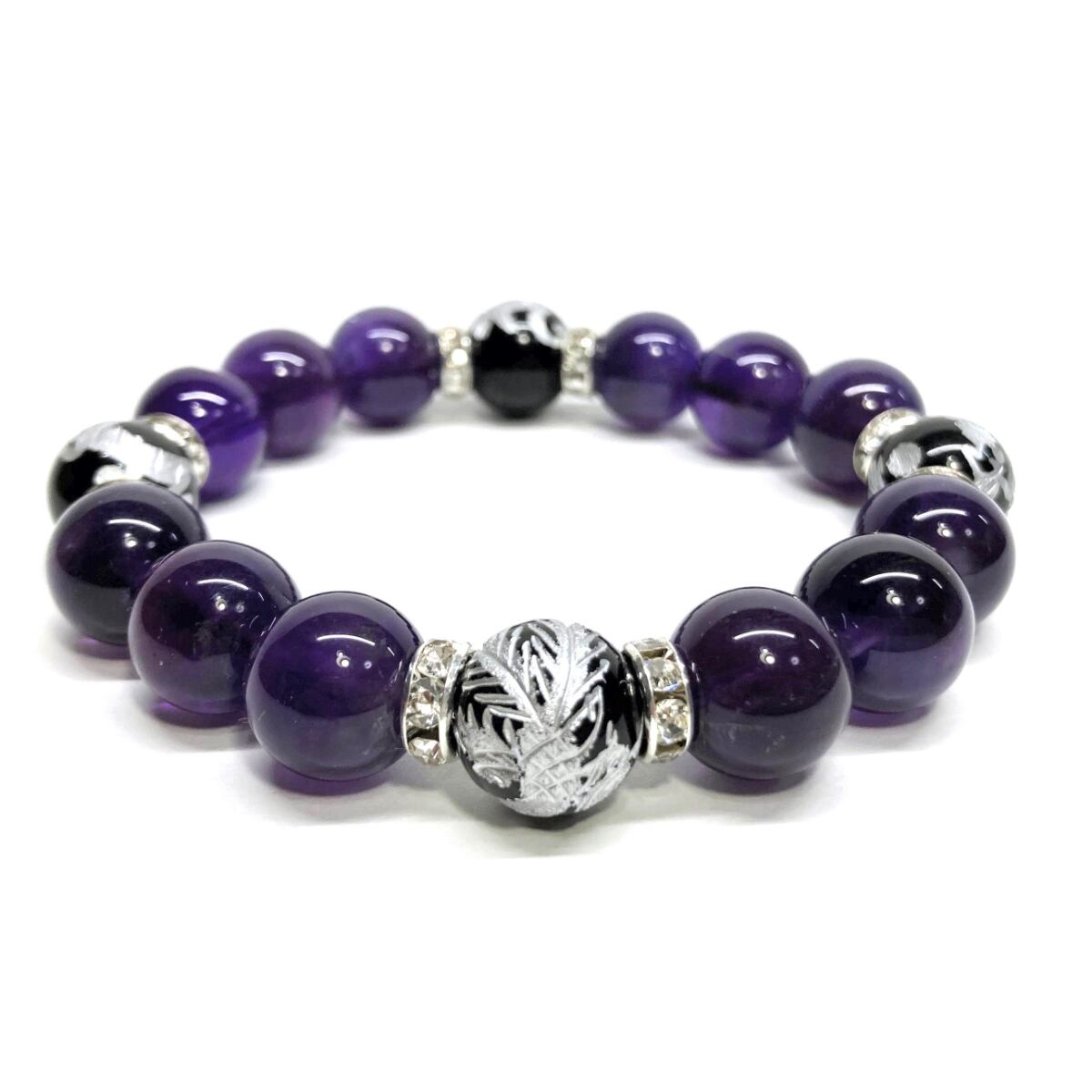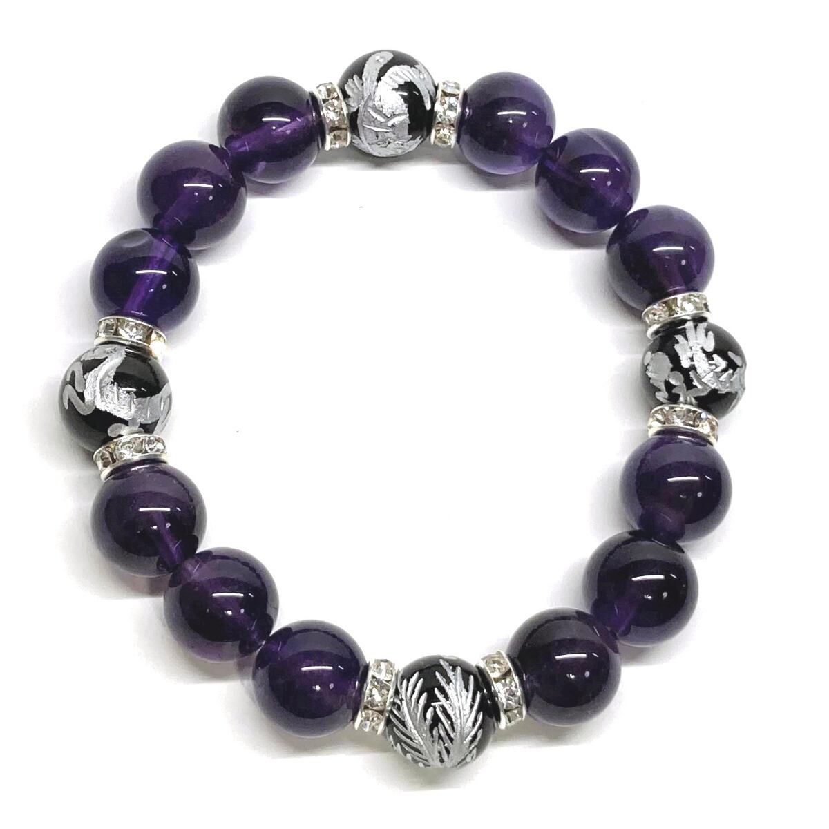12mm 四神獣銀彫オニキス×アメジスト パワーストーン ブレスレット天然石 運気上昇 開運 ☆ 恋愛運 お守り 青龍 白虎 玄武 朱雀 2月誕生石 (シルバー)メンズ・レディース 男性・女性 数珠ブレス 開運 ☆ | パワーストーン 天然石 Kinari&Co.