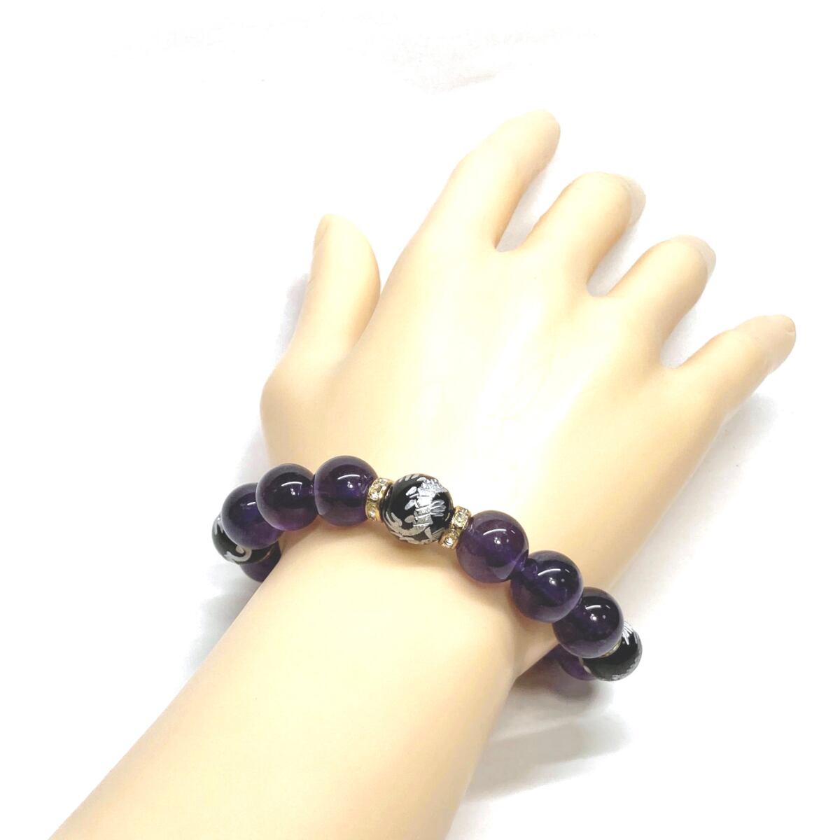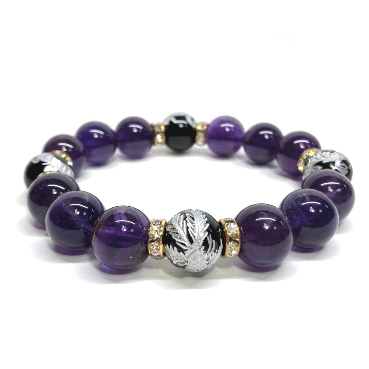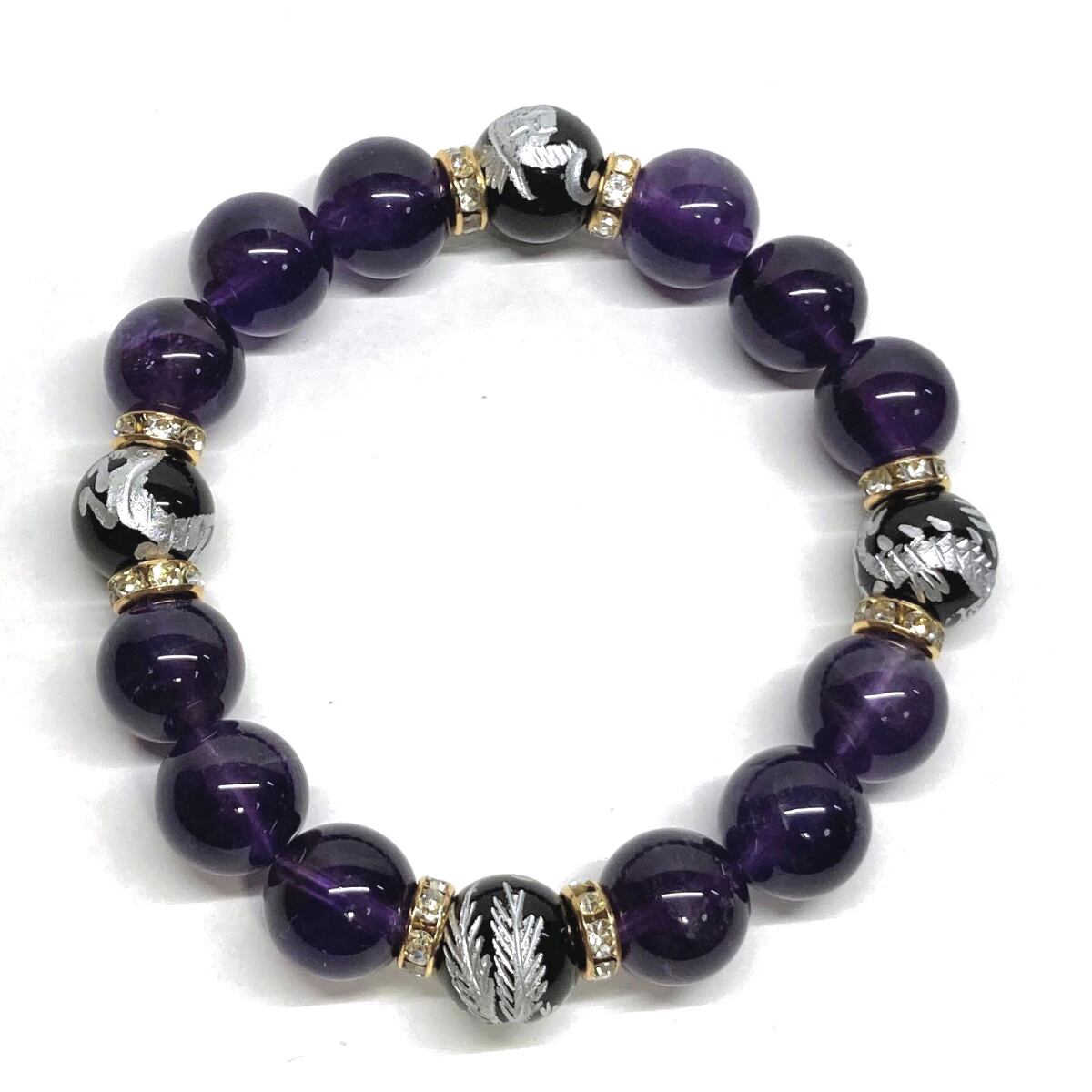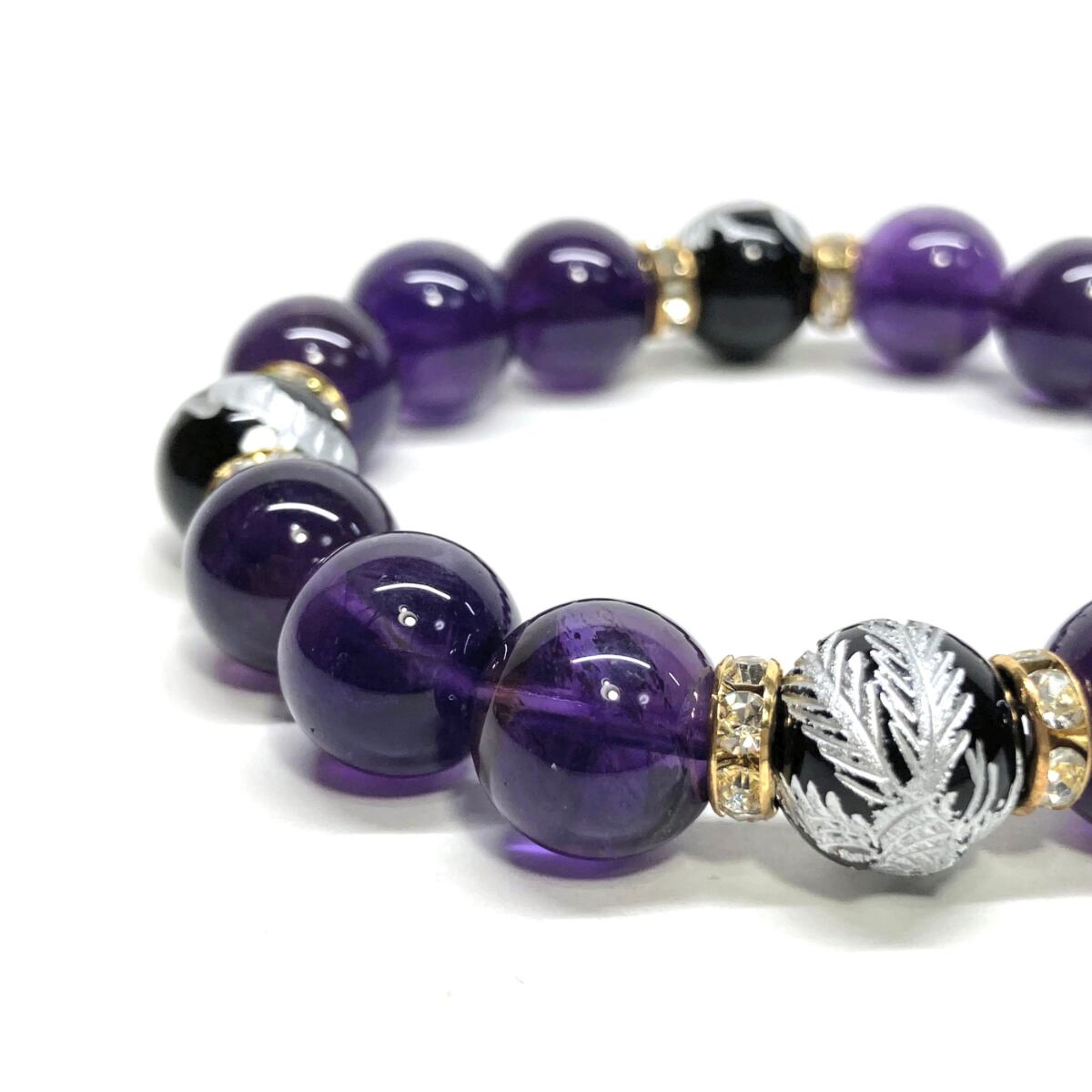 12mm 四神獣銀彫オニキス×アメジスト パワーストーン ブレスレット天然石 運気上昇 開運 ☆ 恋愛運 お守り 青龍 白虎 玄武 朱雀 2月誕生石(ゴールド)メンズ・レディース 男性・女性 数珠ブレス 開運 ☆ | パワーストーン 天然石 Kinari&Co.