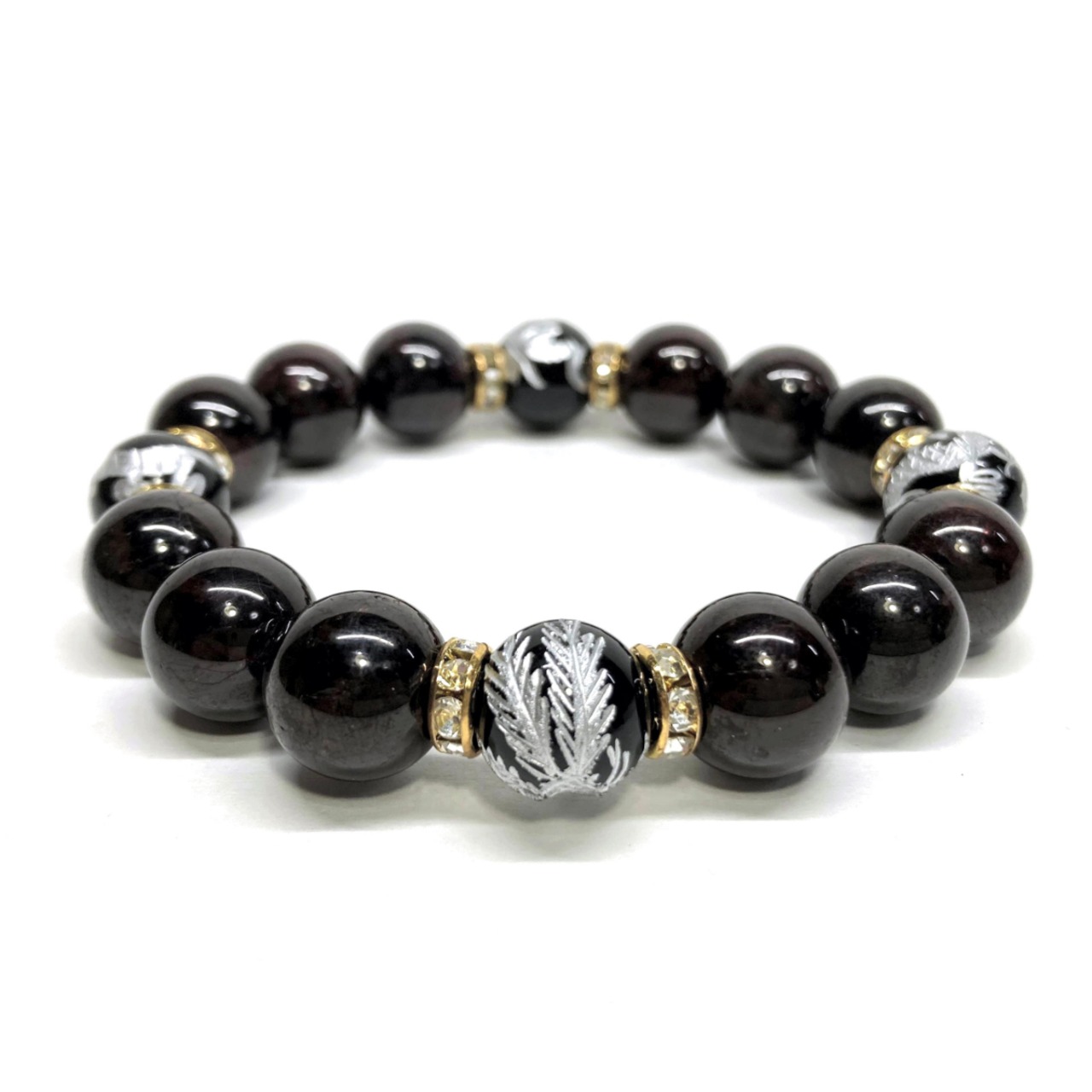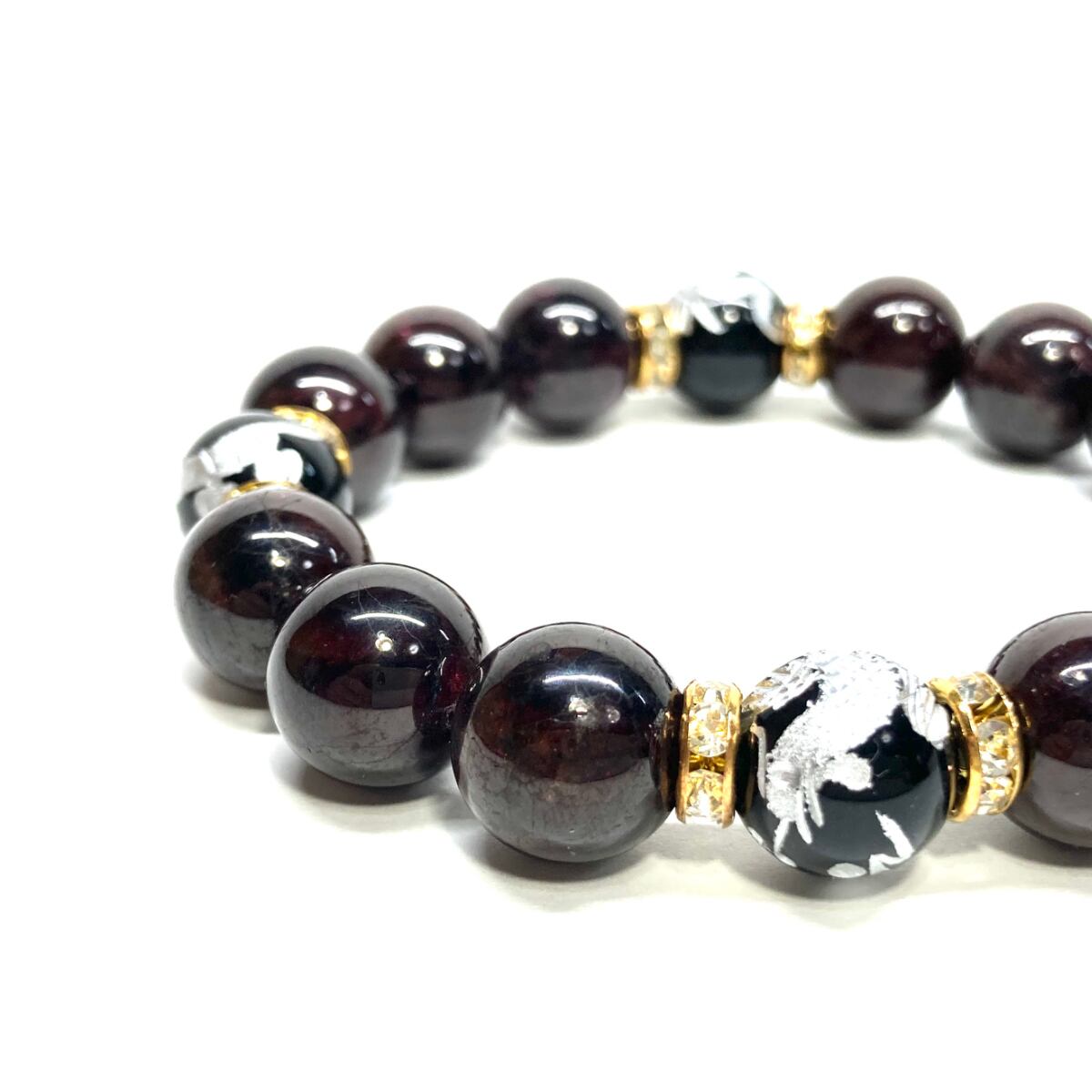 12mm 四神獣銀彫オニキス×ガーネット パワーストーン ブレスレット天然石 運気上昇 開運 ☆ 恋愛運 お守り 青龍 白虎 玄武 朱雀 1月誕生石 (ゴールド)メンズ・レディース 男性・女性 数珠ブレス 開運 ☆