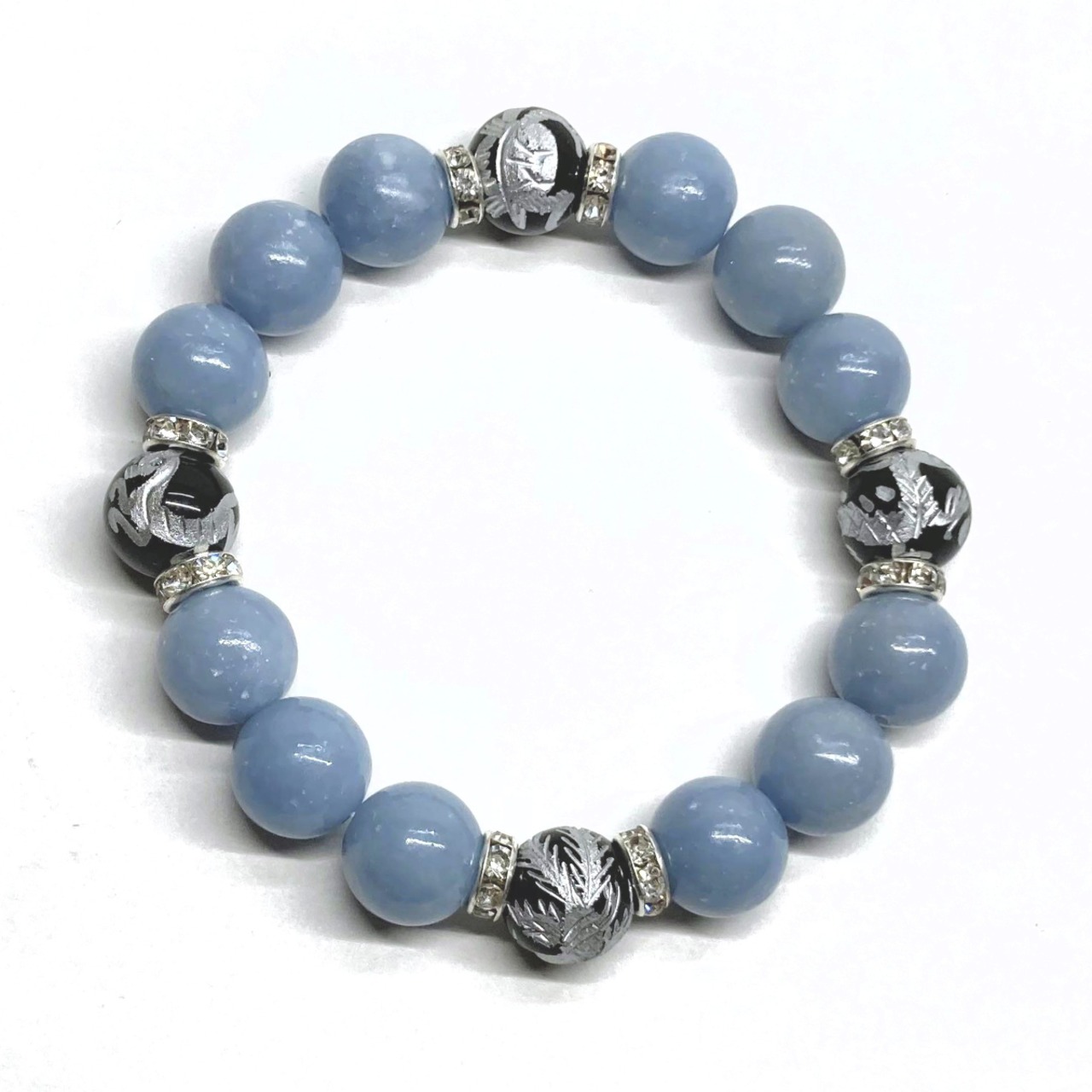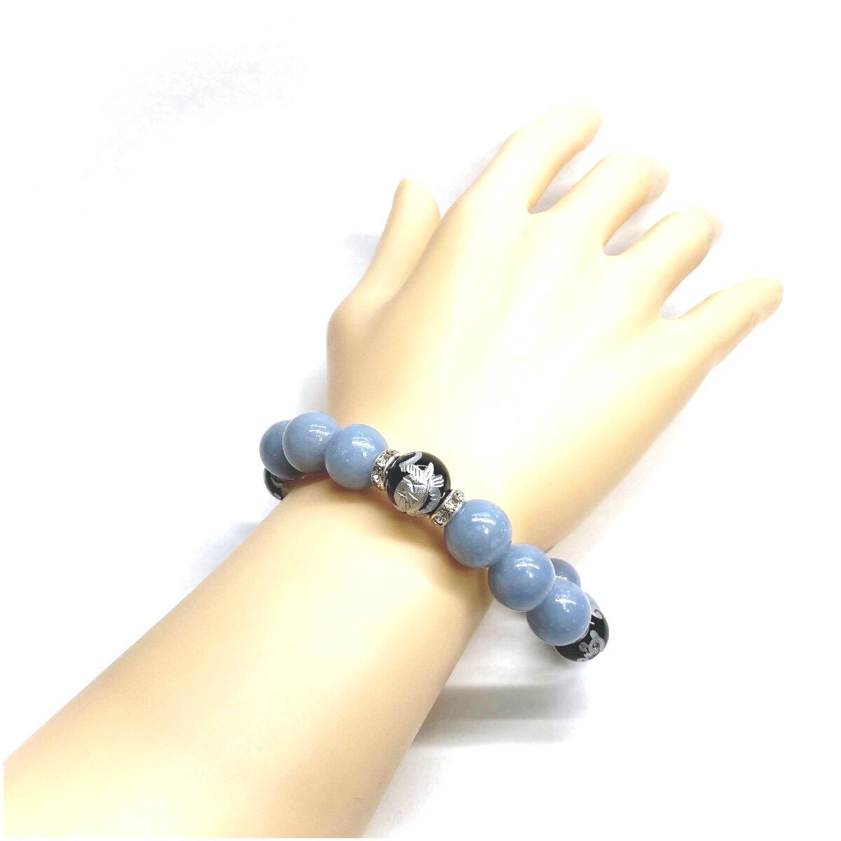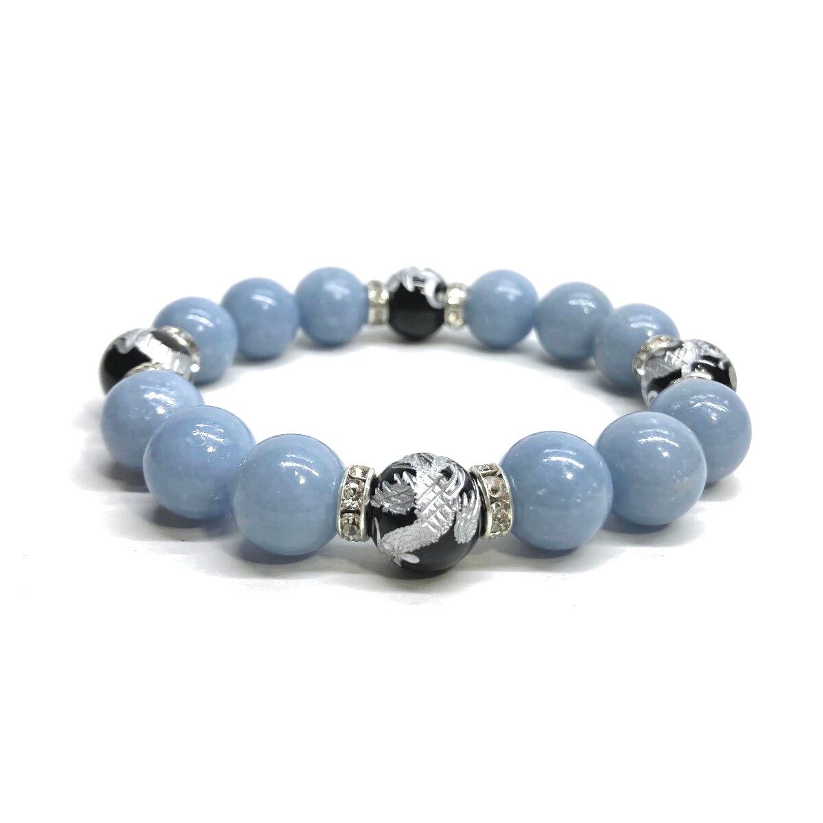 12mm 四神獣銀彫オニキス×エンジェライト パワーストーン ブレスレット天然石 運気上昇 健康運 厄払い お守り 青龍 白虎 玄武 朱雀 (シルバー)メンズ・レディース 男性・女性 数珠ブレス 開運 ☆