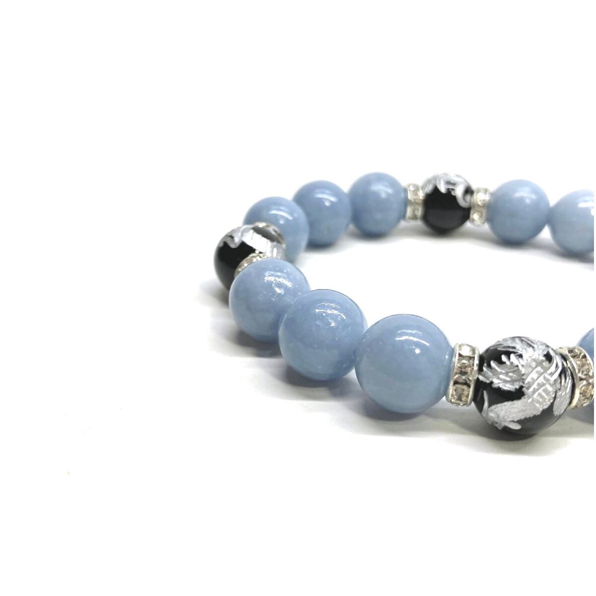 ご覧頂いているブレスレットは、四神獣銀彫オニキスとエンジェライトを組み合わせたブレスレット。守り神である四神とパワーストーンの組み合わせで運気の流れを引き寄せる強運ブレスレットです。シンプルなデザインで男女問わず、年齢問わずご使用頂けるデザインなっております。シンプルなデザインは日常のアクセントとして、仕事やビジネスカジュアル、パーティーや特別なイベントなど様々なシーン活用できます。また、ちょっと贈り物にも最適なブレスレットになっております。四神獣を身につけて厄災から身を守り、多くの運気を呼び込まれてください。
