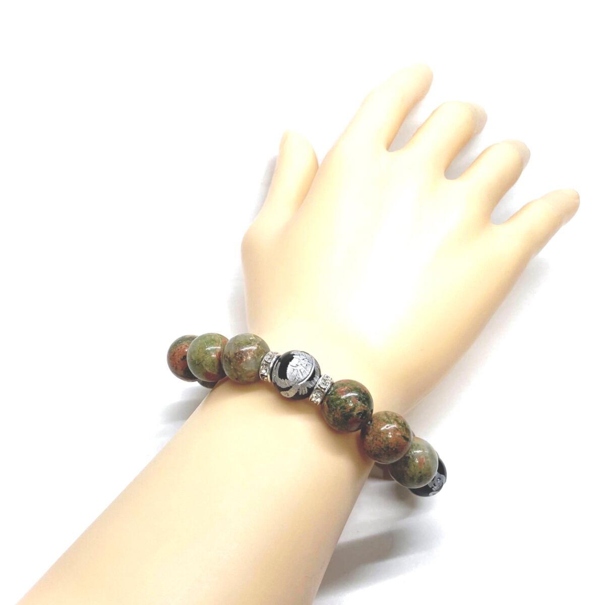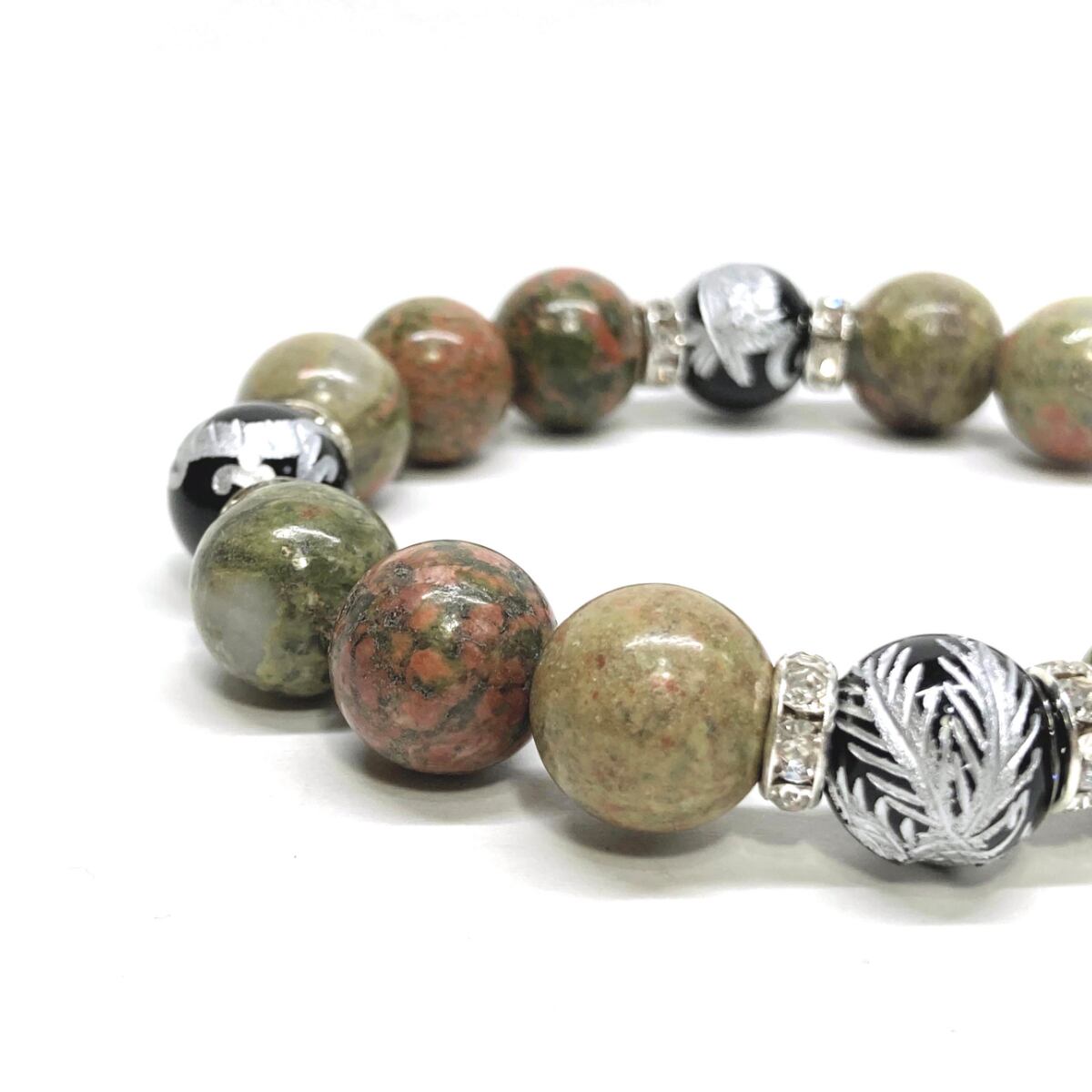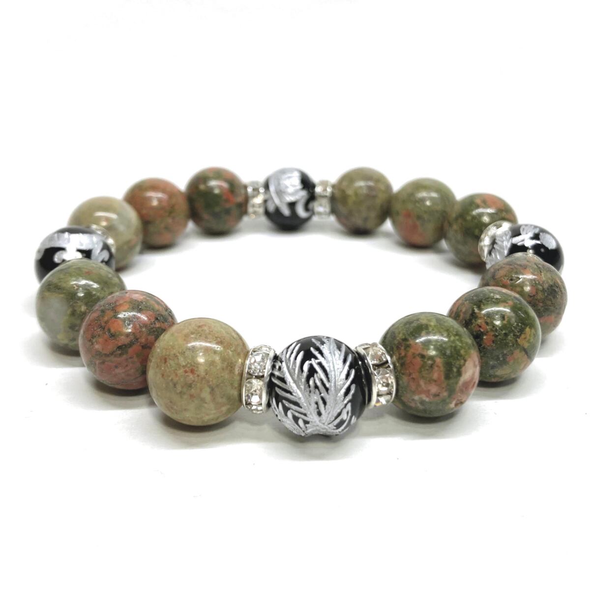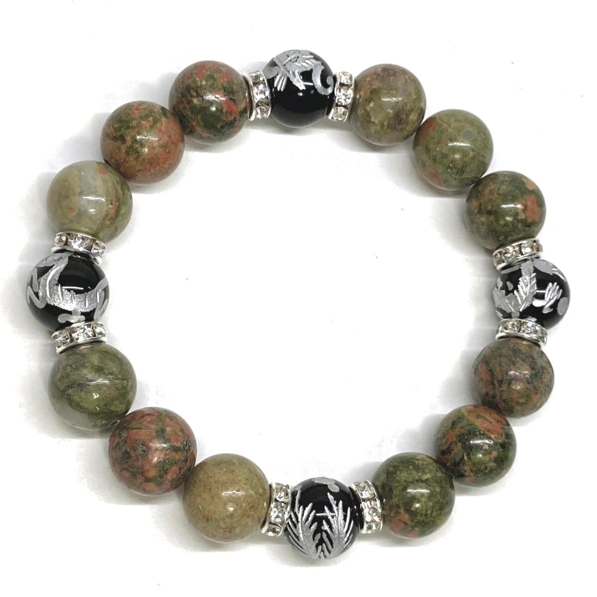 12mm 四神獣銀彫オニキス×ユナカイト パワーストーン ブレスレット天然石 運気上昇 開運 ☆ 健康運 お守り 青龍 白虎 玄武 朱雀 (シルバー)メンズ・レディース 男性・女性 数珠ブレス 開運 ☆ | パワーストーン 天然石 Kinari&Co.