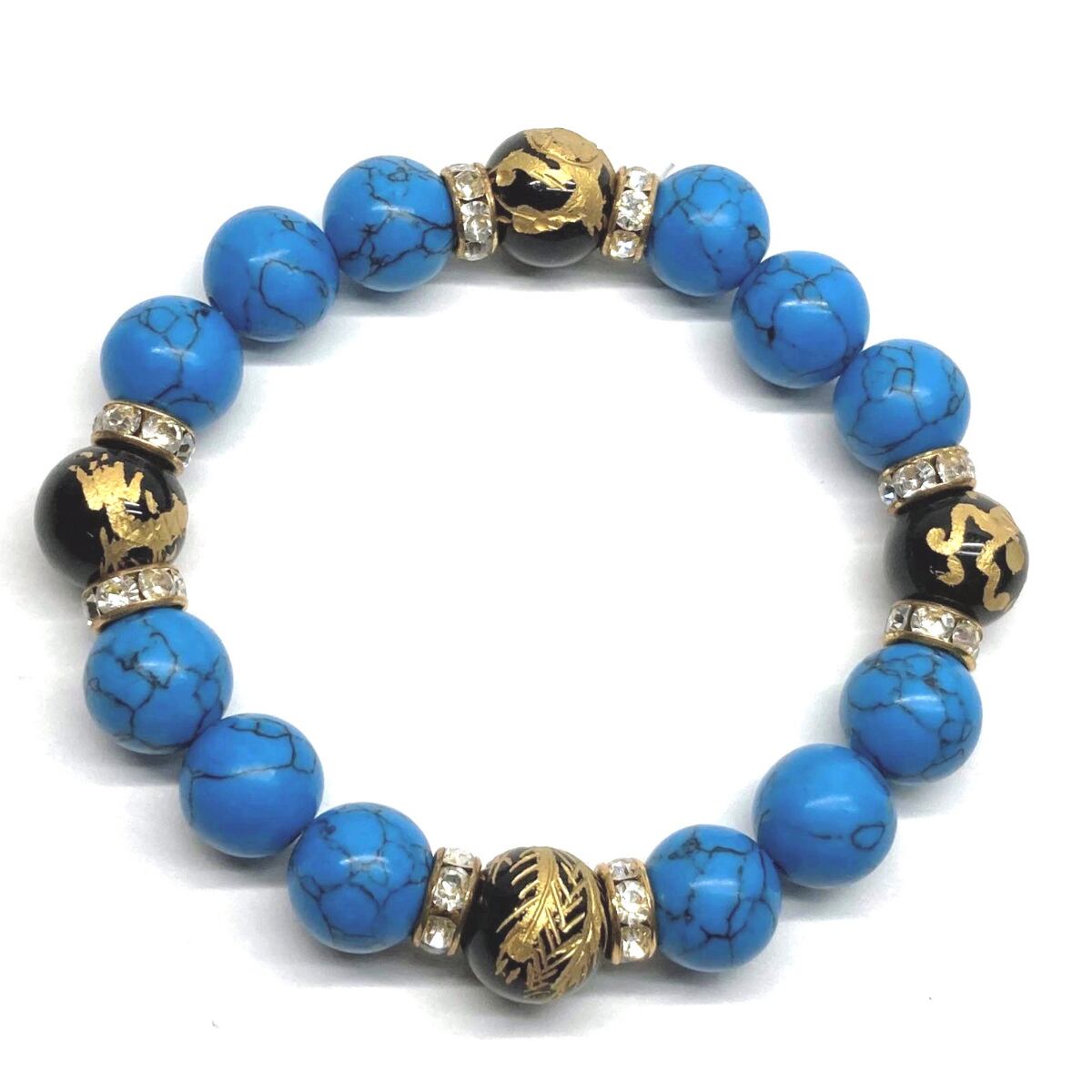 ご覧頂いているブレスレットは、四神獣金彫オニキスとターコイズを組み合わせたブレスレット。守り神である四神とパワーストーンの組み合わせで運気の流れを引き寄せる強運ブレスレットです。シンプルなデザインで男女問わず、年齢問わずご使用頂けるデザインなっております。シンプルなデザインは日常のアクセントとして、仕事やビジネスカジュアル、パーティーや特別なイベントなど様々なシーン活用できます。また、ちょっと贈り物にも最適なブレスレットになっております。四神獣を身につけて厄災から身を守り、多くの運気を呼び込まれてください。