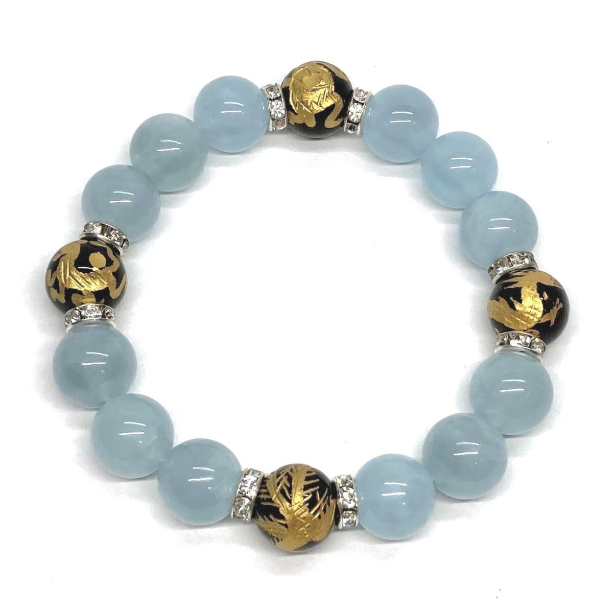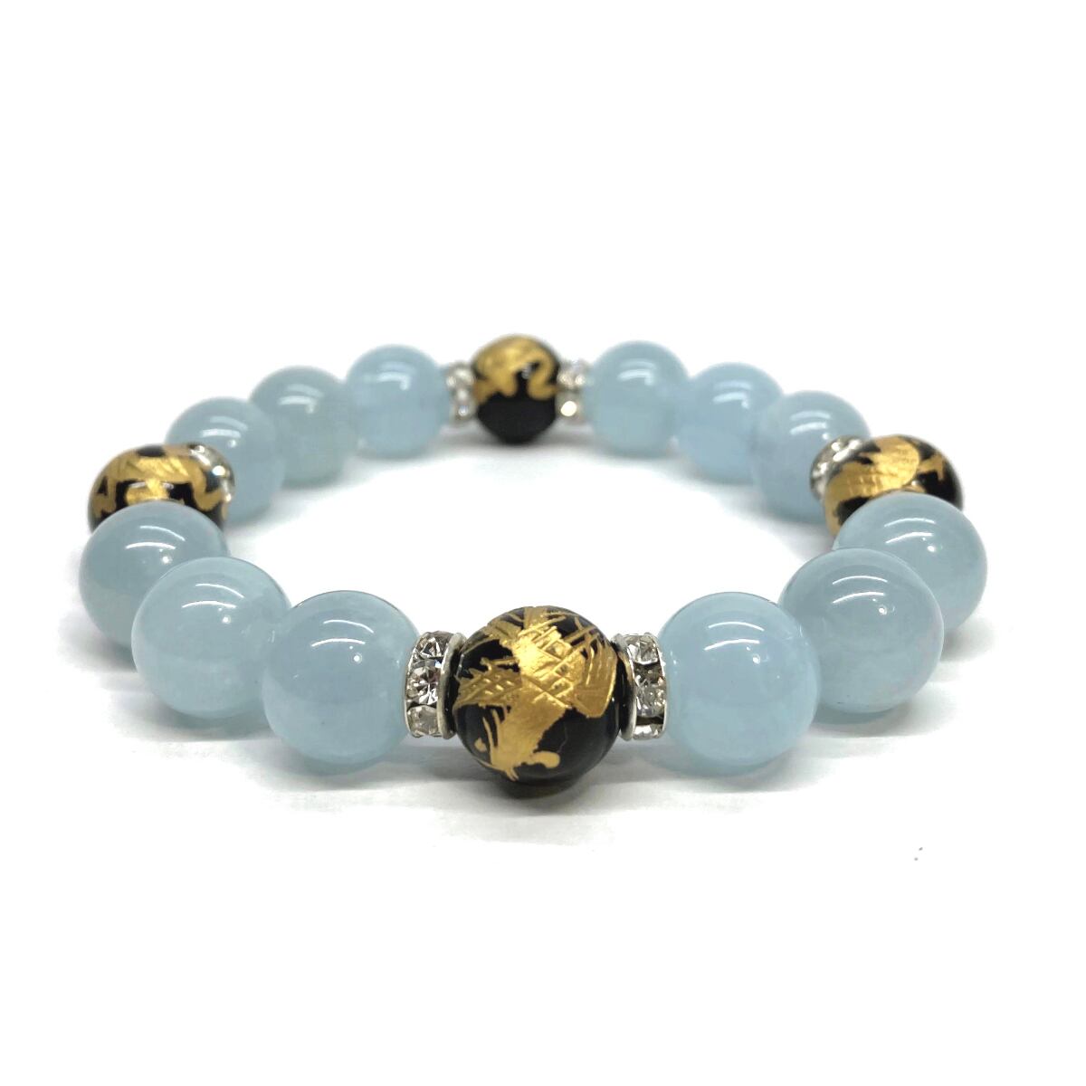 12mm 四神獣金彫オニキス×アクアマリン パワーストーン ブレスレット天然石 運気上昇 開運 ☆ 金運 お守り 青龍 白虎 玄武 朱雀 3月誕生石 (シルバー)メンズ・レディース 男性・女性 数珠ブレス 開運 ☆