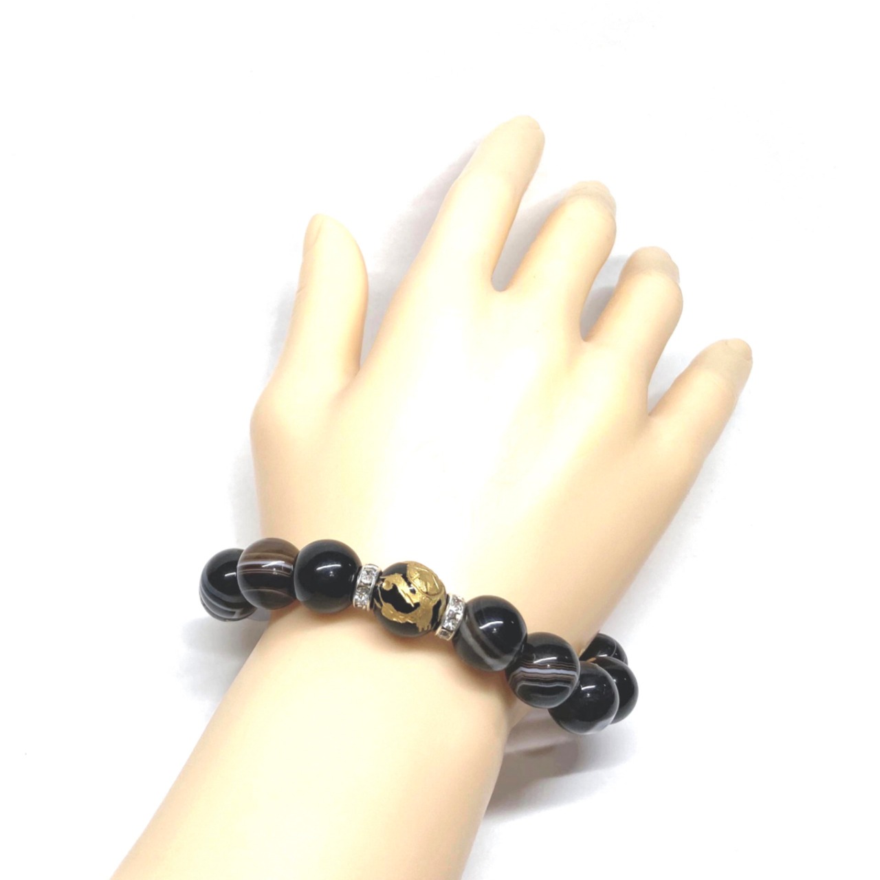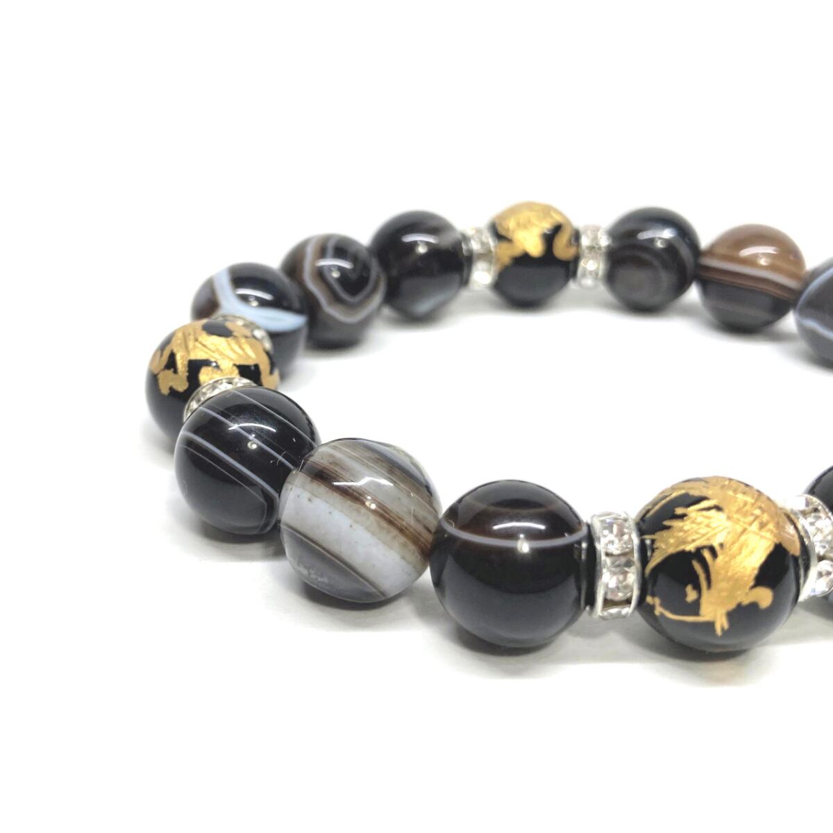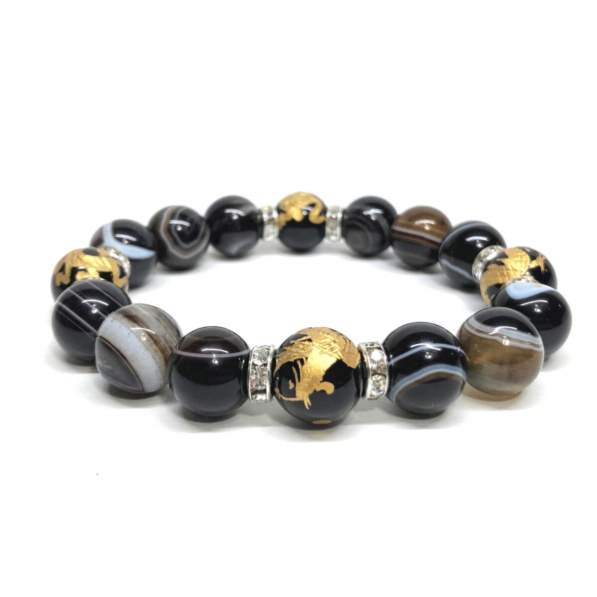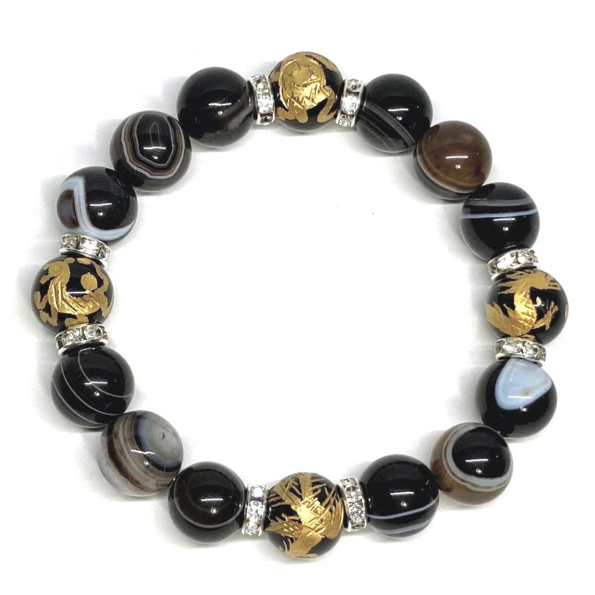 12mm 四神獣金彫オニキス×チベットアゲート(天眼石) パワーストーン ブレスレット天然石 運気上昇 金運 ギャンブル運 お守り (シルバー)メンズ・レディース 男性・女性 数珠ブレス 開運 ☆ | パワーストーン 天然石 Kinari&Co.