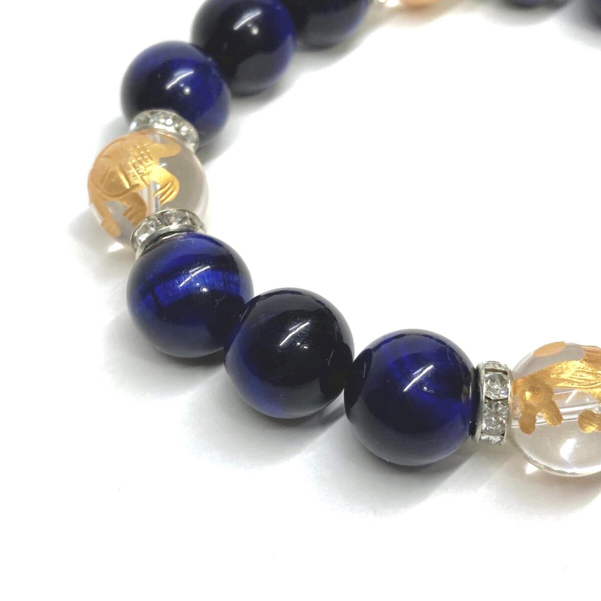 ご覧頂いているブレスレットは、四神獣金彫水晶とブルータイガーアイを組み合わせたブレスレット。守り神である四神とパワーストーンの組み合わせで運気の流れを引き寄せる強運ブレスレットです。シンプルなデザインで男女問わず、年齢問わずご使用頂けるデザインなっております。シンプルなデザインは日常のアクセントとして、仕事やビジネスカジュアル、パーティーや特別なイベントなど様々なシーン活用できます。また、ちょっと贈り物にも最適なブレスレットになっております。四神獣を身につけて厄災から身を守り、多くの運気を呼び込まれてください。
