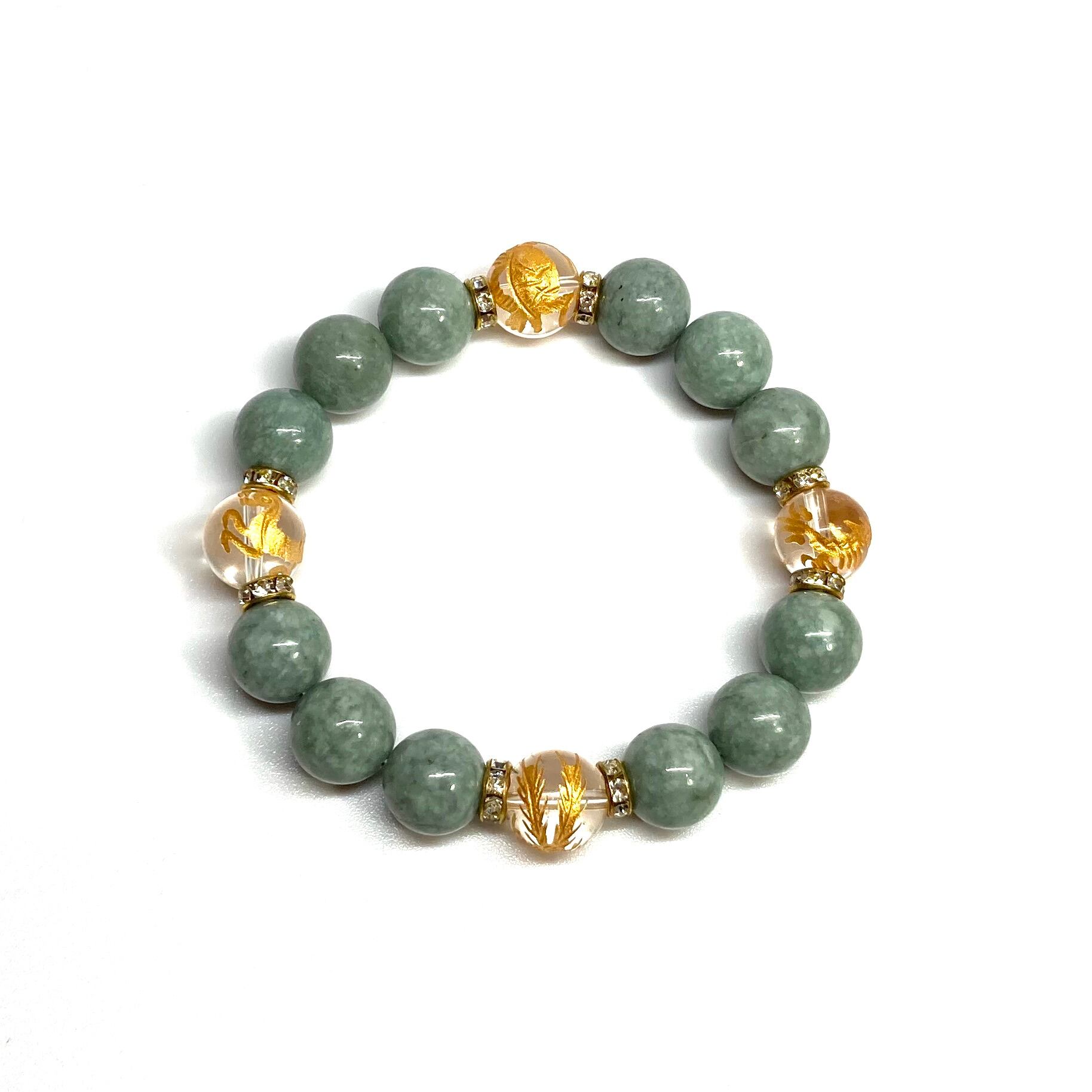 ご覧頂いているブレスレットは、四神獣金彫水晶とビルマ翡翠を組み合わせたブレスレット。守り神である四神とパワーストーンの組み合わせで運気の流れを引き寄せる強運ブレスレットです。シンプルなデザインで男女問わず、年齢問わずご使用頂けるデザインなっております。シンプルなデザインは日常のアクセントとして、仕事やビジネスカジュアル、パーティーや特別なイベントなど様々なシーン活用できます。また、ちょっと贈り物にも最適なブレスレットになっております。四神獣を身につけて厄災から身を守り、多くの運気を呼び込まれてください。