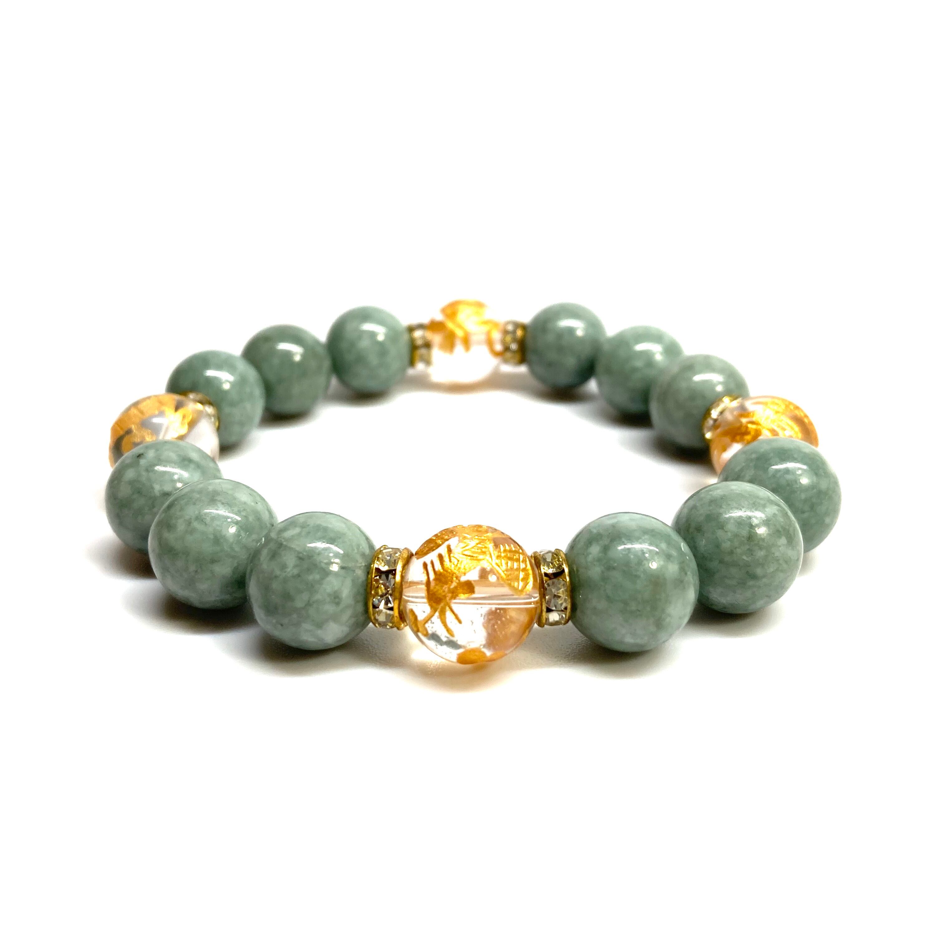 12mm 四神獣金彫水晶×ビルマ翡翠 パワーストーン ブレスレット天然石 運気上昇 金運 ギャンブル運 お守り (ゴールド)メンズ・レディース 男性・女性 数珠ブレス 開運 ☆