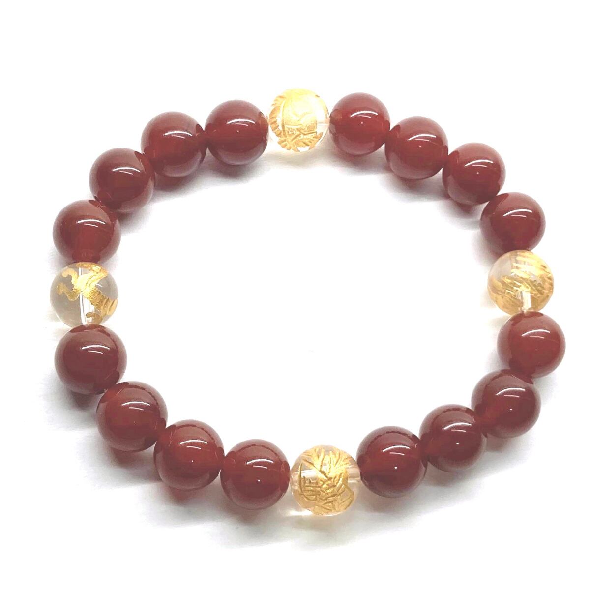 ご覧頂いているブレスレットは、四神獣金彫水晶と赤瑪瑙を組み合わせたブレスレット。守り神である四神とパワーストーンの組み合わせで運気の流れを引き寄せる強運ブレスレットです。シンプルなデザインで男女問わず、年齢問わずご使用頂けるデザインなっております。シンプルなデザインは日常のアクセントとして、仕事やビジネスカジュアル、パーティーや特別なイベントなど様々なシーン活用できます。また、ちょっと贈り物にも最適なブレスレットになっております。四神獣を身につけて厄災から身を守り、多くの運気を呼び込まれてください。