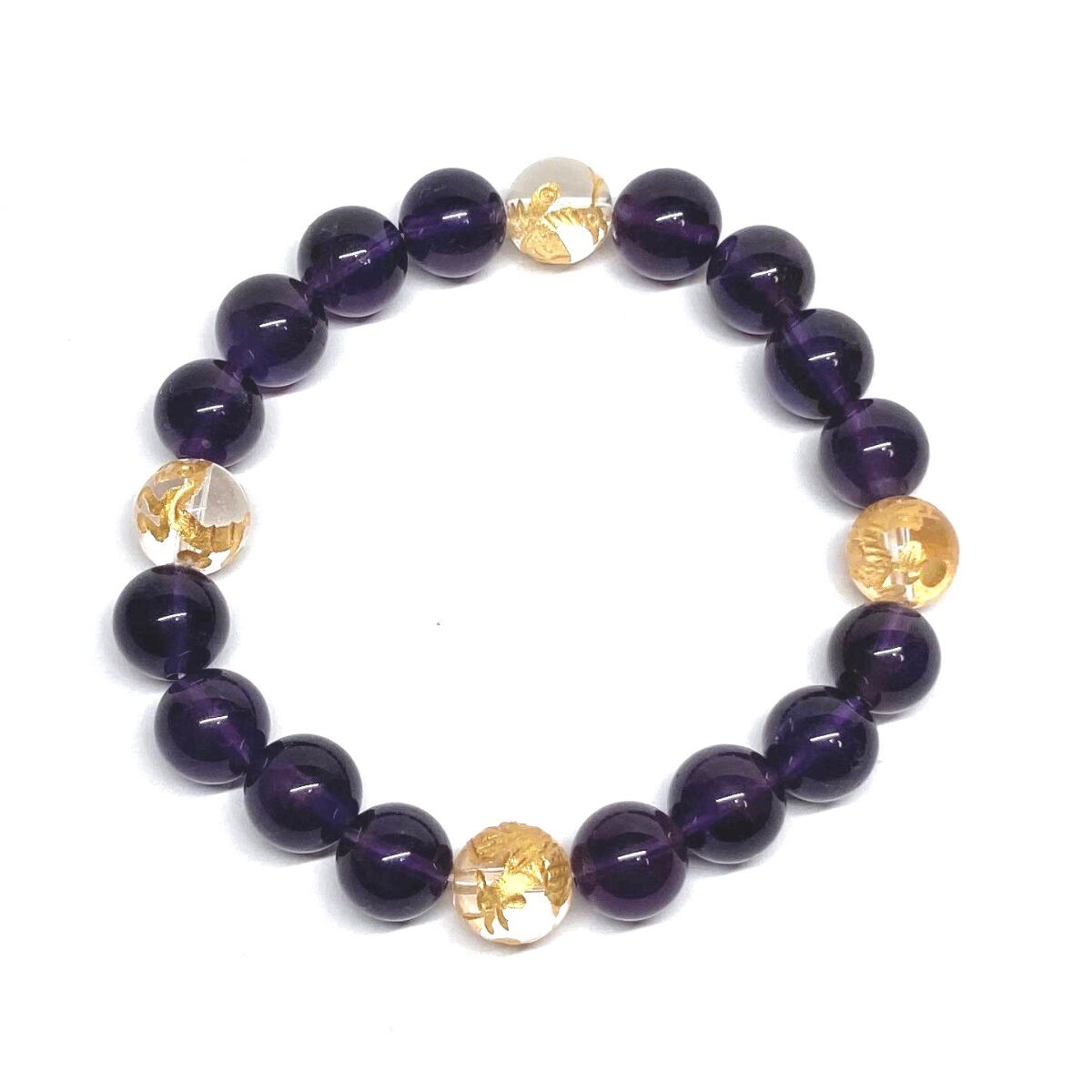 ご覧頂いているブレスレットは、四神獣金彫水晶とアメジストを組み合わせたブレスレット。守り神である四神とパワーストーンの組み合わせで運気の流れを引き寄せる強運ブレスレットです。シンプルなデザインで男女問わず、年齢問わずご使用頂けるデザインなっております。シンプルなデザインは日常のアクセントとして、仕事やビジネスカジュアル、パーティーや特別なイベントなど様々なシーン活用できます。また、ちょっと贈り物にも最適なブレスレットになっております。四神獣を身につけて厄災から身を守り、多くの運気を呼び込まれてください。