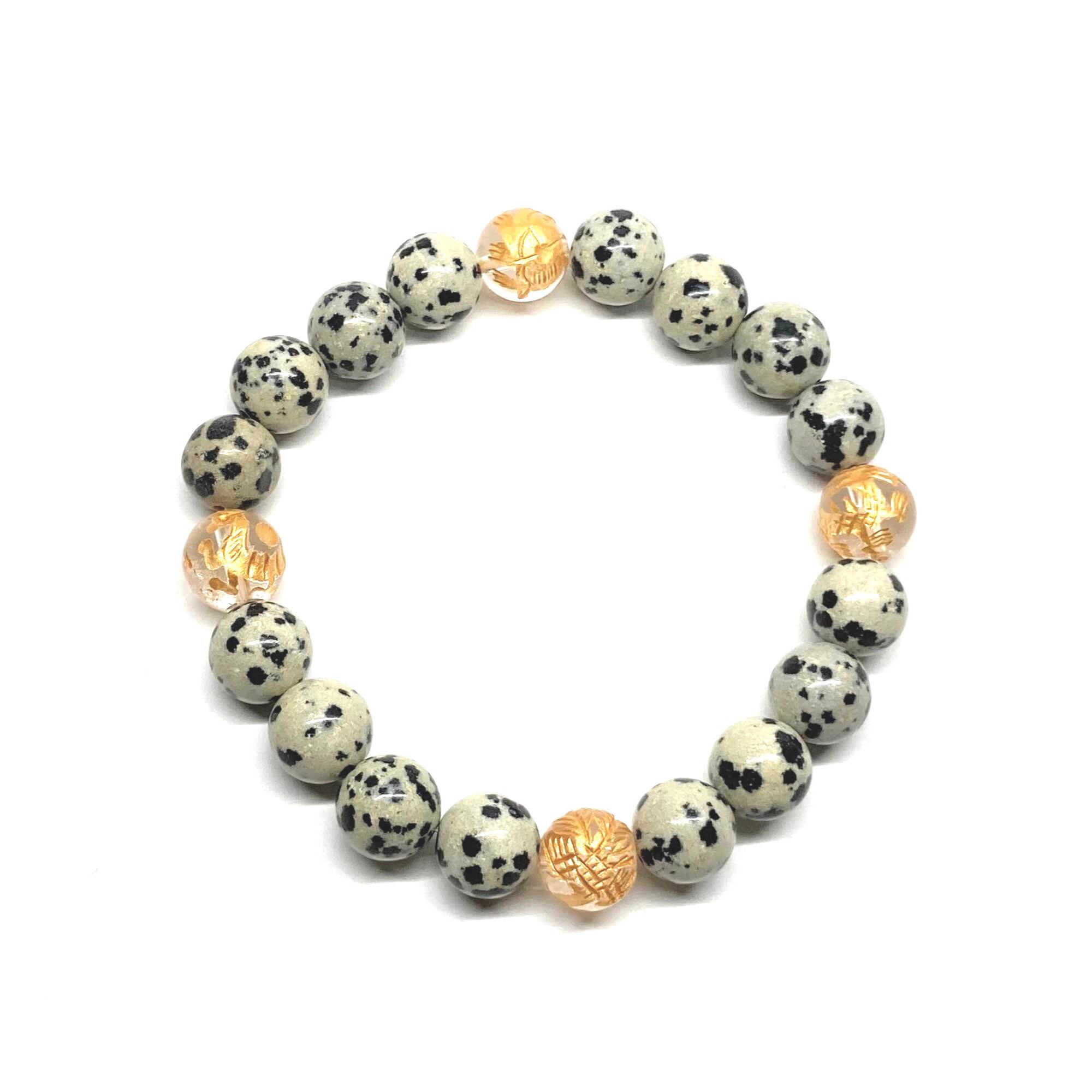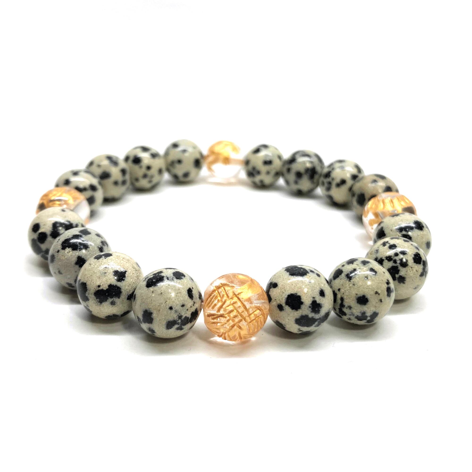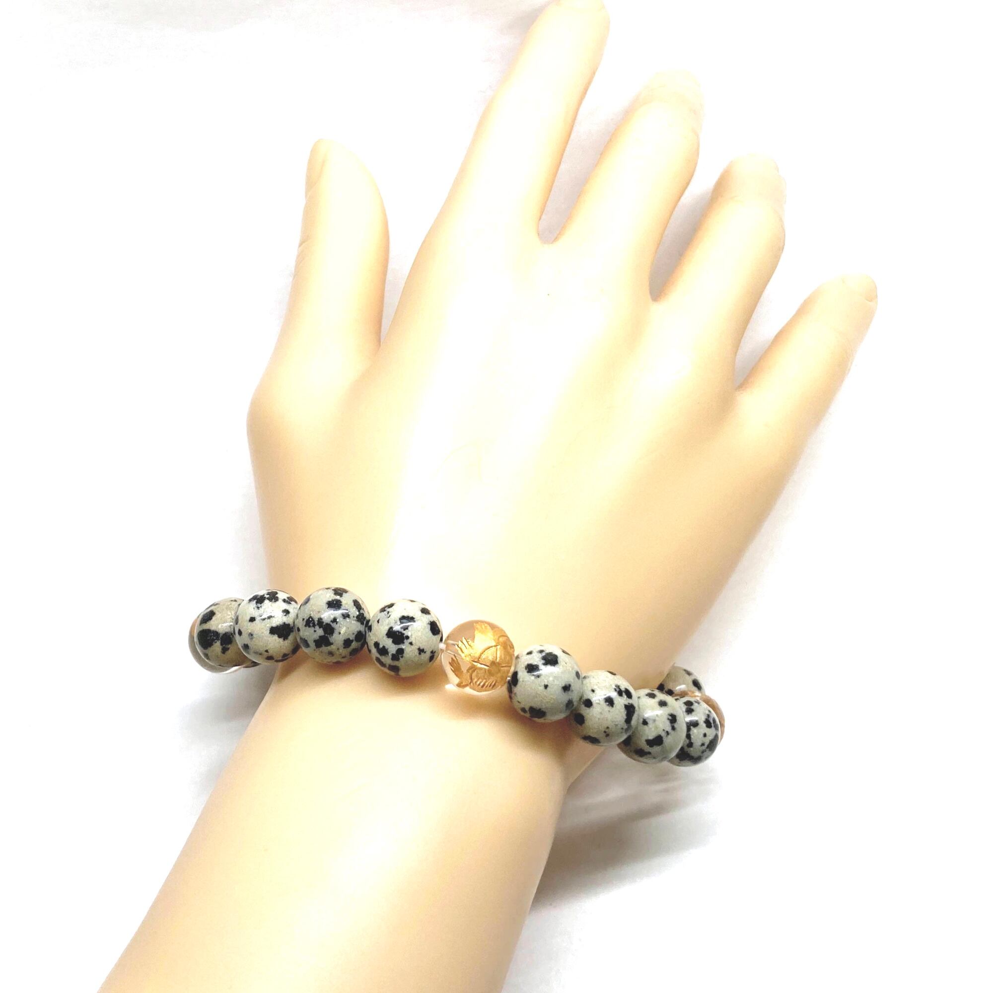 ご覧頂いているブレスレットは、四神獣金彫水晶とダルメシアンジャスパーを組み合わせたブレスレット。守り神である四神とパワーストーンの組み合わせで運気の流れを引き寄せる強運ブレスレットです。シンプルなデザインで男女問わず、年齢問わずご使用頂けるデザインなっております。シンプルなデザインは日常のアクセントとして、仕事やビジネスカジュアル、パーティーや特別なイベントなど様々なシーン活用できます。また、ちょっと贈り物にも最適なブレスレットになっております。四神獣を身につけて厄災から身を守り、多くの運気を呼び込まれてください。