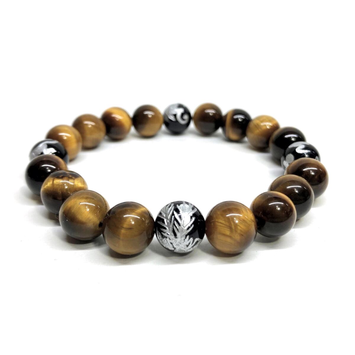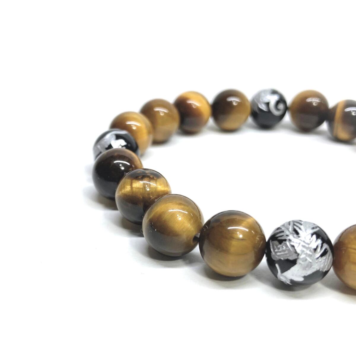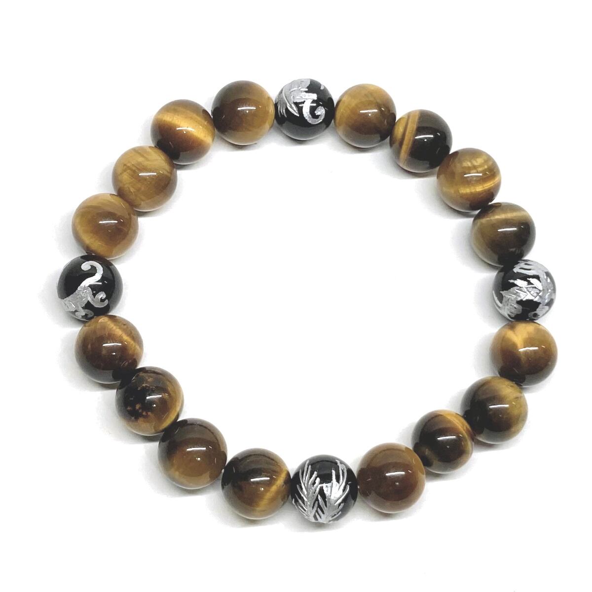 ご覧頂いているブレスレットは、四神獣銀彫オニキスとタイガーアイを組み合わせたブレスレット。守り神である四神とパワーストーンの組み合わせで運気の流れを引き寄せる強運ブレスレットです。シンプルなデザインで男女問わず、年齢問わずご使用頂けるデザインなっております。シンプルなデザインは日常のアクセントとして、仕事やビジネスカジュアル、パーティーや特別なイベントなど様々なシーン活用できます。また、ちょっと贈り物にも最適なブレスレットになっております。四神獣を身につけて厄災から身を守り、多くの運気を呼び込まれてください。