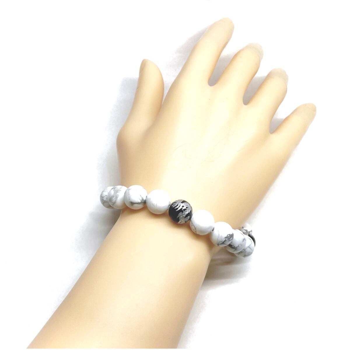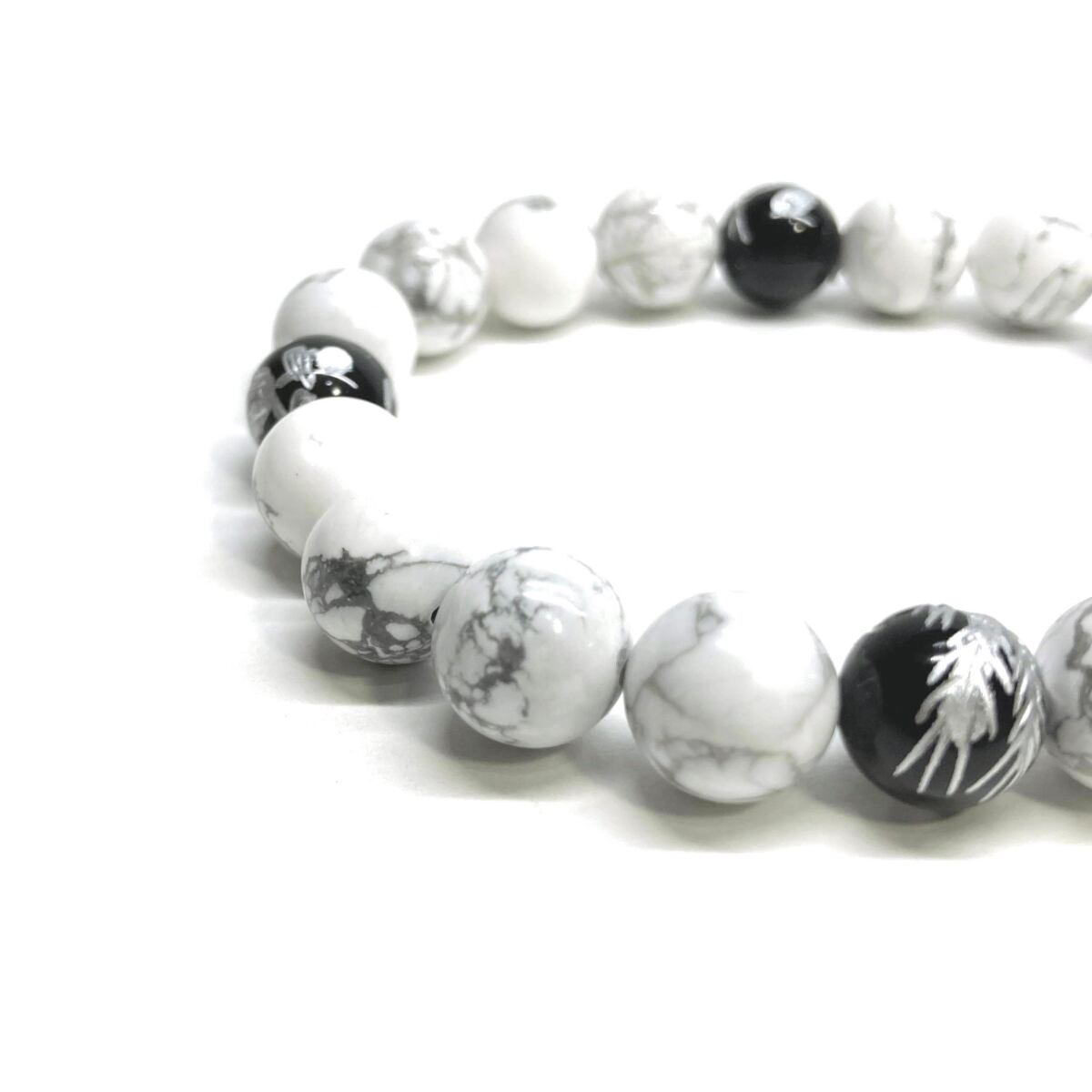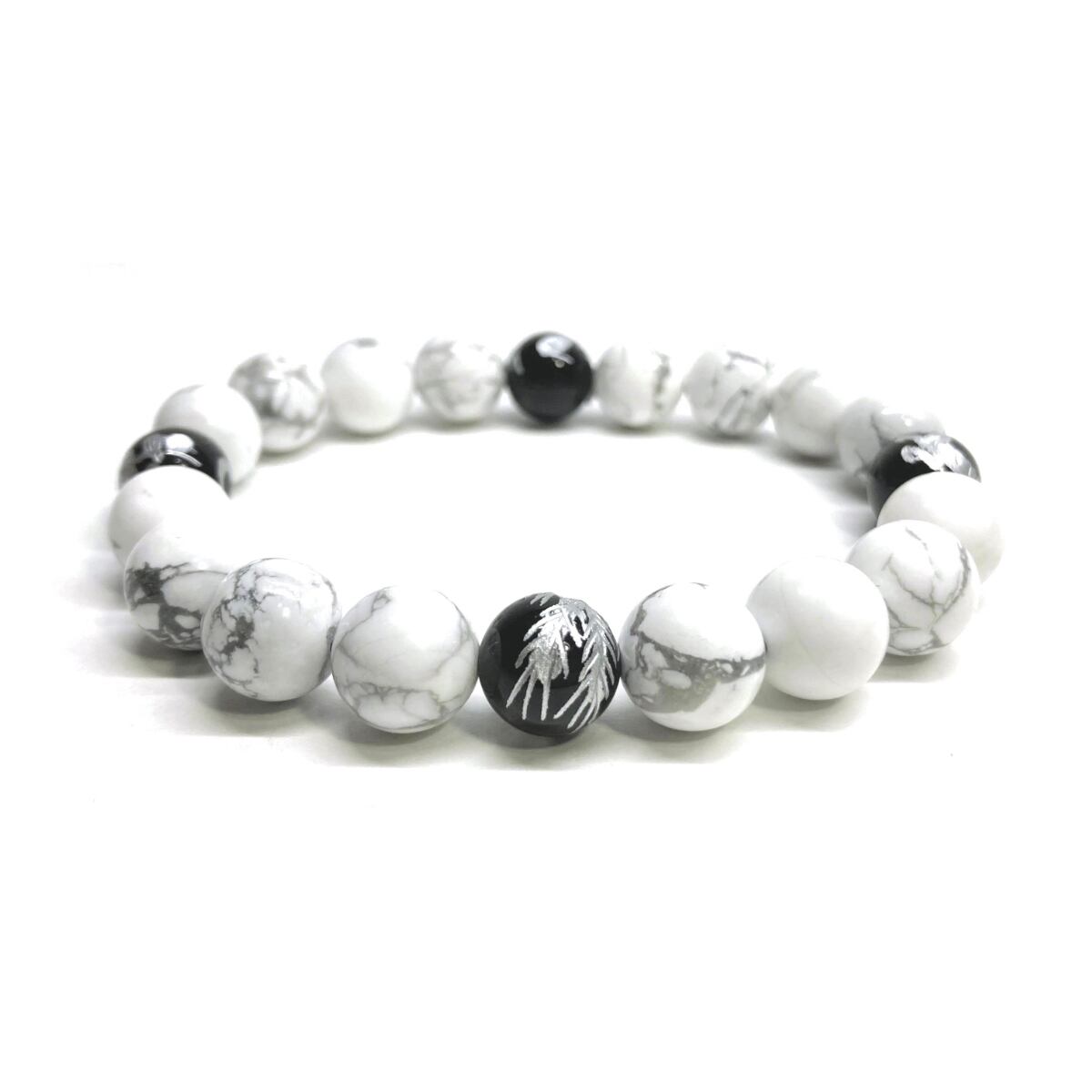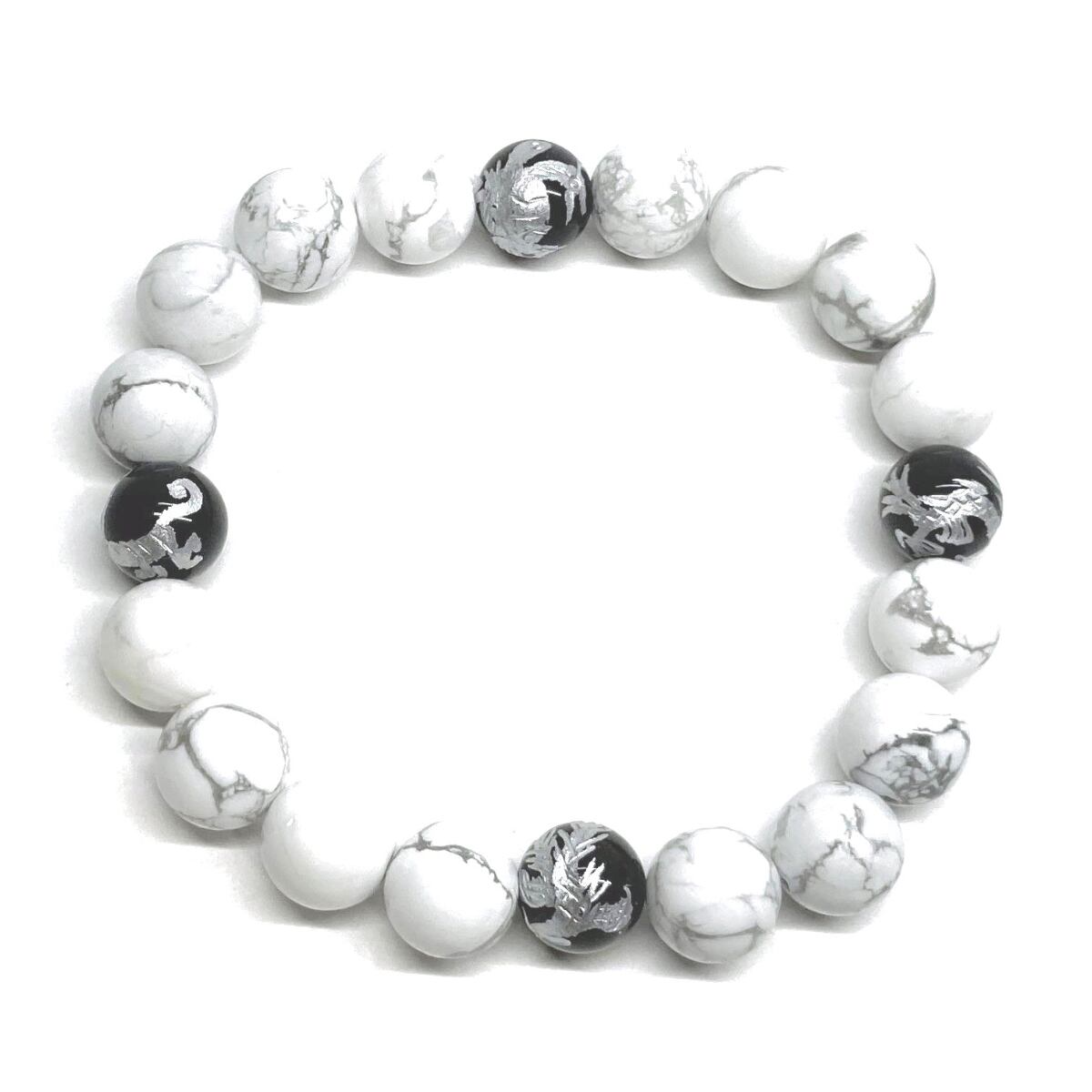 ご覧頂いているブレスレットは、四神獣銀彫オニキスとハウライトを組み合わせたブレスレット。守り神である四神とパワーストーンの組み合わせで運気の流れを引き寄せる強運ブレスレットです。シンプルなデザインで男女問わず、年齢問わずご使用頂けるデザインなっております。シンプルなデザインは日常のアクセントとして、仕事やビジネスカジュアル、パーティーや特別なイベントなど様々なシーン活用できます。また、ちょっと贈り物にも最適なブレスレットになっております。四神獣を身につけて厄災から身を守り、多くの運気を呼び込まれてください。