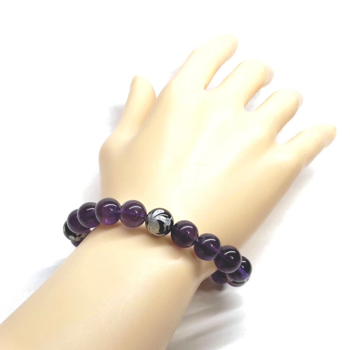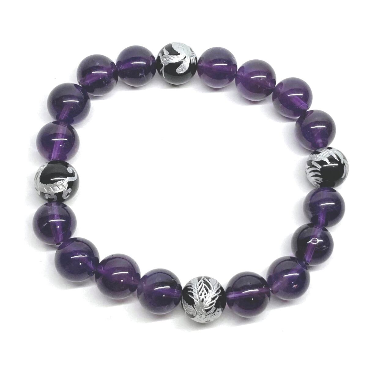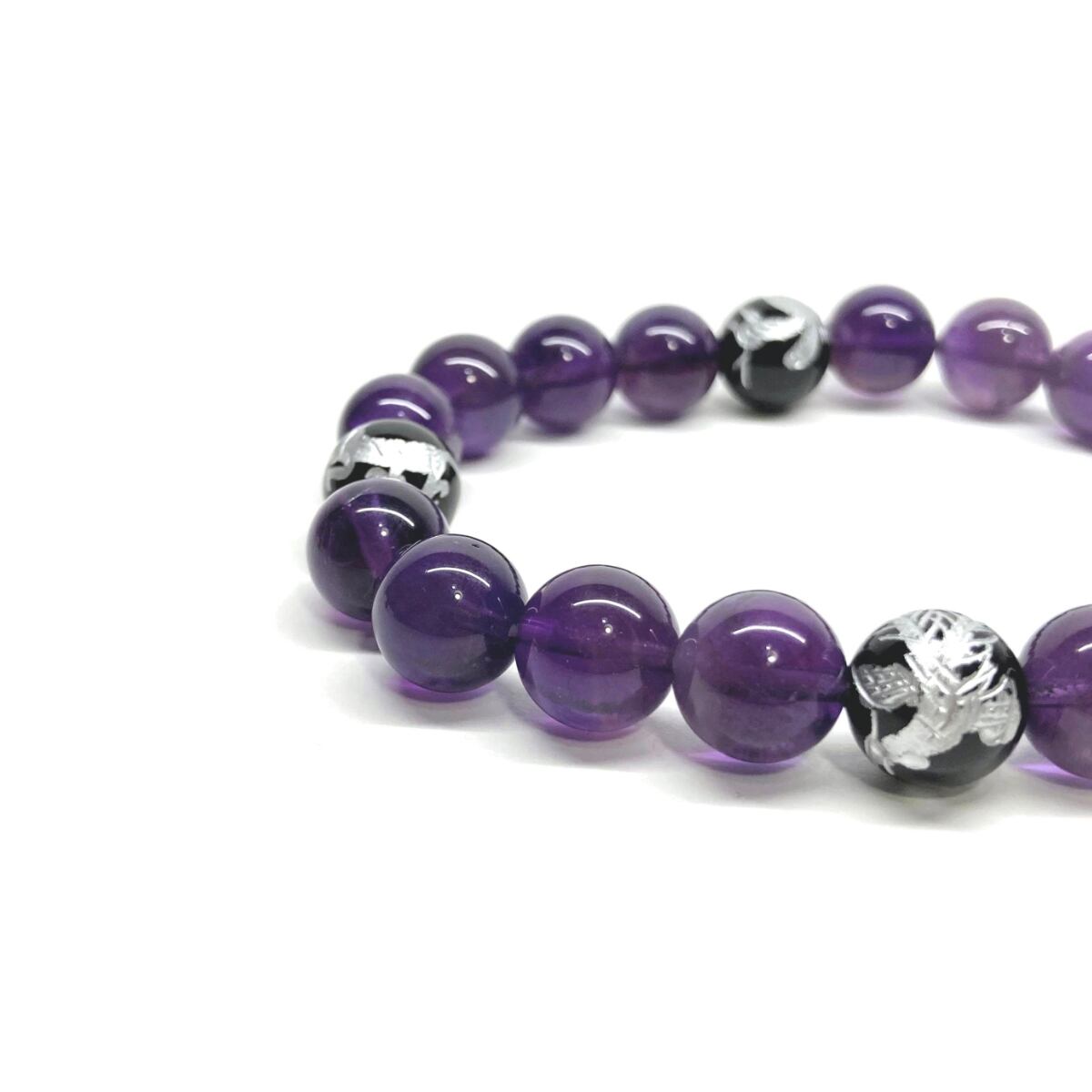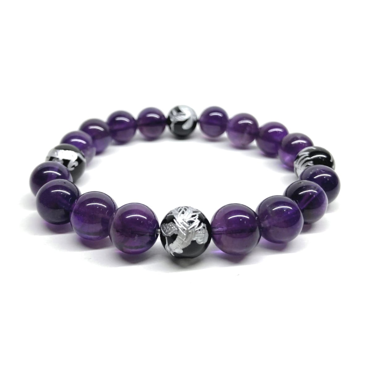 ご覧頂いているブレスレットは、四神獣銀彫オニキスとアメジストを組み合わせたブレスレット。守り神である四神とパワーストーンの組み合わせで運気の流れを引き寄せる強運ブレスレットです。シンプルなデザインで男女問わず、年齢問わずご使用頂けるデザインなっております。シンプルなデザインは日常のアクセントとして、仕事やビジネスカジュアル、パーティーや特別なイベントなど様々なシーン活用できます。また、ちょっと贈り物にも最適なブレスレットになっております。四神獣を身につけて厄災から身を守り、多くの運気を呼び込まれてください。