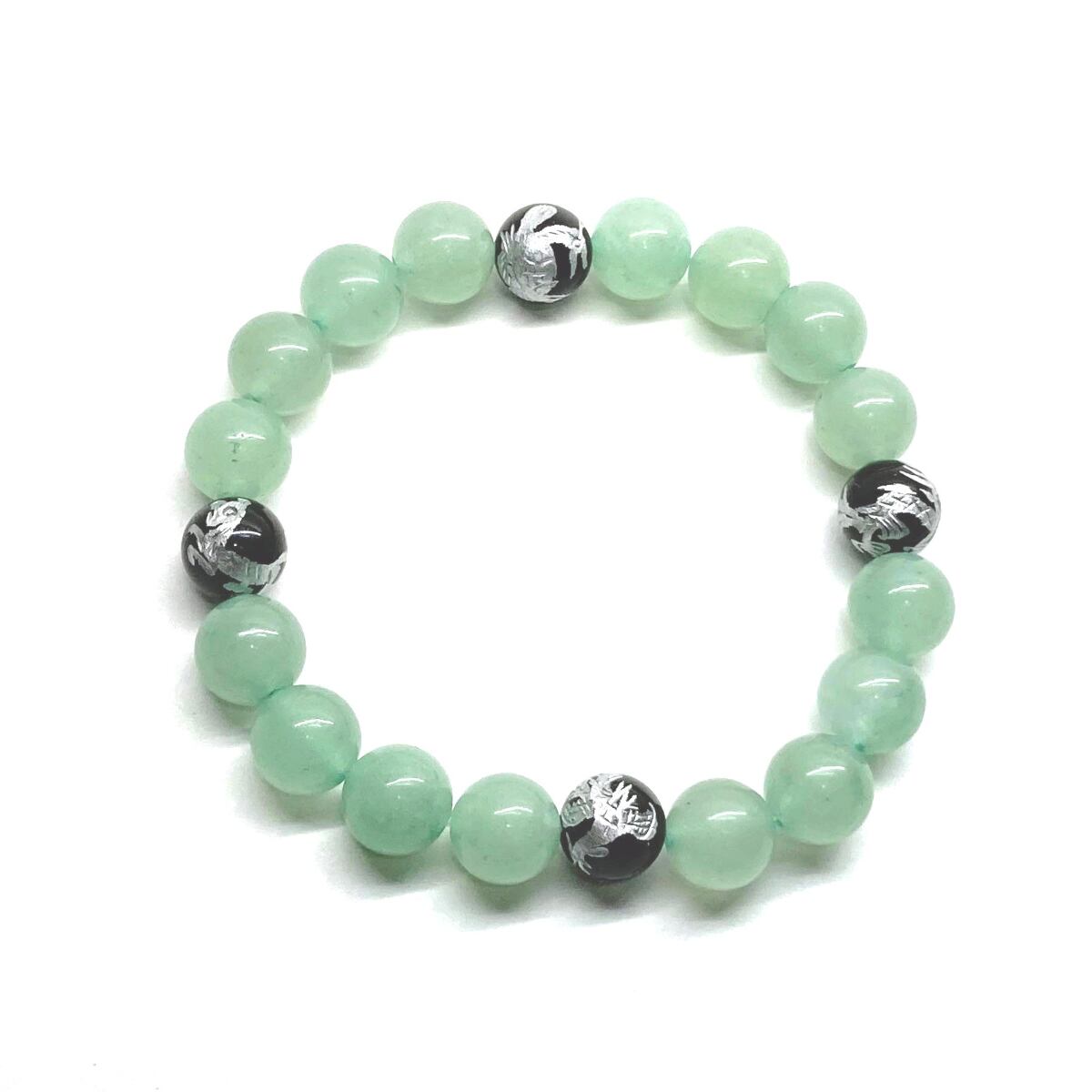 ご覧頂いているブレスレットは、四神獣銀彫オニキスとアベンチュリンを組み合わせたブレスレット。守り神である四神とパワーストーンの組み合わせで運気の流れを引き寄せる強運ブレスレットです。シンプルなデザインで男女問わず、年齢問わずご使用頂けるデザインなっております。シンプルなデザインは日常のアクセントとして、仕事やビジネスカジュアル、パーティーや特別なイベントなど様々なシーン活用できます。また、ちょっと贈り物にも最適なブレスレットになっております。四神獣を身につけて厄災から身を守り、多くの運気を呼び込まれてください。