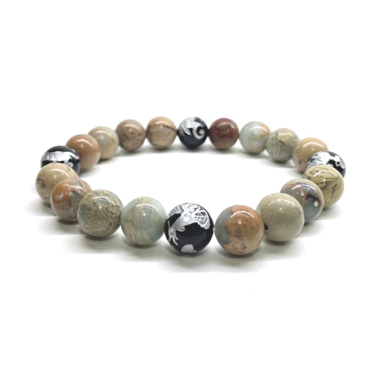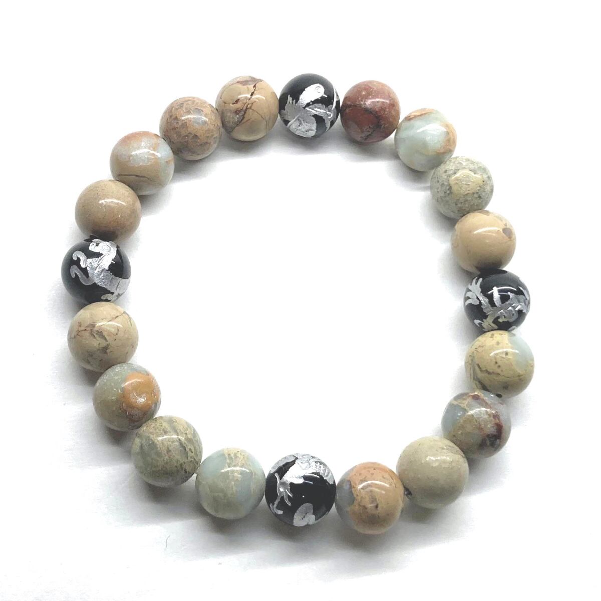 ご覧頂いているブレスレットは、四神獣銀彫オニキスとインプレッションストーンを組み合わせたブレスレット。守り神である四神とパワーストーンの組み合わせで運気の流れを引き寄せる強運ブレスレットです。シンプルなデザインで男女問わず、年齢問わずご使用頂けるデザインなっております。シンプルなデザインは日常のアクセントとして、仕事やビジネスカジュアル、パーティーや特別なイベントなど様々なシーン活用できます。また、ちょっと贈り物にも最適なブレスレットになっております。四神獣を身につけて厄災から身を守り、多くの運気を呼び込まれてください。
