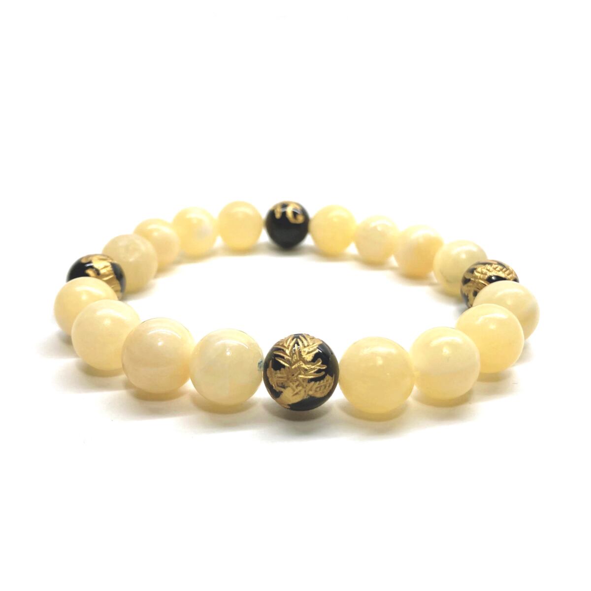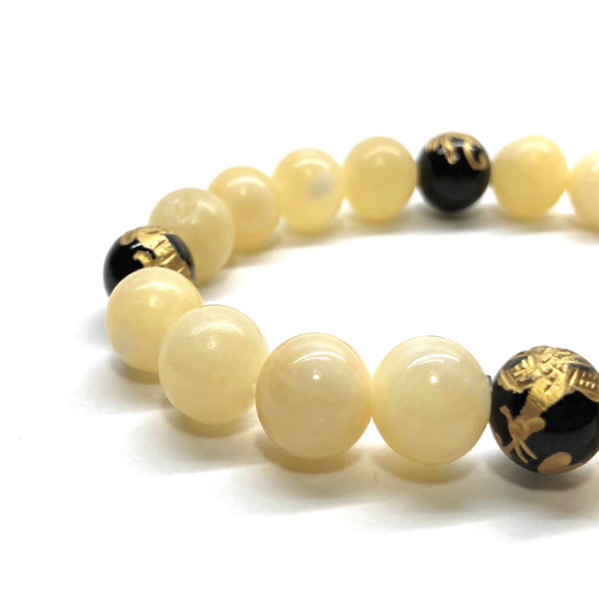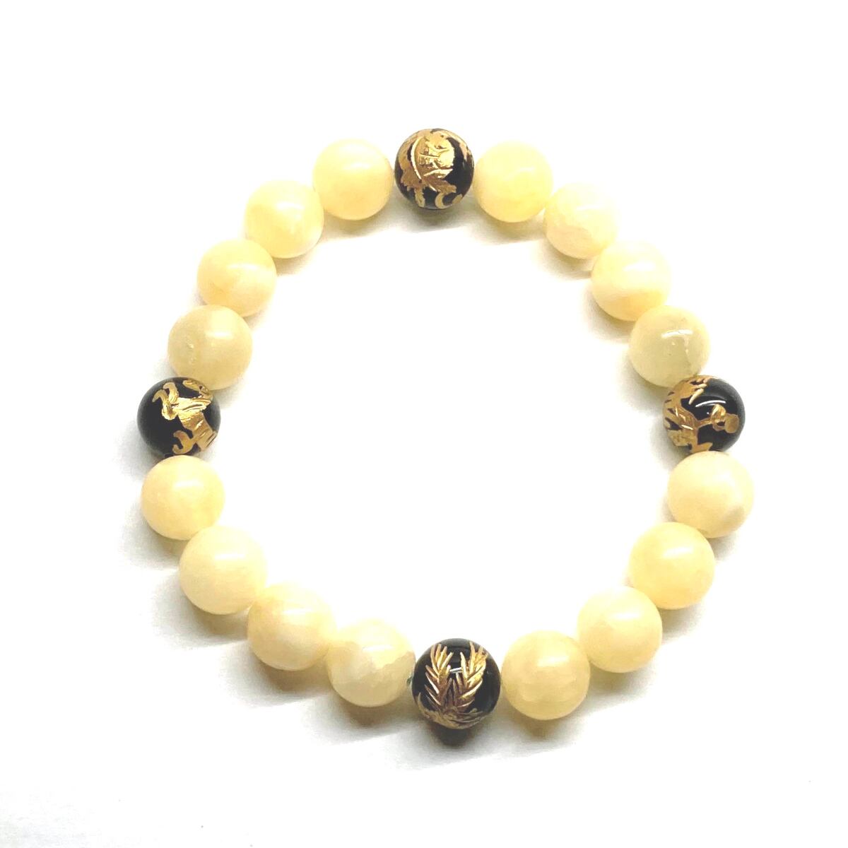 ご覧頂いているブレスレットは、四神獣金彫オニキスとアラゴナイトを組み合わせたブレスレット。守り神である四神とパワーストーンの組み合わせで運気の流れを引き寄せる強運ブレスレットです。シンプルなデザインで男女問わず、年齢問わずご使用頂けるデザインなっております。シンプルなデザインは日常のアクセントとして、仕事やビジネスカジュアル、パーティーや特別なイベントなど様々なシーン活用できます。また、ちょっと贈り物にも最適なブレスレットになっております。四神獣を身につけて厄災から身を守り、多くの運気を呼び込まれてください。