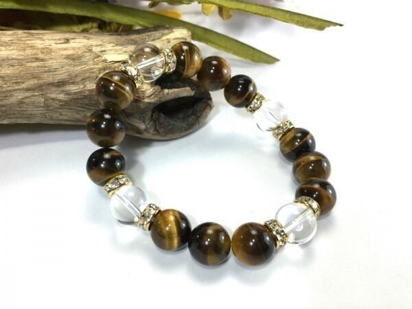 こちらは、12mm玉のタイガーアイと水晶を使用した天然石ブレスレットです。石との間にはロンデルを挟み高級感を演出しています。シンプルなデザインですのでどんなコーディネートとも合わせ易いブレスレットです。石大きさは12mm玉です。内周約18cmです。気になる方は是非この機会にどうぞ。
