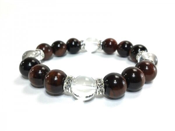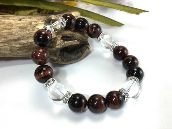 こちらは、12mm玉のレッドタイガーアイと水晶を使用した天然石ブレスレットです。石との間にはロンデルを挟み高級感を演出しています。シンプルなデザインですのでどんなコーディネートとも合わせ易いブレスレットです。石大きさは12mm玉です。内周約18cmです。気になる方は是非この機会にどうぞ。