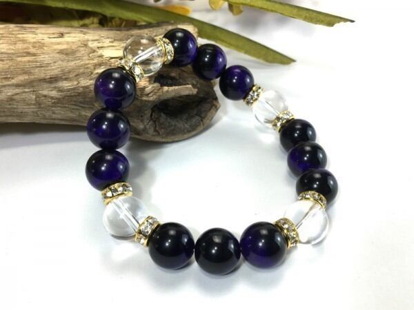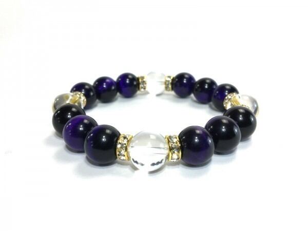 こちらは、12mm玉のパープルタイガーアイと水晶を使用した天然石ブレスレットです。石との間にはロンデルを挟み高級感を演出しています。シンプルなデザインですのでどんなコーディネートとも合わせ易いブレスレットです。石大きさは12mm玉です。内周約18cmです。気になる方は是非この機会にどうぞ。
