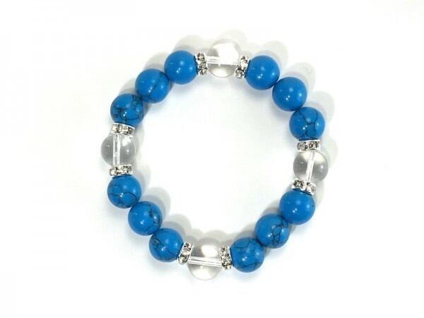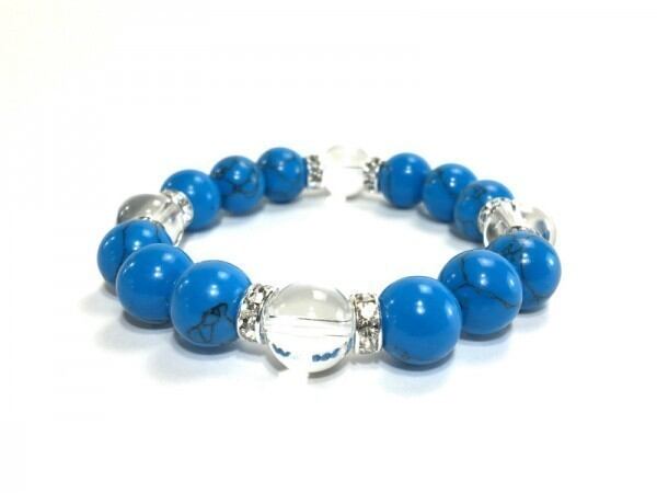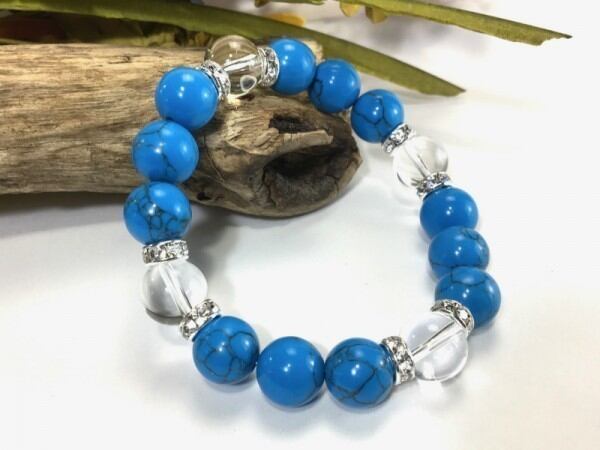 こちらは、12mm玉のターコイズと水晶を使用したブレスレットです。石との間にはロンデルを挟み高級感を演出しています。シンプルなデザインですのでどんなコーディネートとも合わせ易いブレスレットです。石大きさは12mm玉です。内周約18cmです。気になる方は是非この機会にどうぞ。