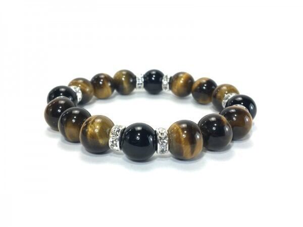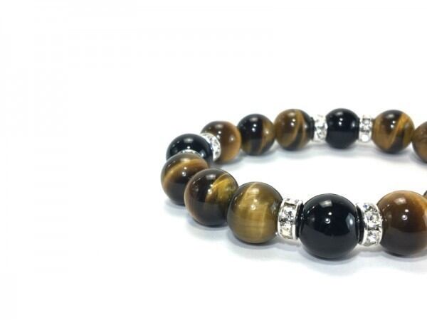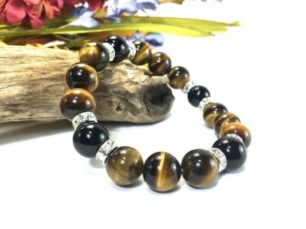こちらは、12mm玉のタイガーアイとオニキスを使用した天然石ブレスレットです。石との間にはロンデルを挟み高級感を演出しています。シンプルなデザインですのでどんなコーディネートとも合わせ易いブレスレットです。石大きさは12mm玉です。内周約18cmです。気になる方は是非この機会にどうぞ。