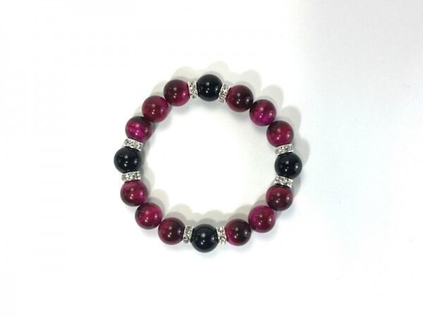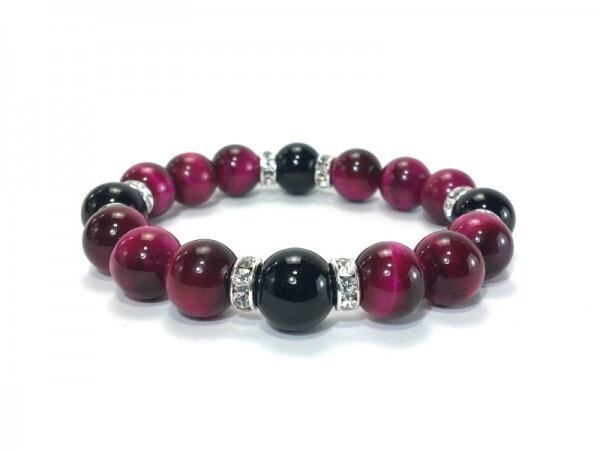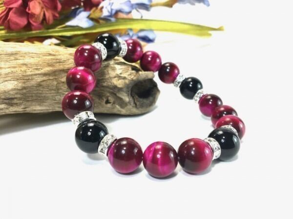 こちらは、12mm玉のピンクタイガーアイとオニキスを使用した天然石ブレスレットです。石との間にはロンデルを挟み高級感を演出しています。シンプルなデザインですのでどんなコーディネートとも合わせ易いブレスレットです。石大きさは12mm玉です。内周約18cmです。気になる方は是非この機会にどうぞ。