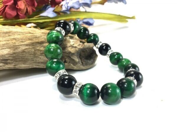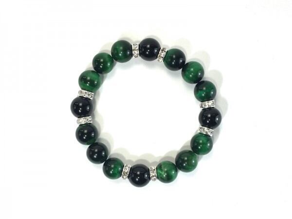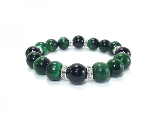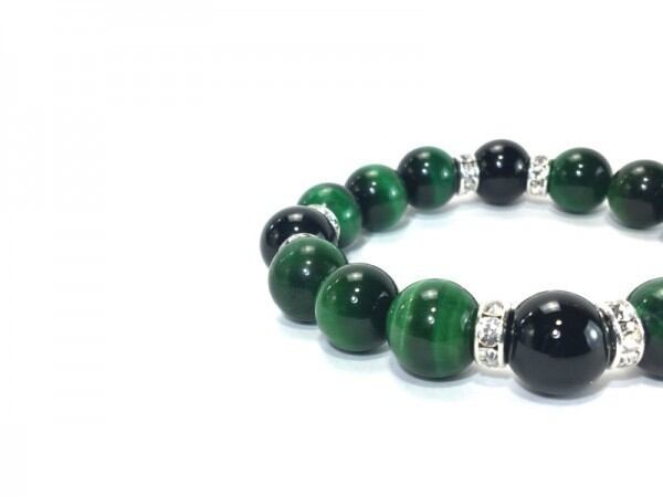 こちらは、12mm玉のグリーンタイガーアイとオニキスを使用した天然石ブレスレットです。石との間にはロンデルを挟み高級感を演出しています。シンプルなデザインですのでどんなコーディネートとも合わせ易いブレスレットです。石大きさは12mm玉です。内周約18cmです。気になる方は是非この機会にどうぞ。