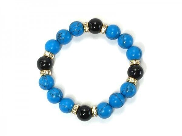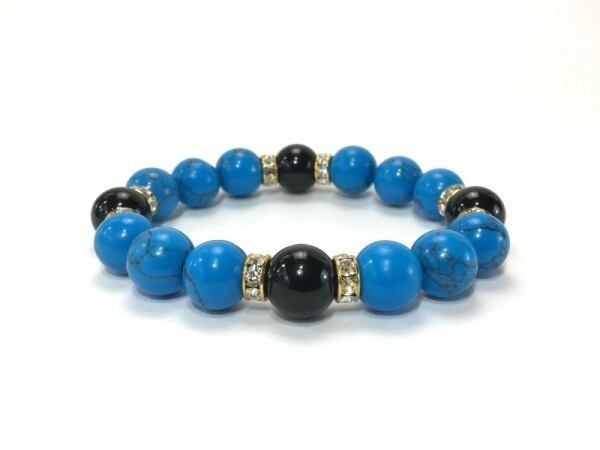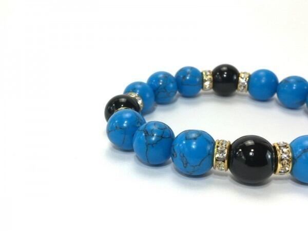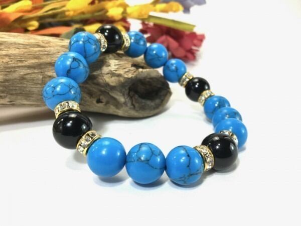 こちらは、12mm玉のターコイズとオニキスを使用したブレスレットです。石との間にはロンデルを挟み高級感を演出しています。シンプルなデザインですのでどんなコーディネートとも合わせ易いブレスレットです。石大きさは12mm玉です。内周約18cmです。気になる方は是非この機会にどうぞ。