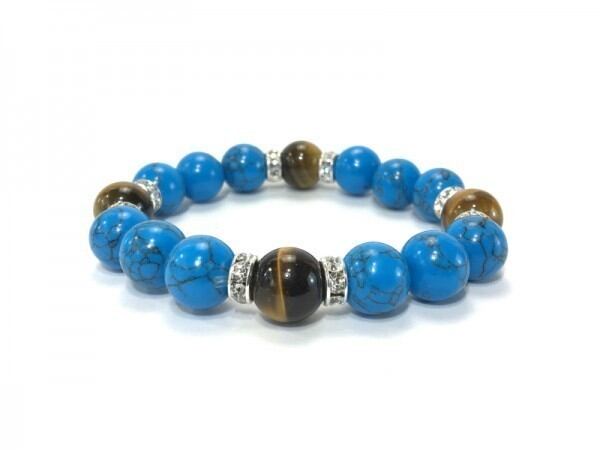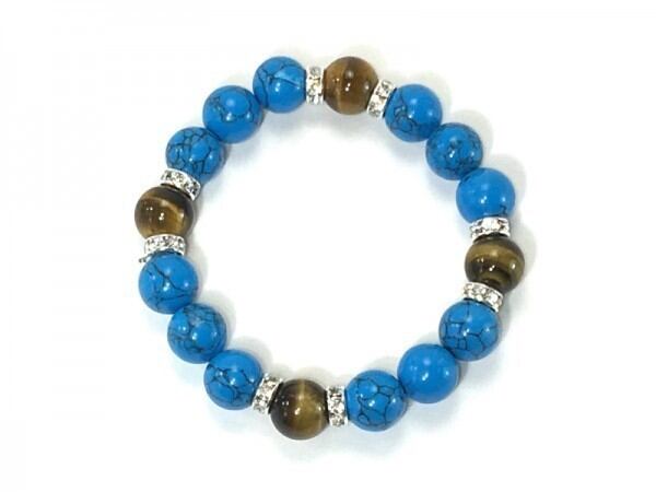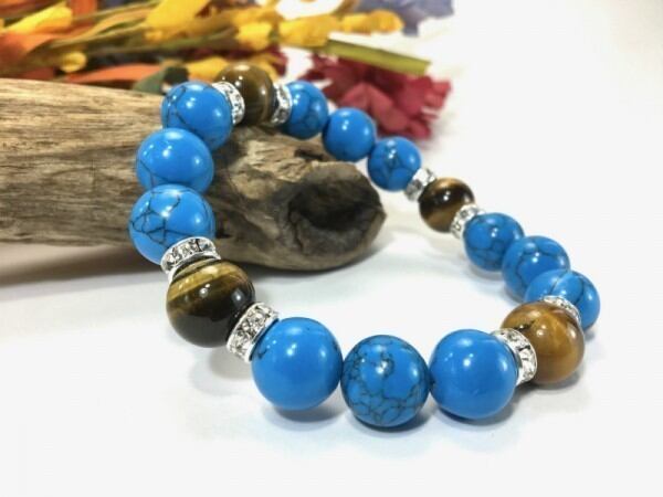 こちらは、12mm玉のターコイズとタイガーアイを使用したブレスレットです。石との間にはロンデルを挟み高級感を演出しています。シンプルなデザインですのでどんなコーディネートとも合わせ易いブレスレットです。石大きさは12mm玉です。内周約18cmです。気になる方は是非この機会にどうぞ。