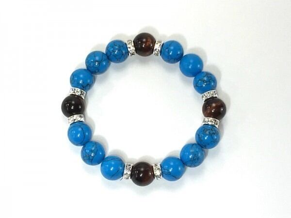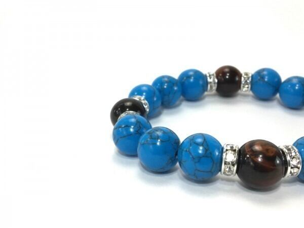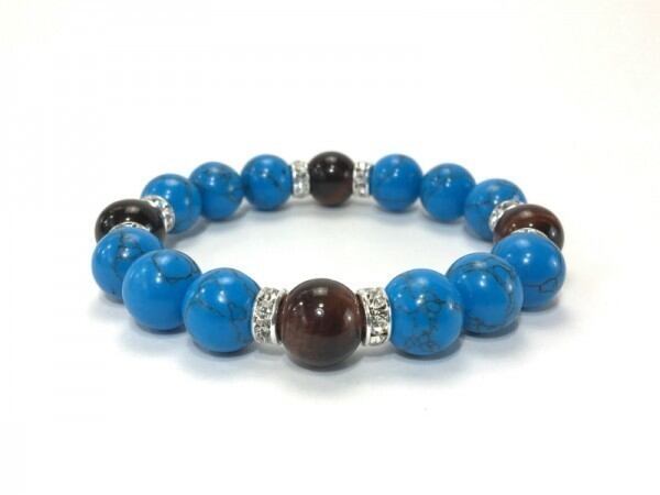 こちらは、12mm玉のターコイズとレッドタイガーアイを使用したブレスレットです。石との間にはロンデルを挟み高級感を演出しています。シンプルなデザインですのでどんなコーディネートとも合わせ易いブレスレットです。石大きさは12mm玉です。内周約18cmです。気になる方は是非この機会にどうぞ。