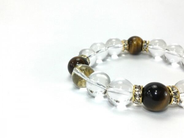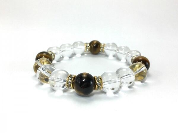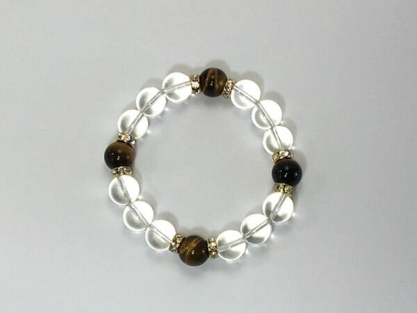 こちらは、12mm玉の水晶とタイガーアイを使用した天然石ブレスレットです。石との間にはロンデルを挟み高級感を演出しています。シンプルなデザインですのでどんなコーディネートとも合わせ易いブレスレットです。石大きさは12mm玉です。内周約18cmです。気になる方は是非この機会にどうぞ。