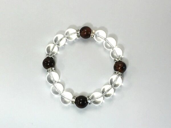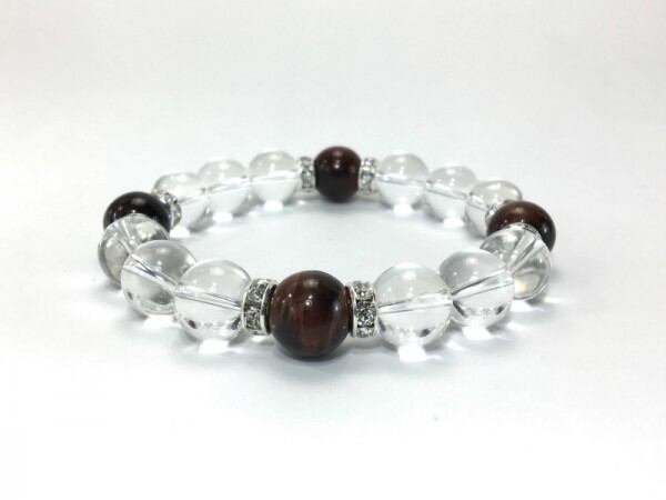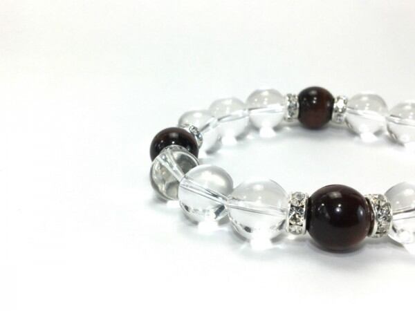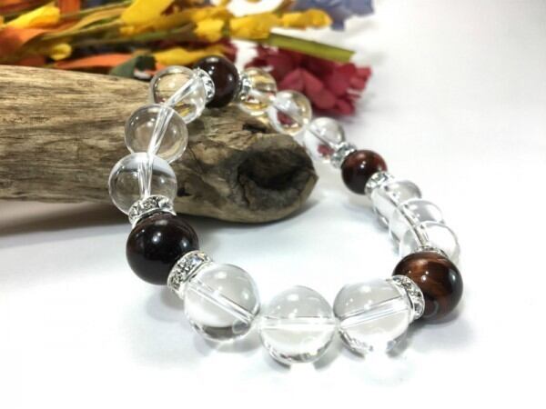 こちらは、12mm玉の水晶とレッドタイガーアイを使用した天然石ブレスレットです。石との間にはロンデルを挟み高級感を演出しています。シンプルなデザインですのでどんなコーディネートとも合わせ易いブレスレットです。石大きさは12mm玉です。内周約18cmです。気になる方は是非この機会にどうぞ。