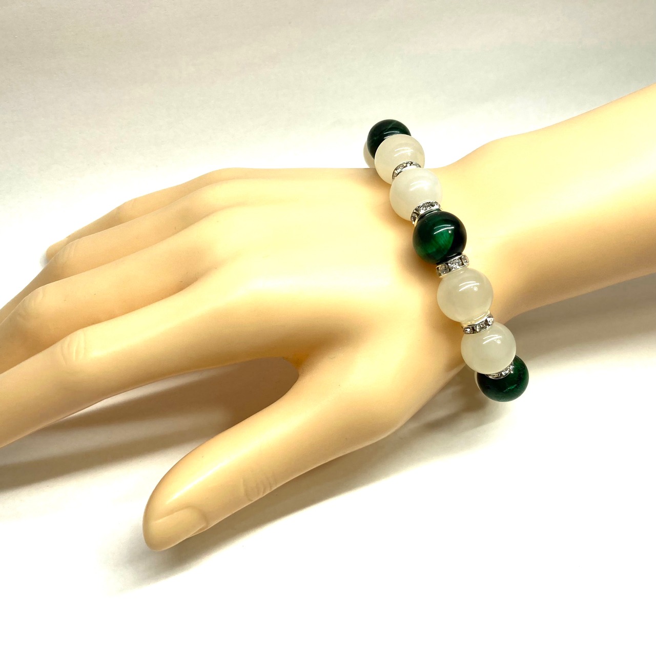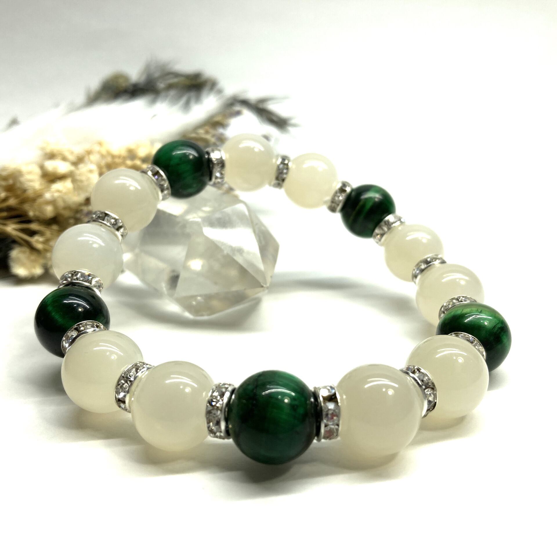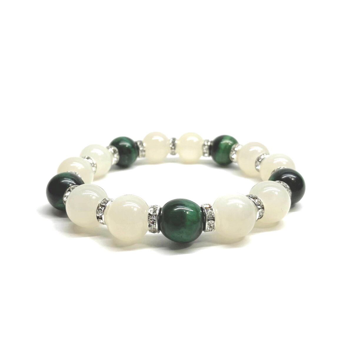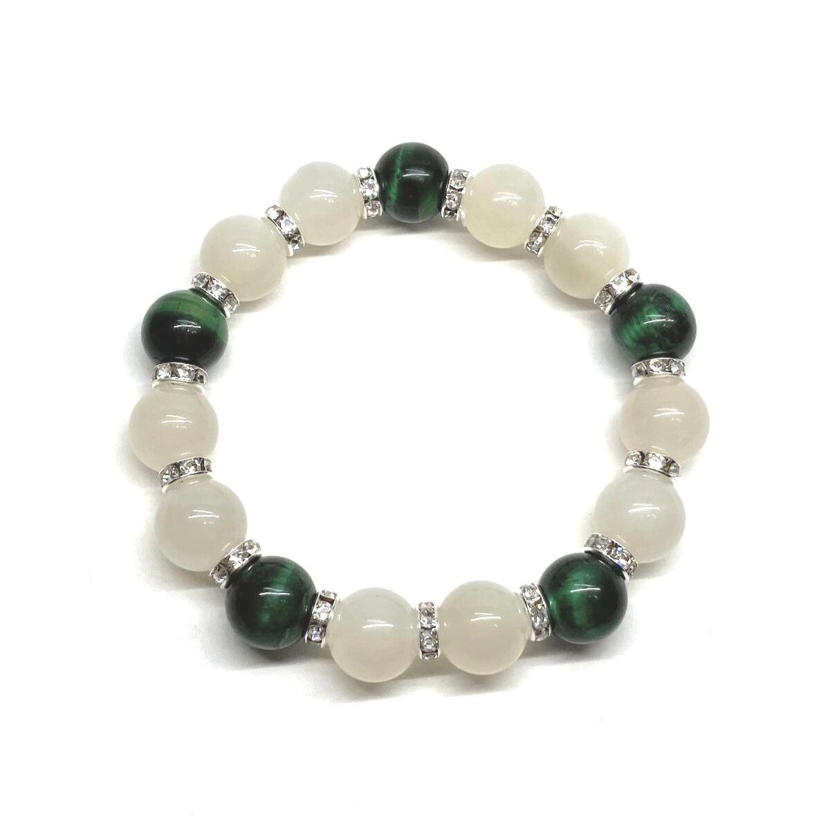 こちらは、ムーンストーンとブルータイガーアイを組み合わせたパワーストーンブレスレットです。間にはロンデルを挟み高級感あるデザインに仕上げております。石大きさは12mm玉を使用して内周 約18cmです。気になる方は是非この機会にどうぞ。