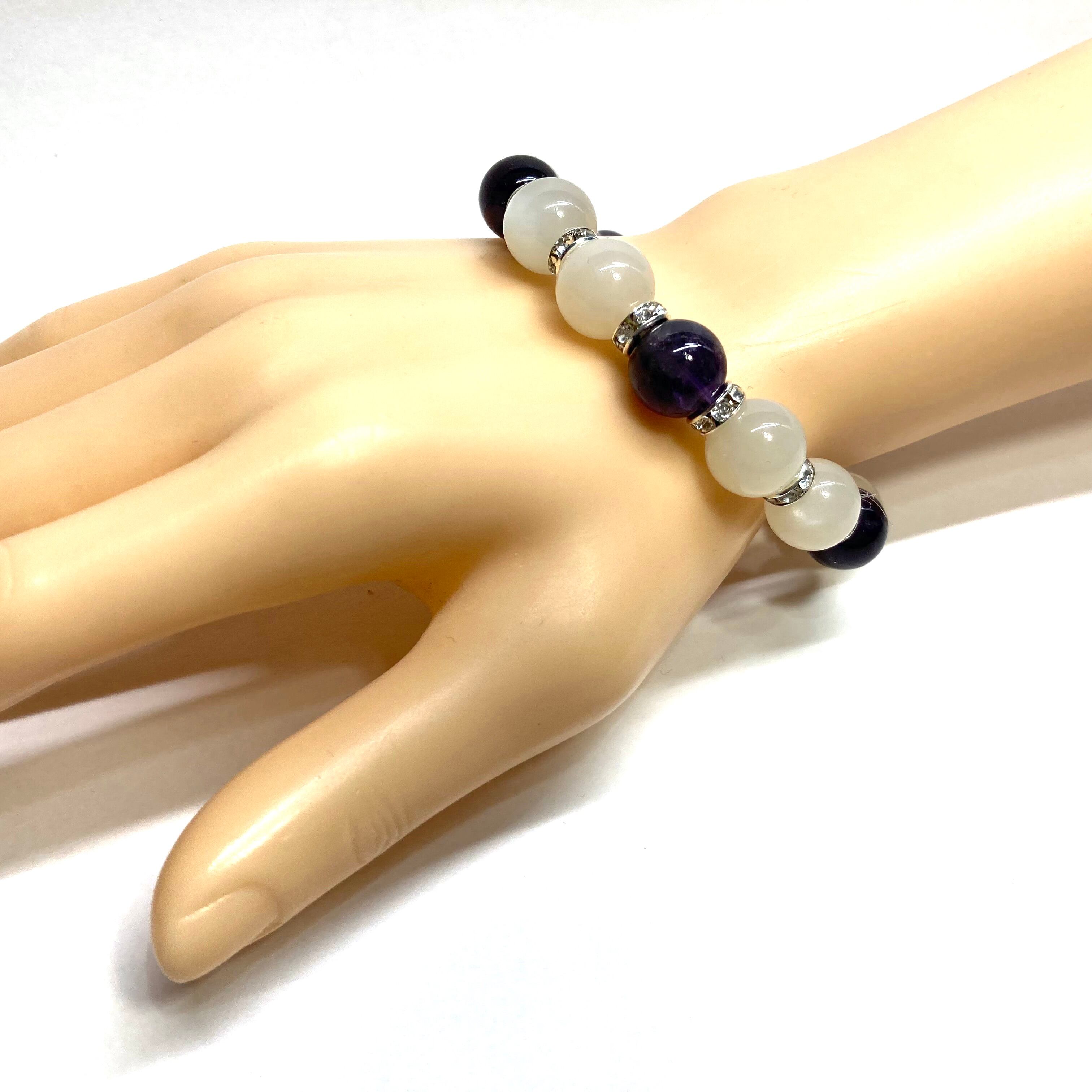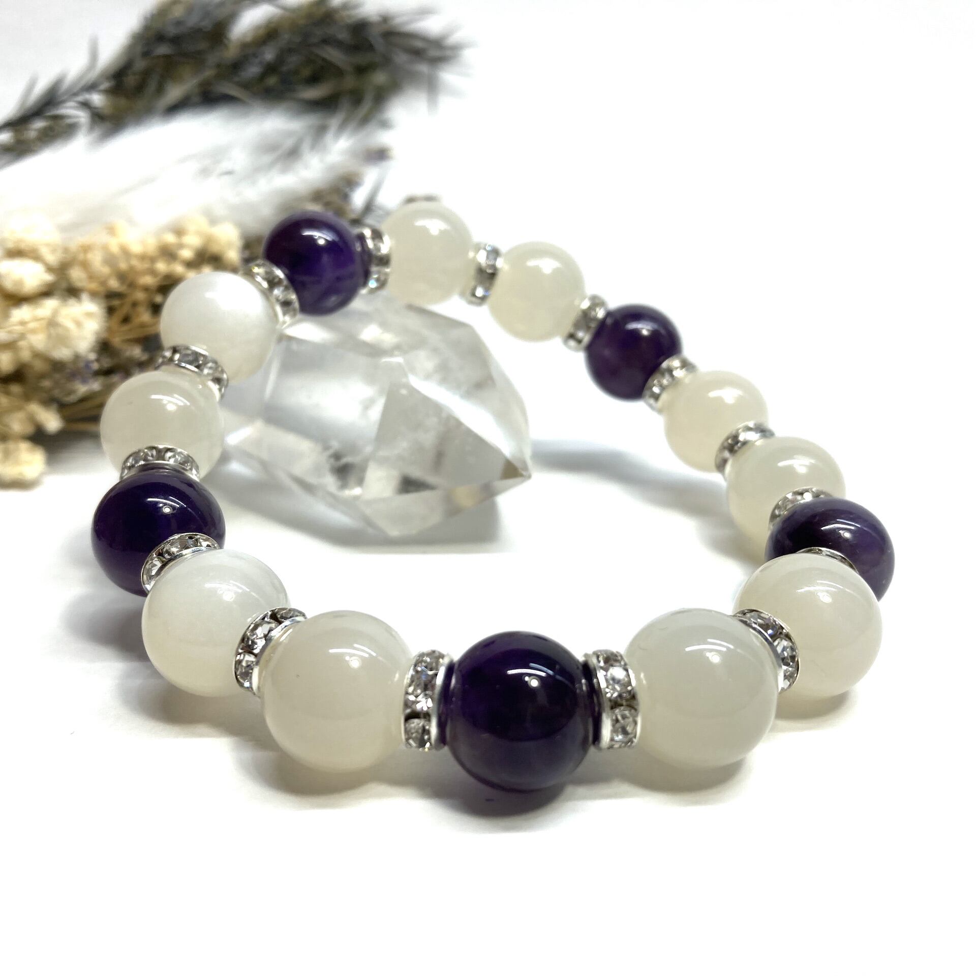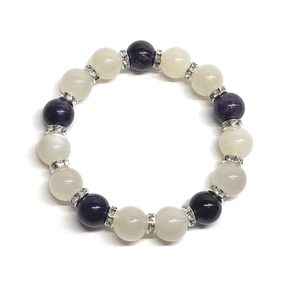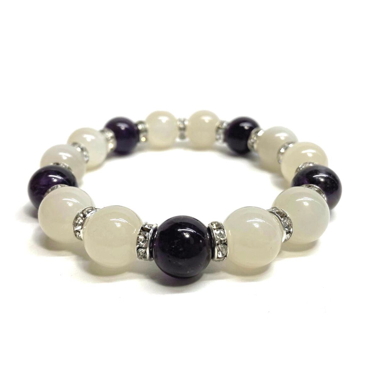 こちらは、ムーンストーンとアメジストを組み合わせたパワーストーンブレスレットです。間にはロンデルを挟み高級感あるデザインに仕上げております。石大きさは12mm玉を使用して内周 約18cmです。気になる方は是非この機会にどうぞ。