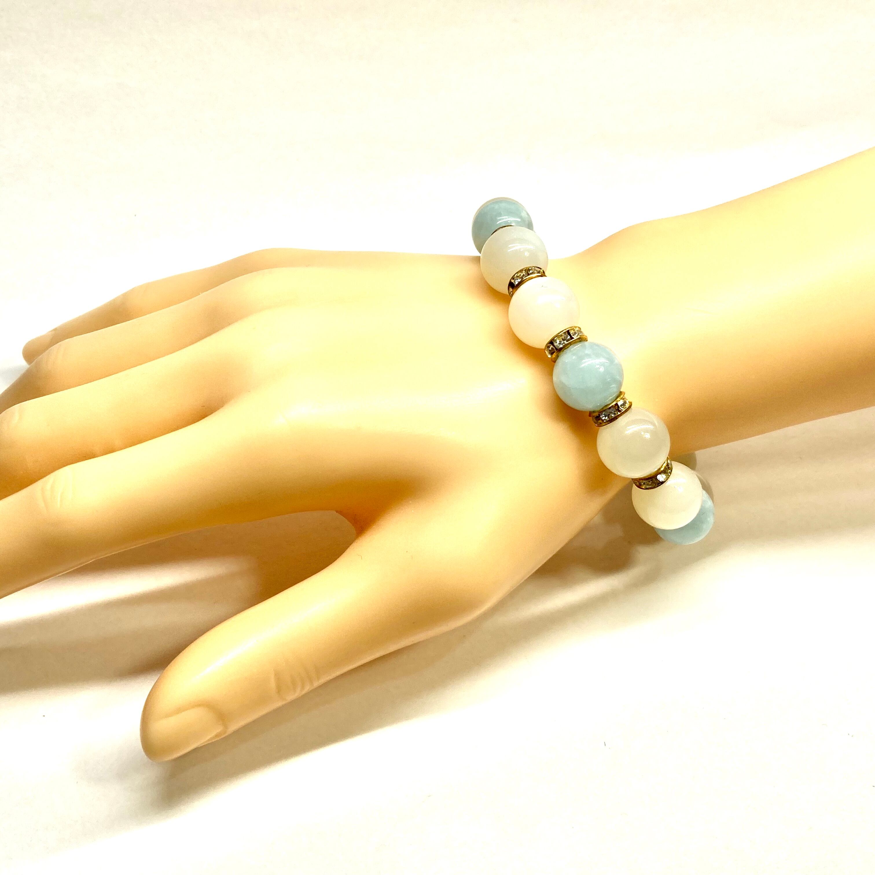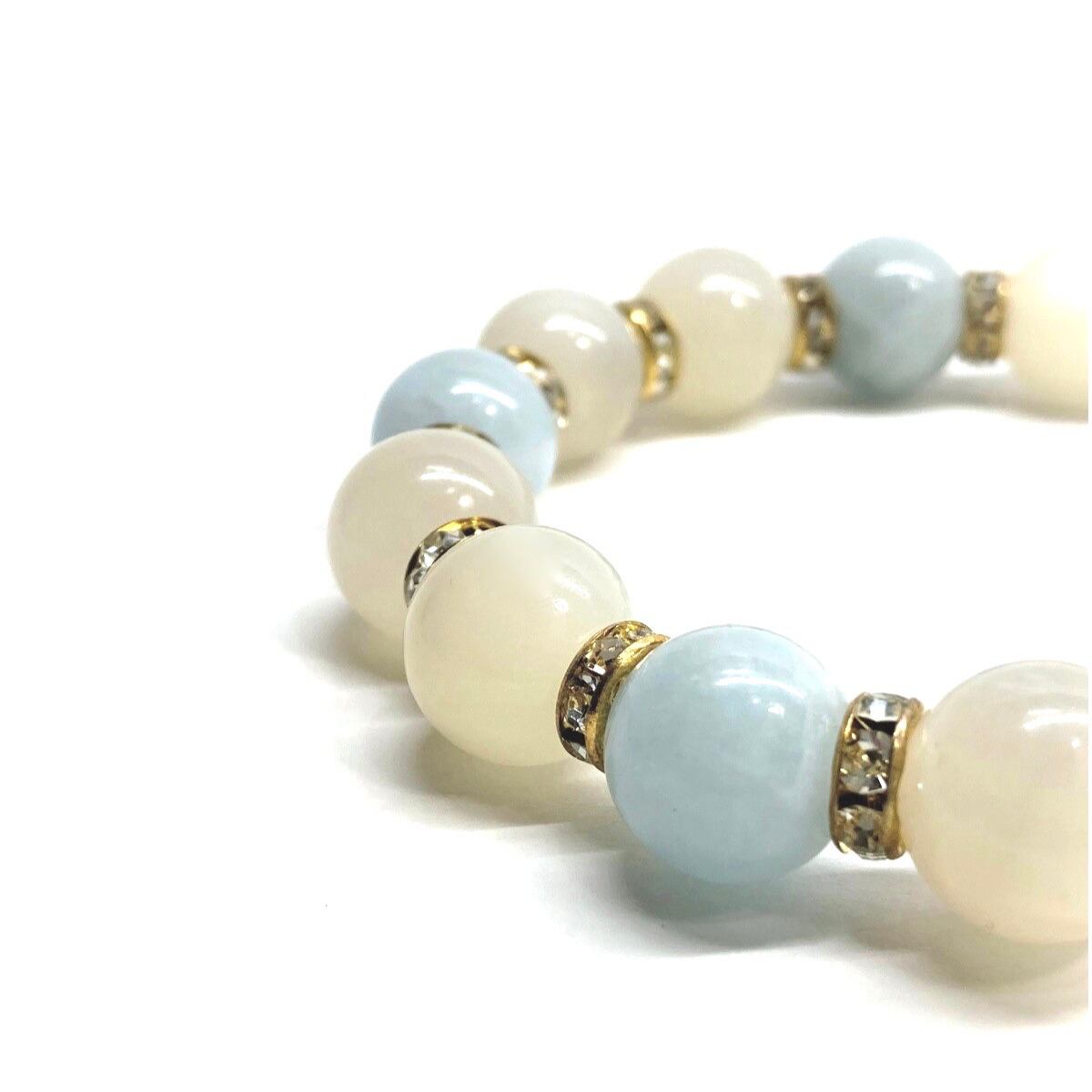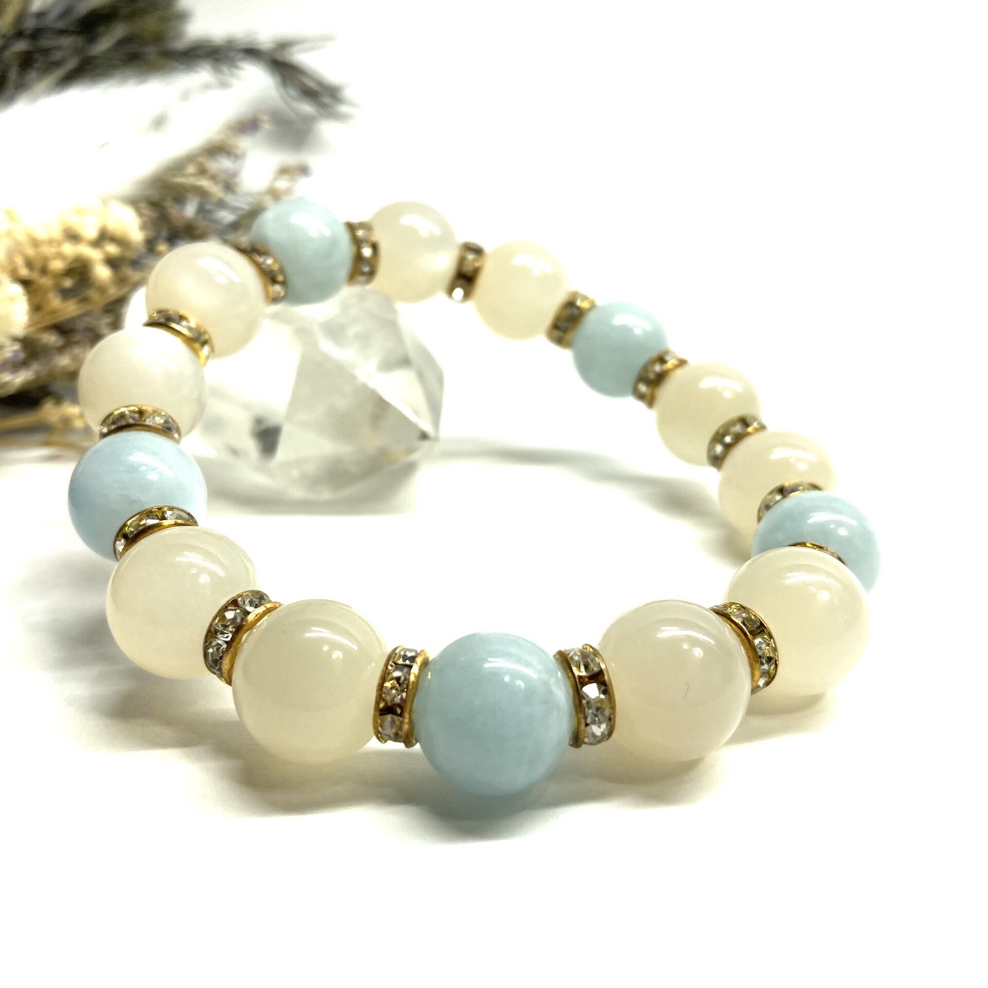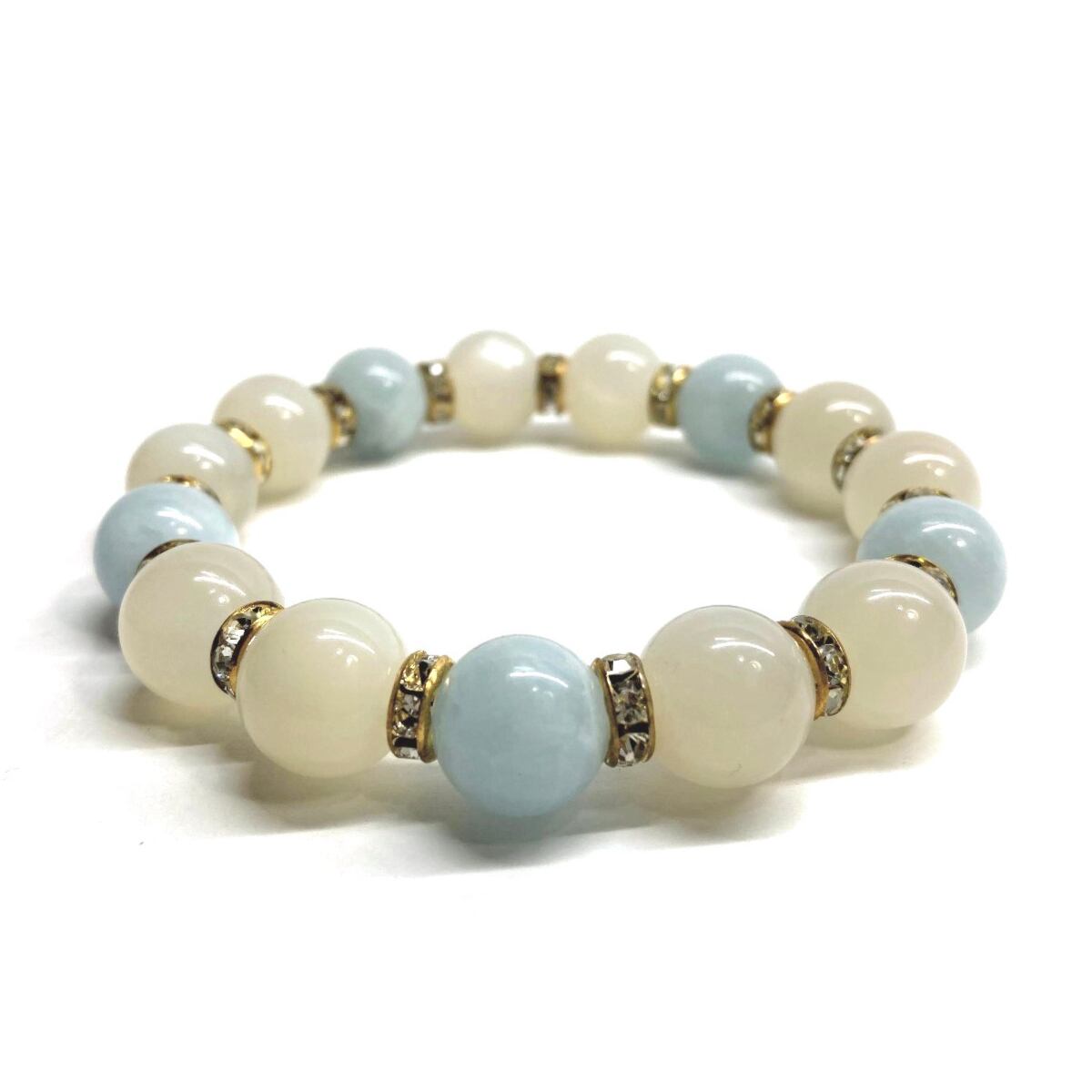 こちらは、ムーンストーンとアクアマリンを組み合わせたパワーストーンブレスレットです。間にはロンデルを挟み高級感あるデザインに仕上げております。石大きさは12mm玉を使用して内周 約18cmです。気になる方は是非この機会にどうぞ。