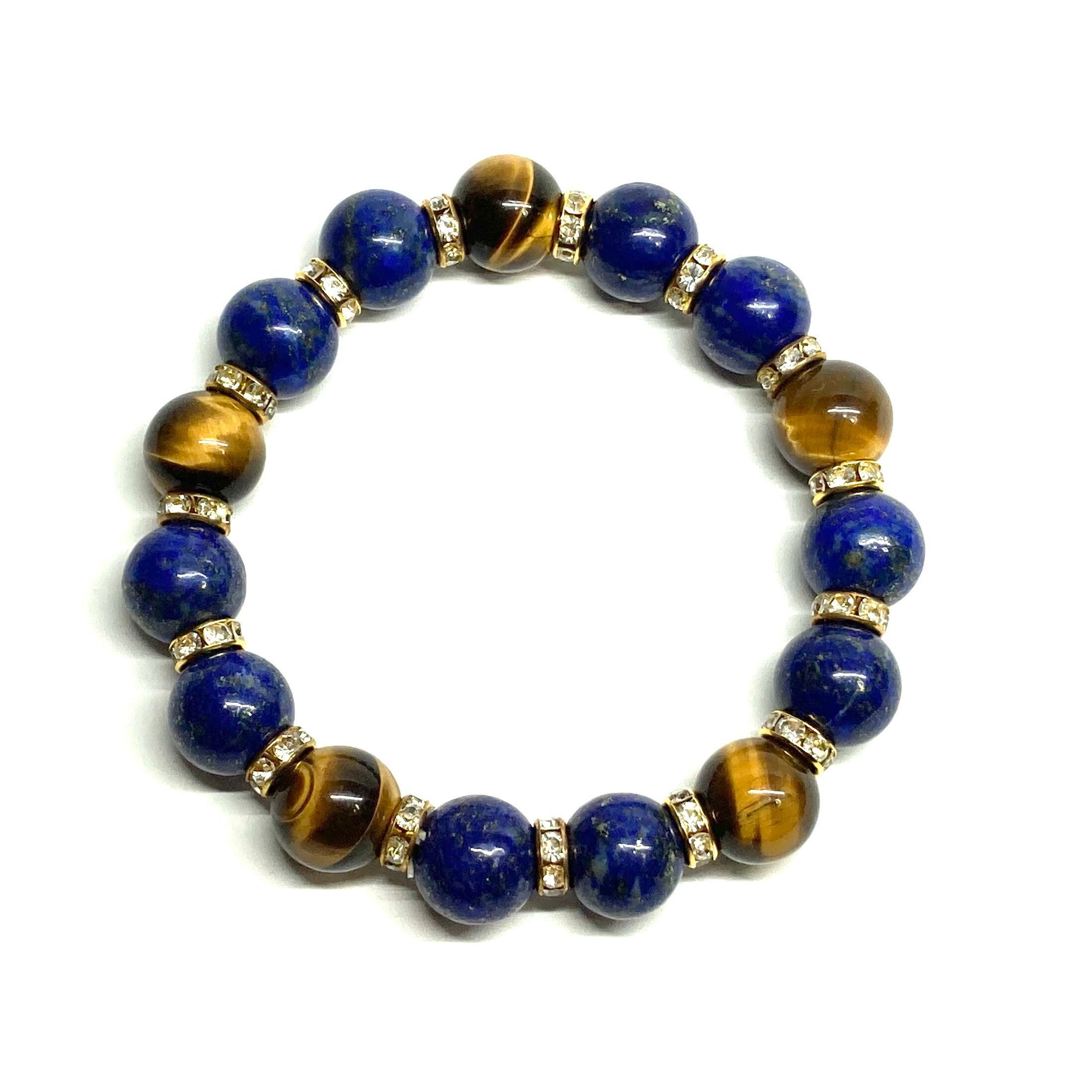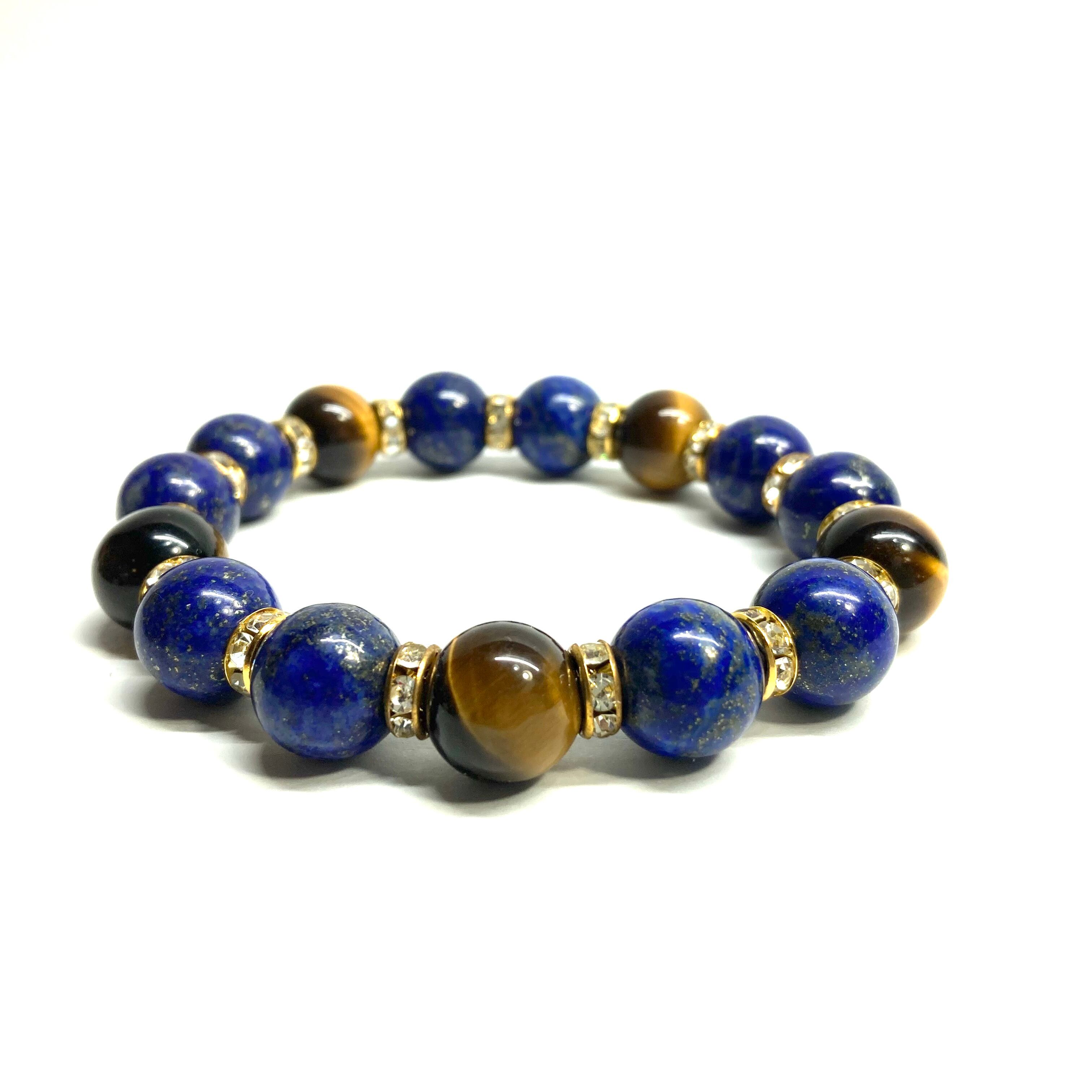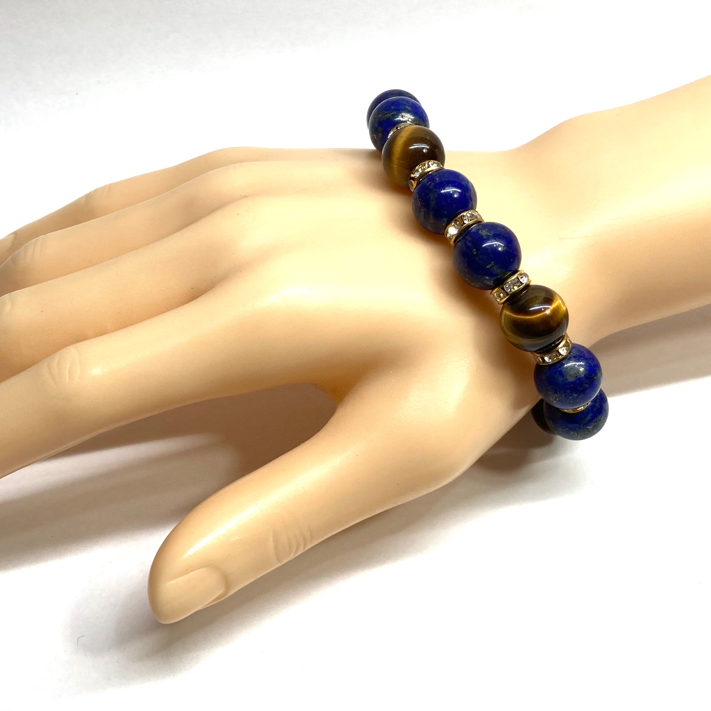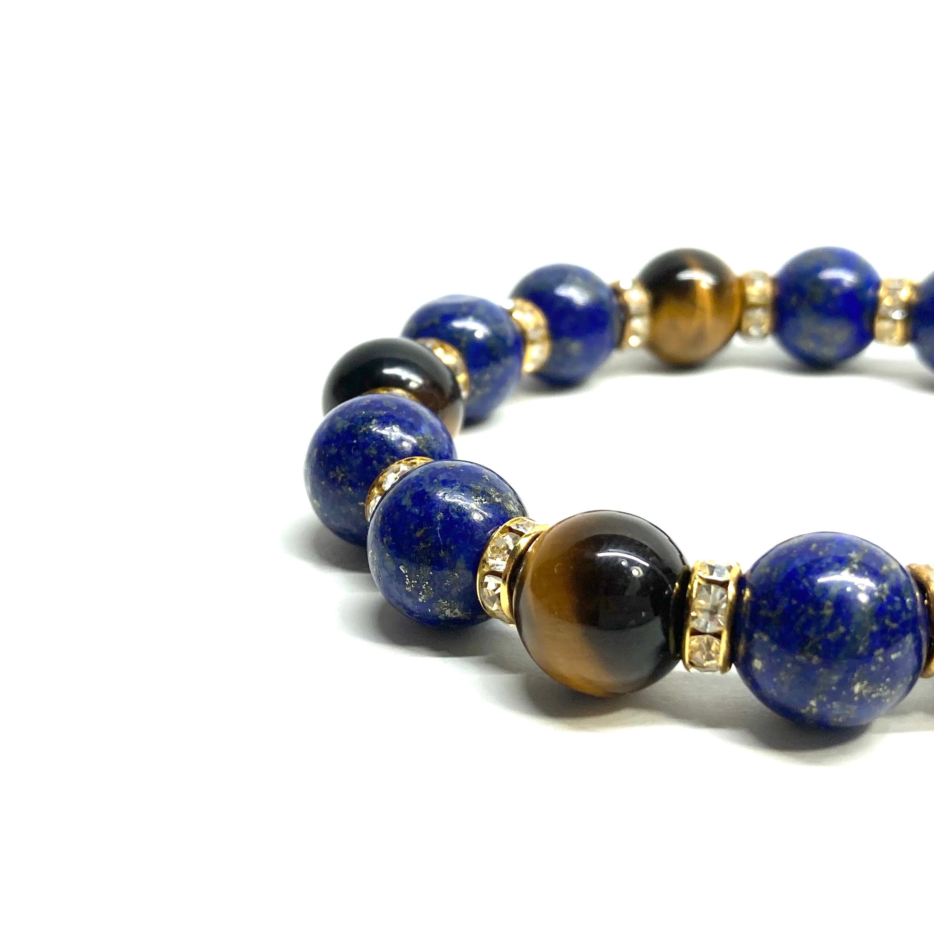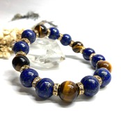 こちらは、ラピスラズリとタイガーアイを組み合わせたパワーストーンブレスレットです。間にはロンデルを挟み高級感あるデザインに仕上げております。石大きさは12mm玉を使用して内周 約18cmです。気になる方は是非この機会にどうぞ。