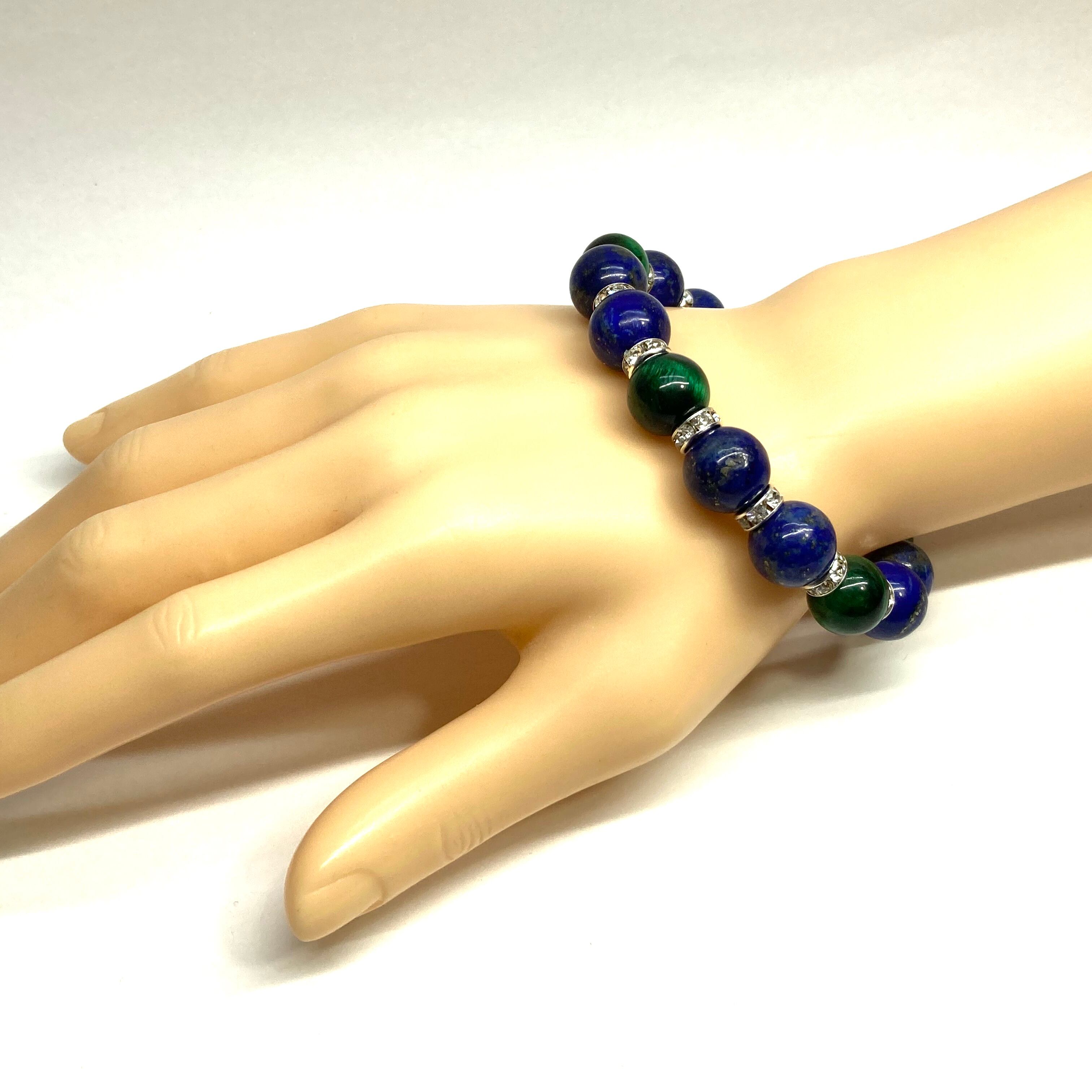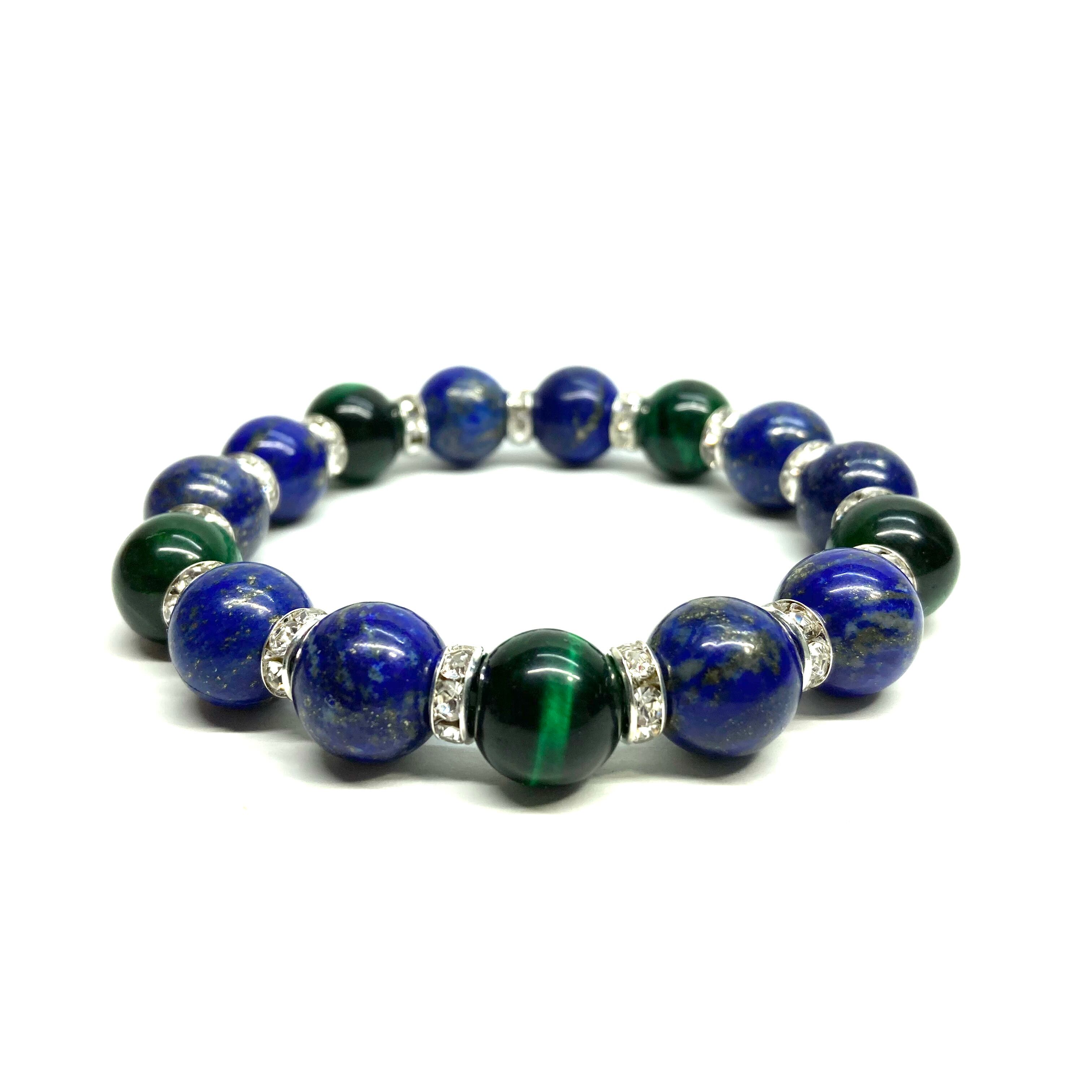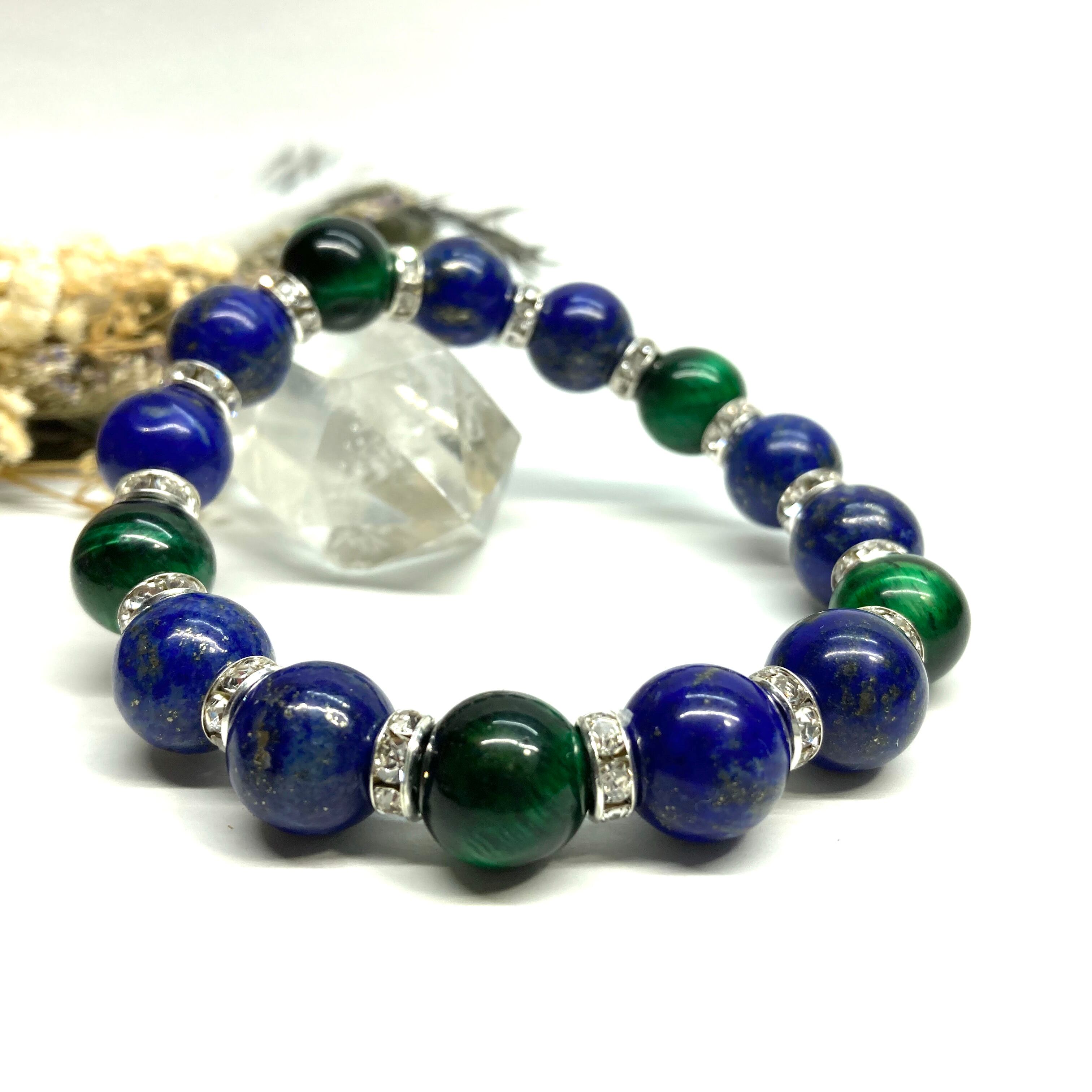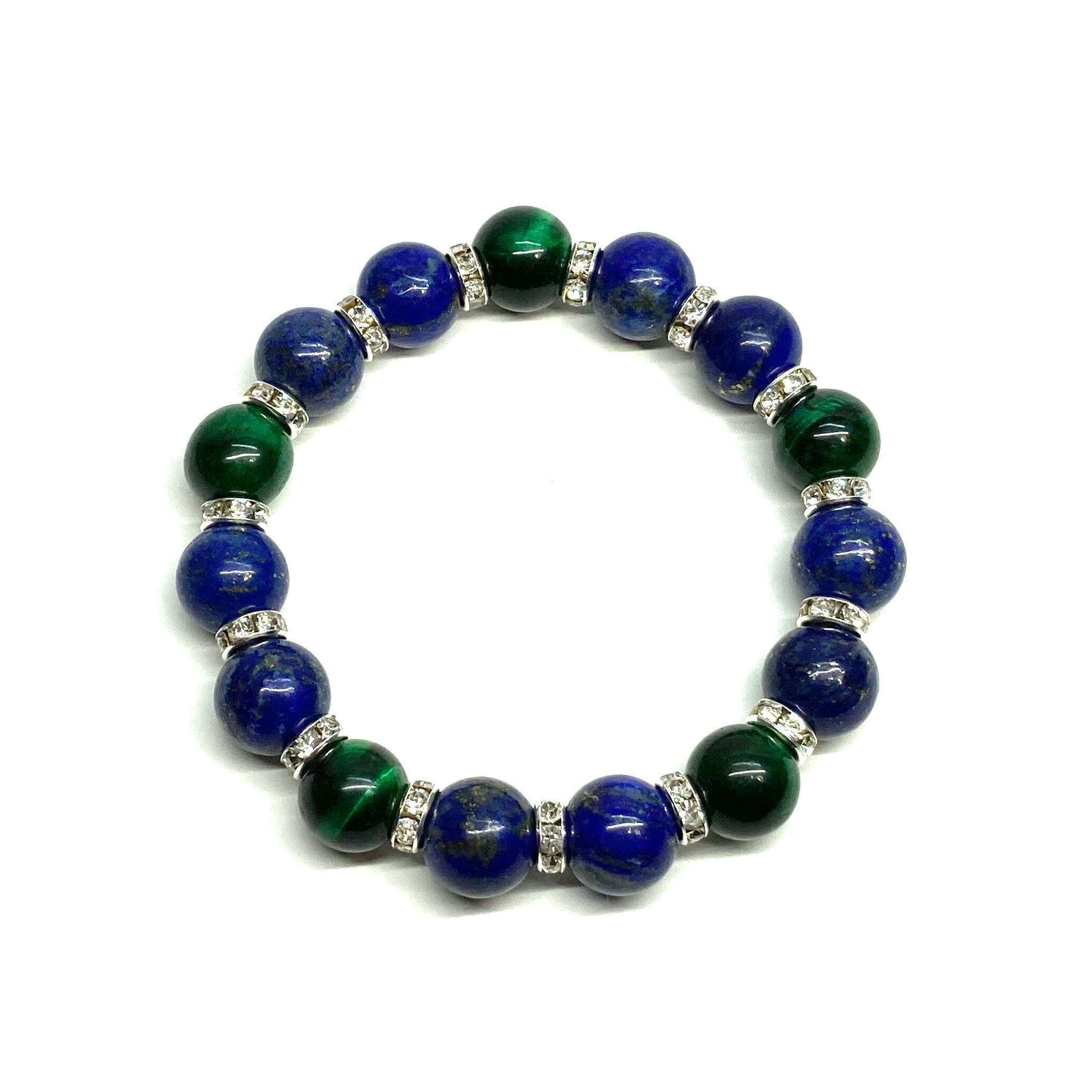 こちらは、ラピスラズリとブルータイガーアイを組み合わせたパワーストーンブレスレットです。間にはロンデルを挟み高級感あるデザインに仕上げております。石大きさは12mm玉を使用して内周 約18cmです。気になる方は是非この機会にどうぞ。