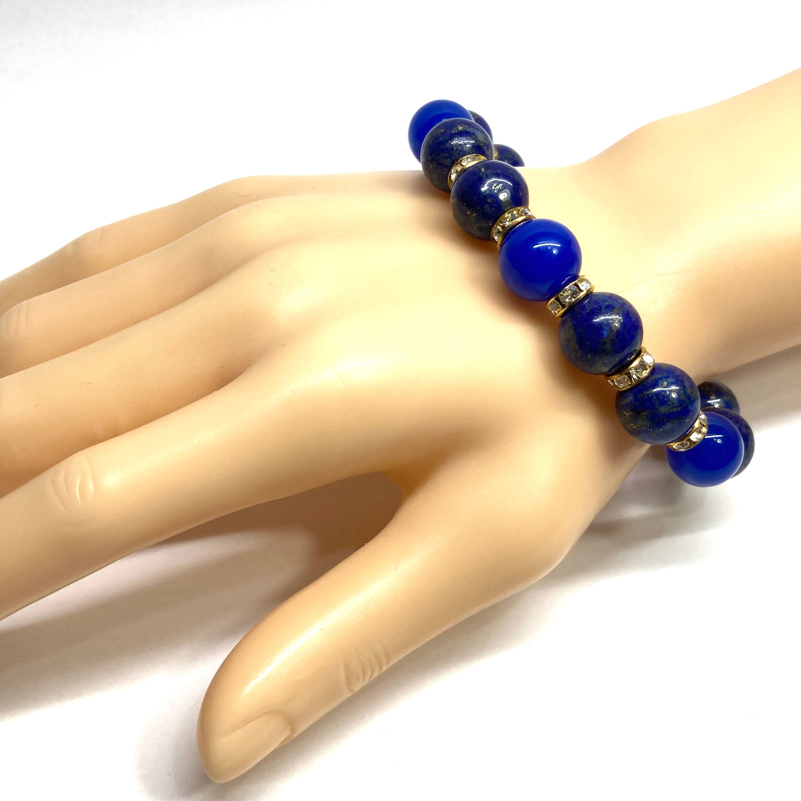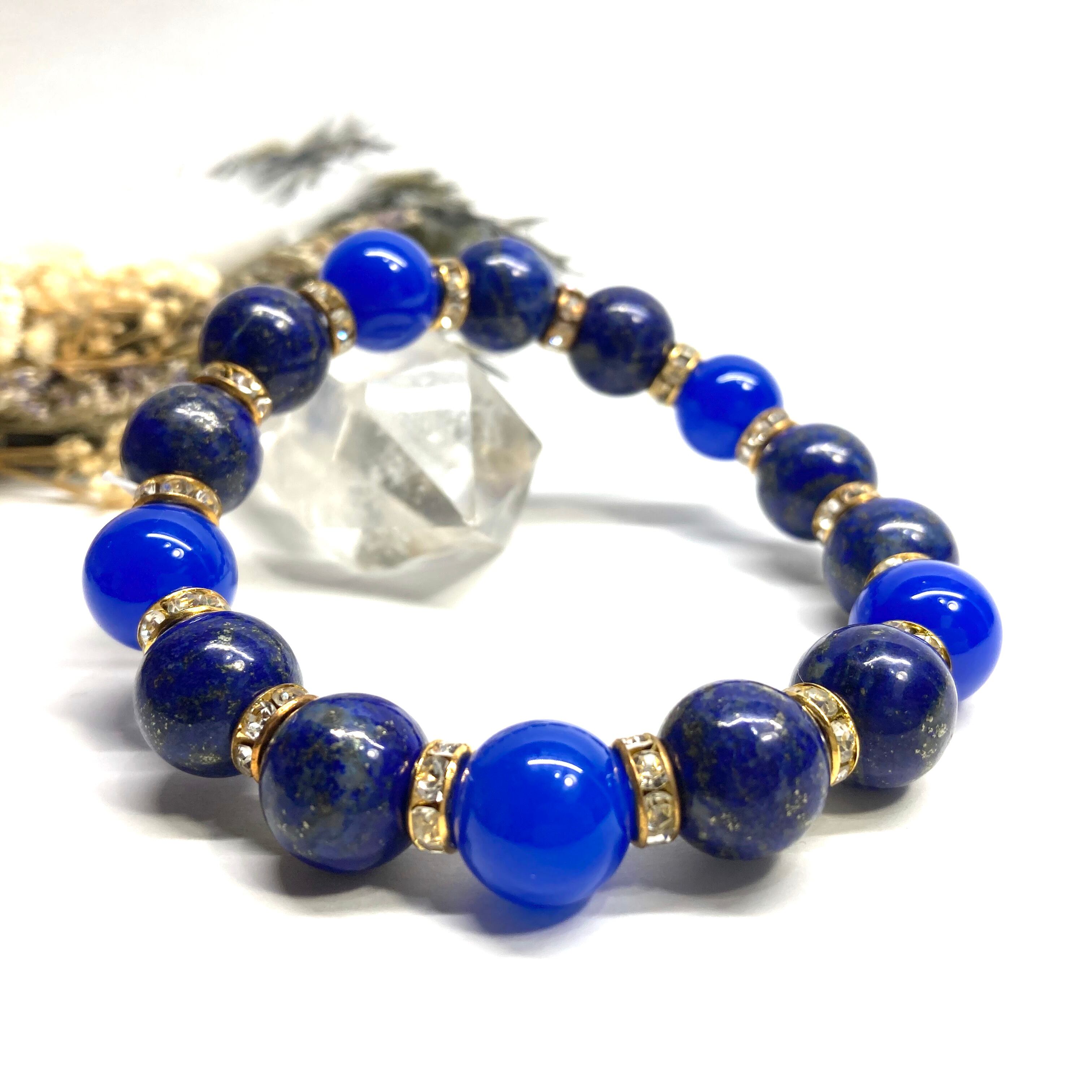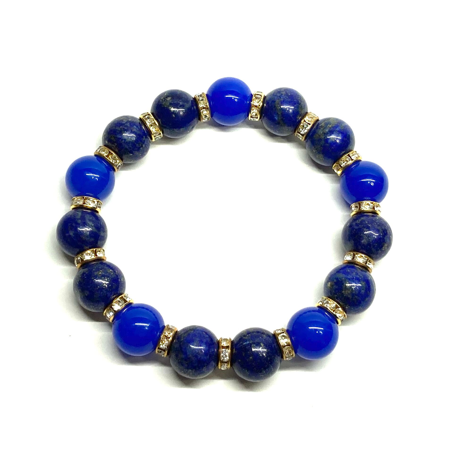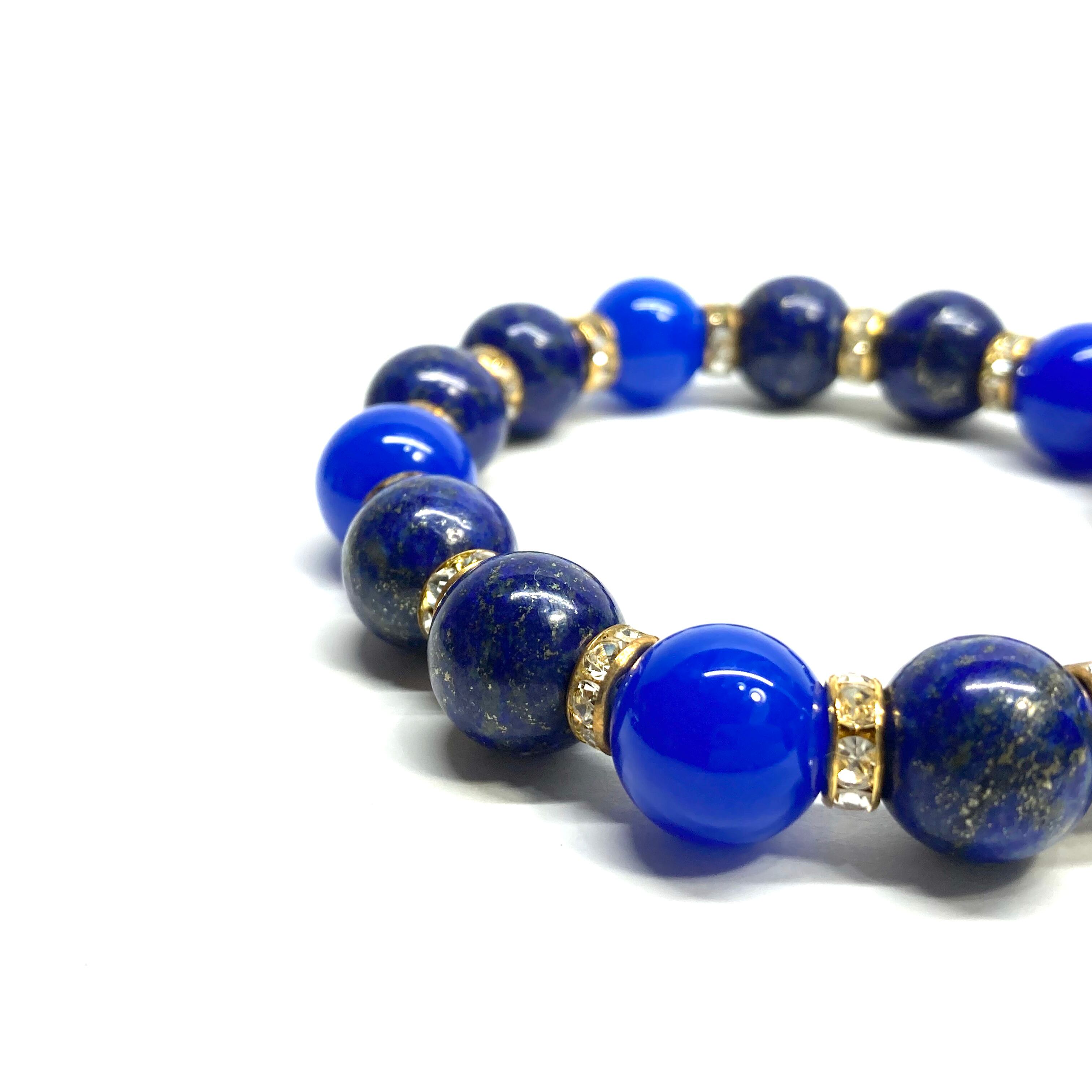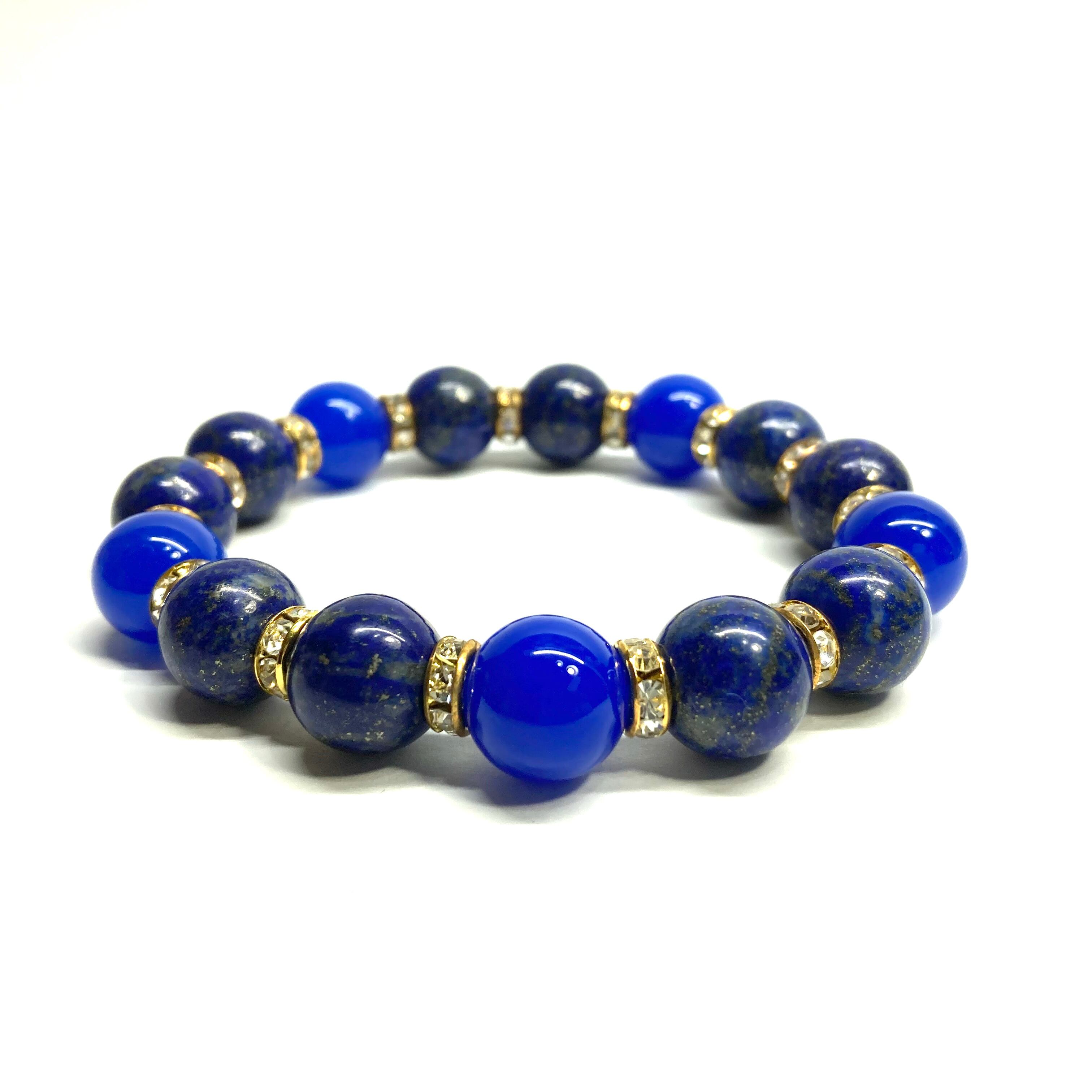 こちらは、ラピスラズリと青瑪瑙を組み合わせたパワーストーンブレスレットです。間にはロンデルを挟み高級感あるデザインに仕上げております。石大きさは12mm玉を使用して内周 約18cmです。気になる方は是非この機会にどうぞ。